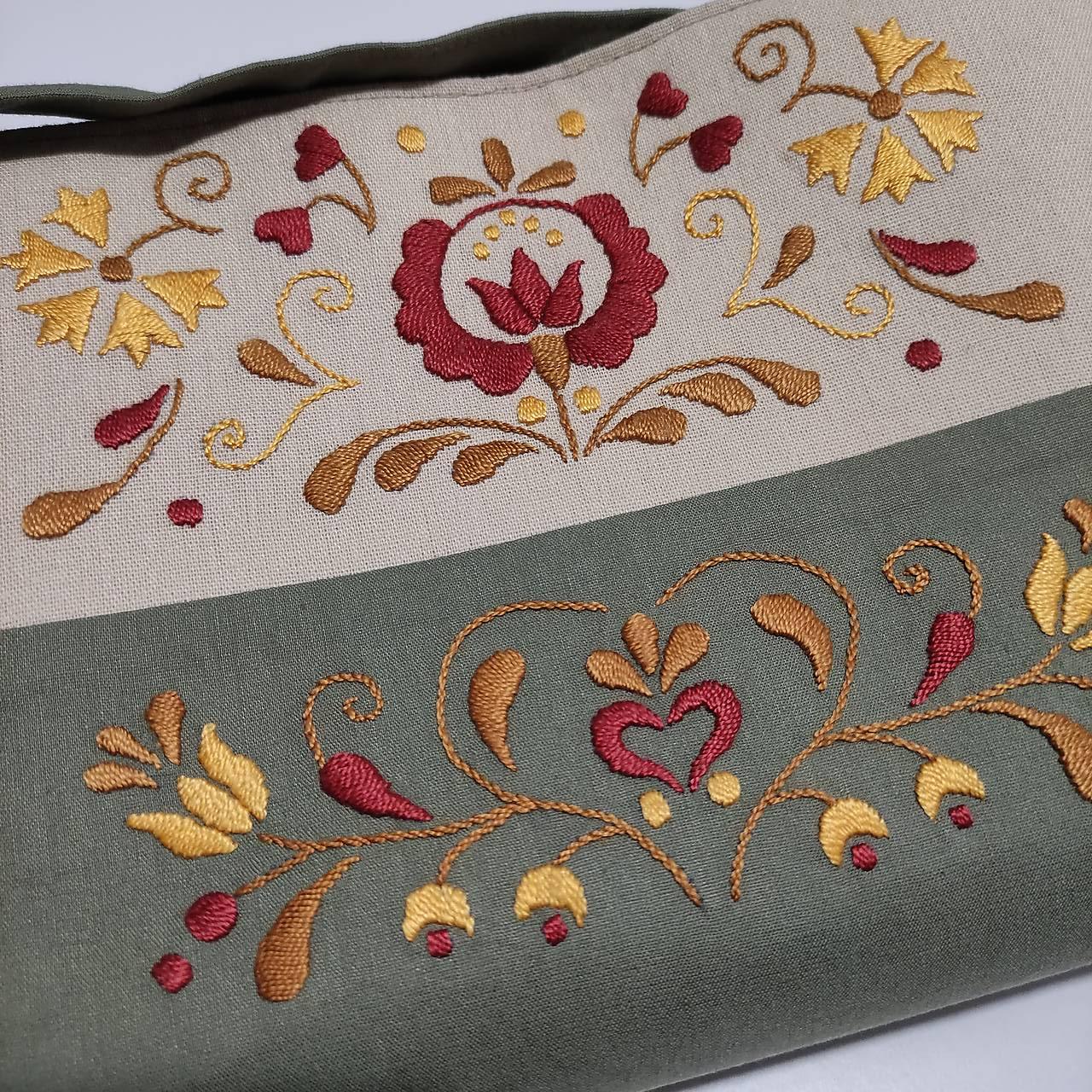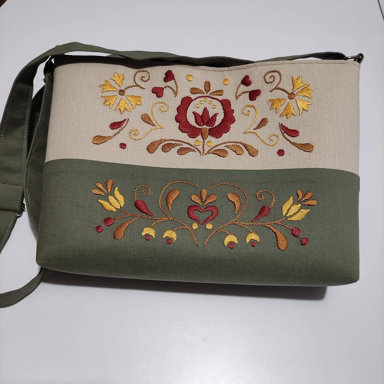Ručne vyšívaná kabelka je ušitá z ľanovej látky. Jej rozmer je 28x20x6cm(šxvxh)Je vystužená a podšitá. Obsahuje dve vnútorné vrecká. Zapína sa na zips. Pás je 3cm široký , dĺžka je nastaviteľná, max. dĺžka je 137 cm. Objednať sa dá aj vo farbách podľa vlastnej predstavy.