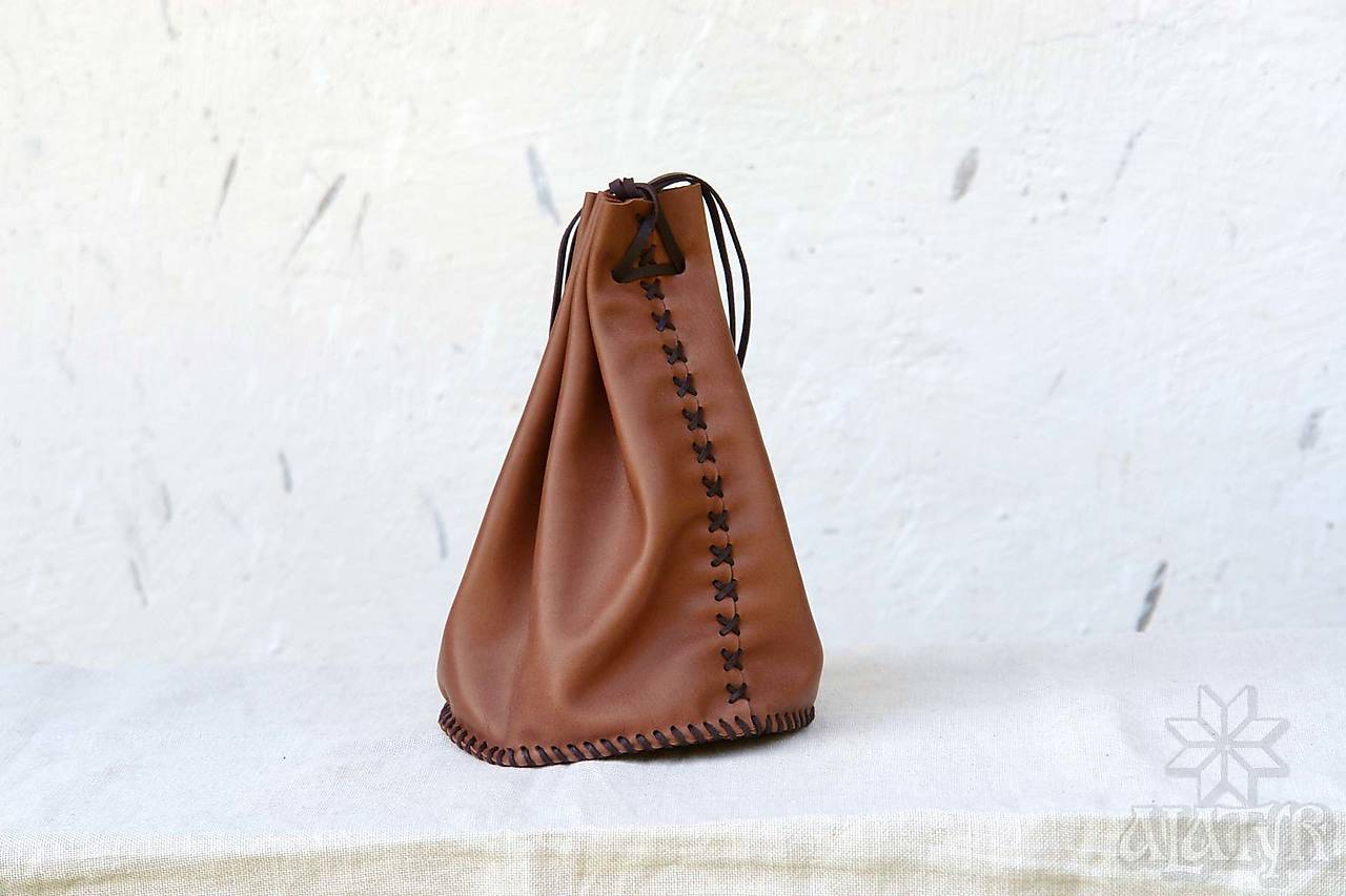 Mešec ušitý z hladkej hovädzej kože v hnedej farbe. Vhodný na mince aj na iné drobnosti a poklady. Zmestí sa doňho najmenej 900 kusov jedno alebo dvojeurových mincí.