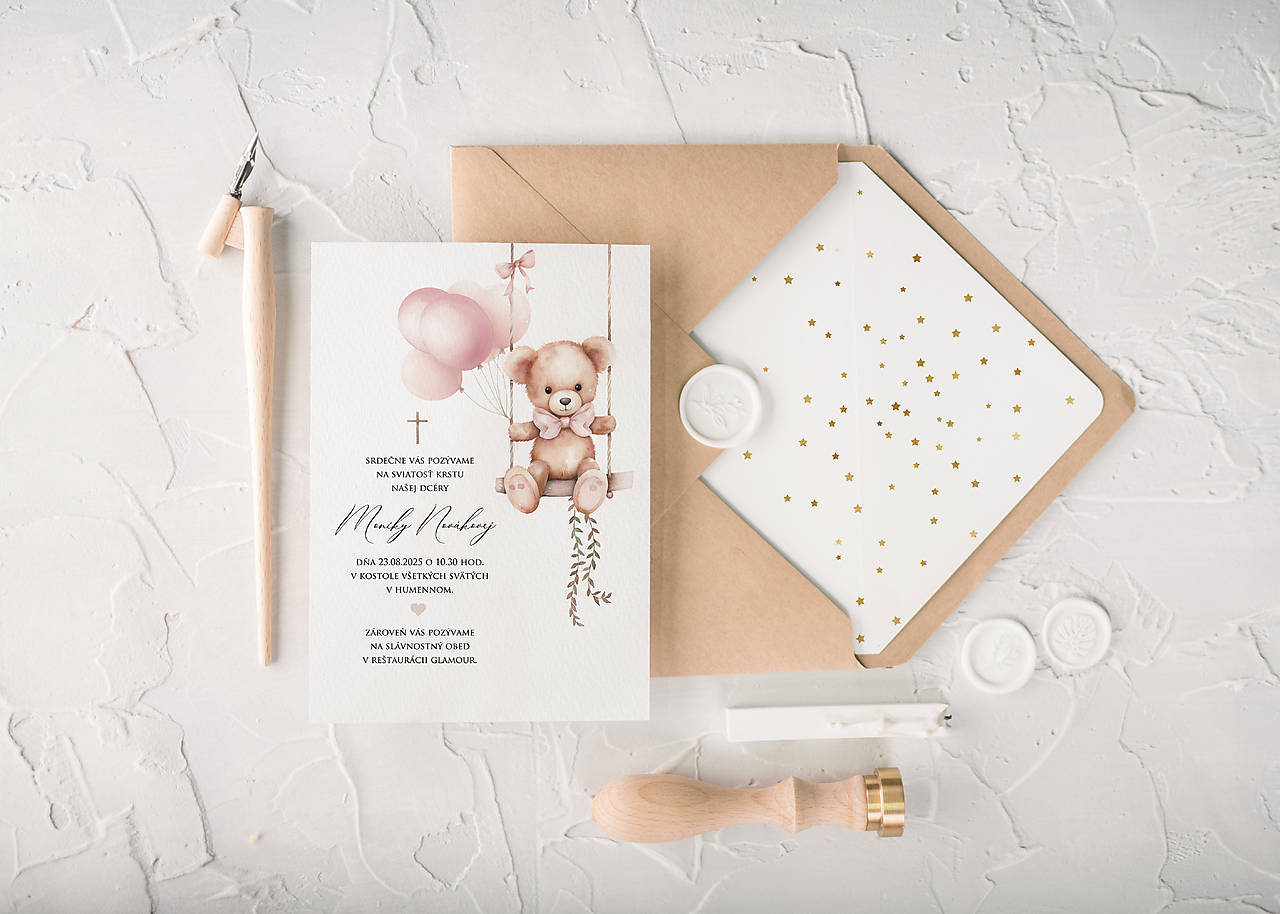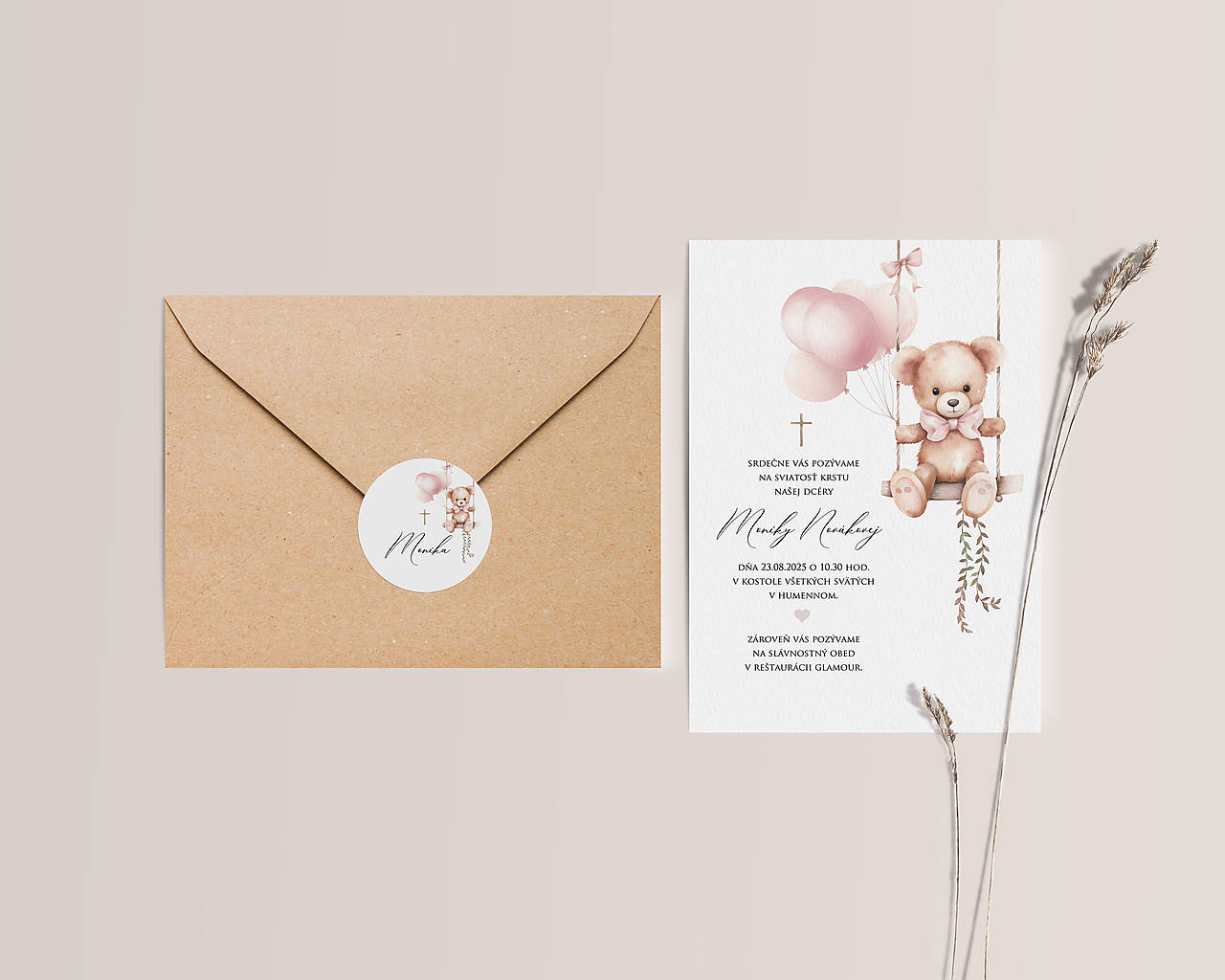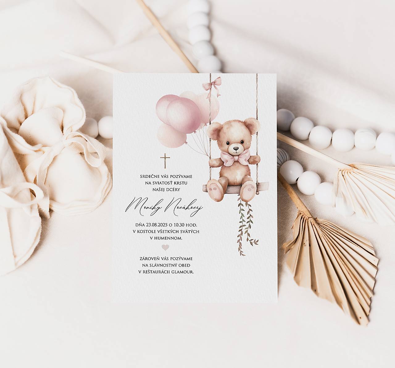 Pozvánka na krst dieťaťa s medvedíkom na hojdačke, balónmi v pastelovej ružovej farbe a jemným krížikom.