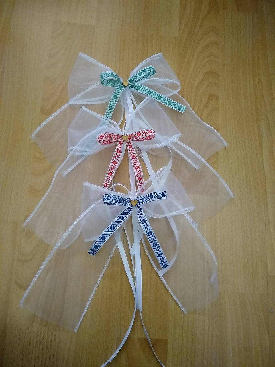 mašle na kľučku auta, spätné zrkadlá-z bielej organzy a folklórnej stuhy zelenej, červenej a modrej, v ponuke aj pierka-viď fotky, do poznámky alebo správy uveďte, o ktoré máte záujem