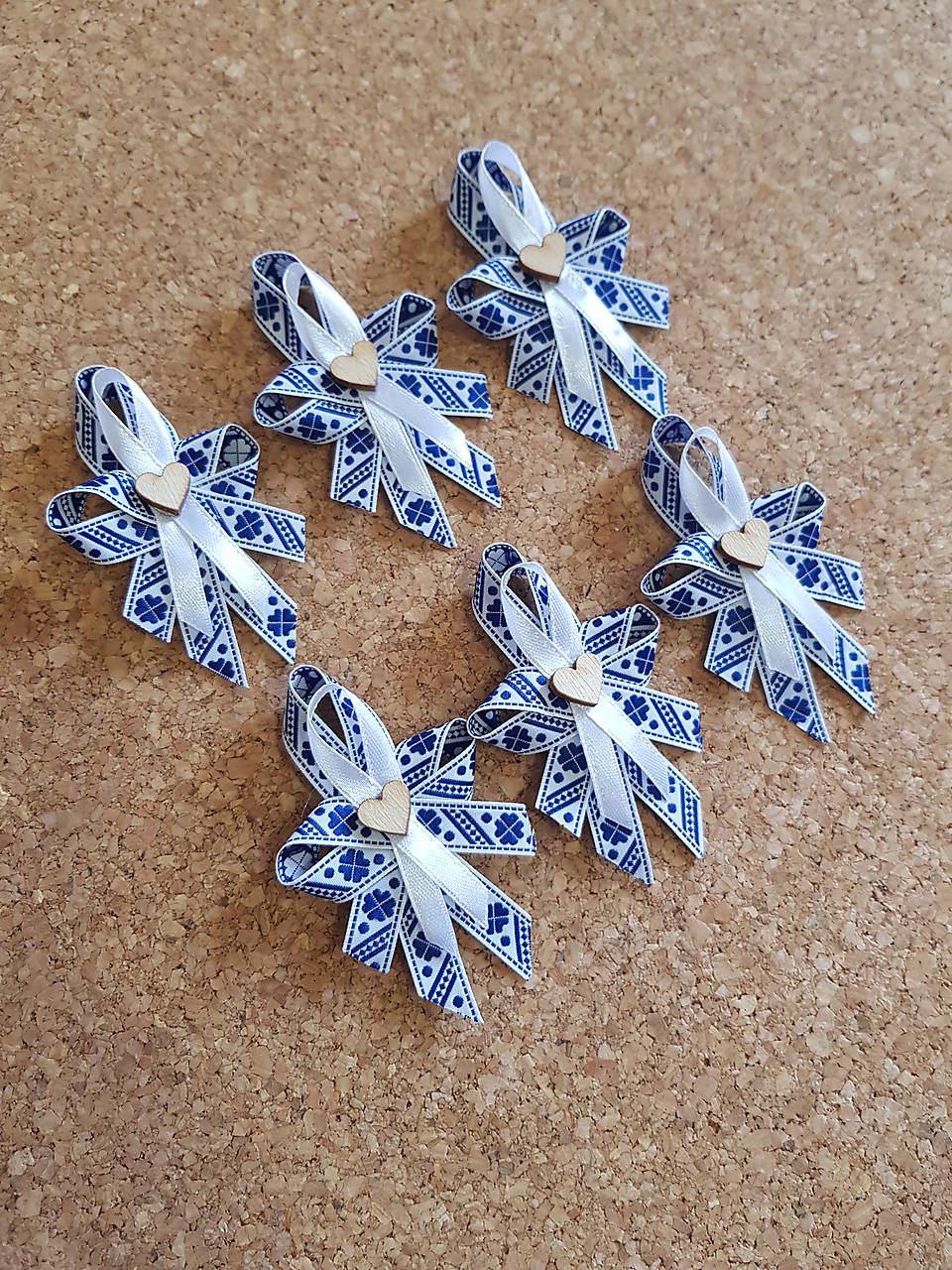 folklórne pierka v kombinácii biela s tmavomodrou pre rodičov, svedkov s bielou saténovou stuhou a dreveným srdiečkom