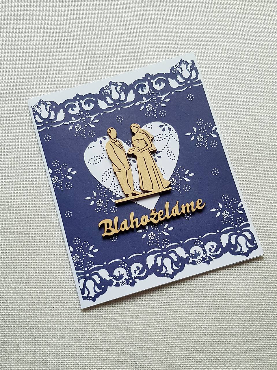 gratulačná pohľadnica mladomanželom vo folklórnom štýle modro-biela, v ponuke aj iné-viď fotky