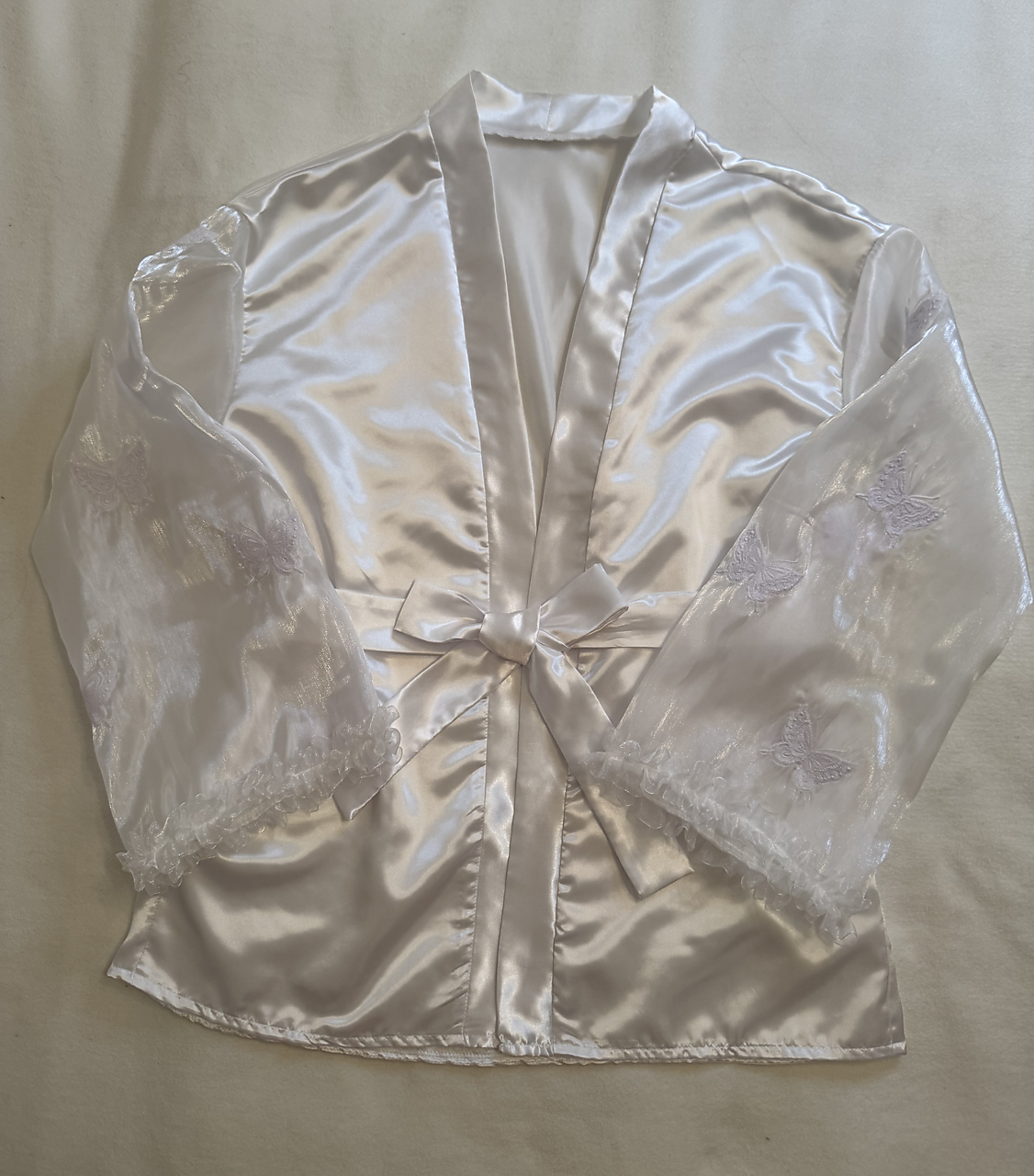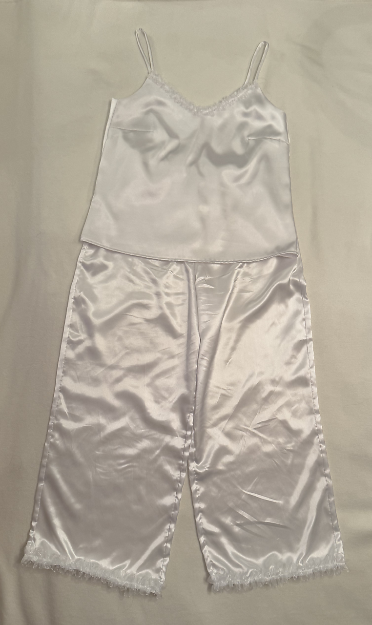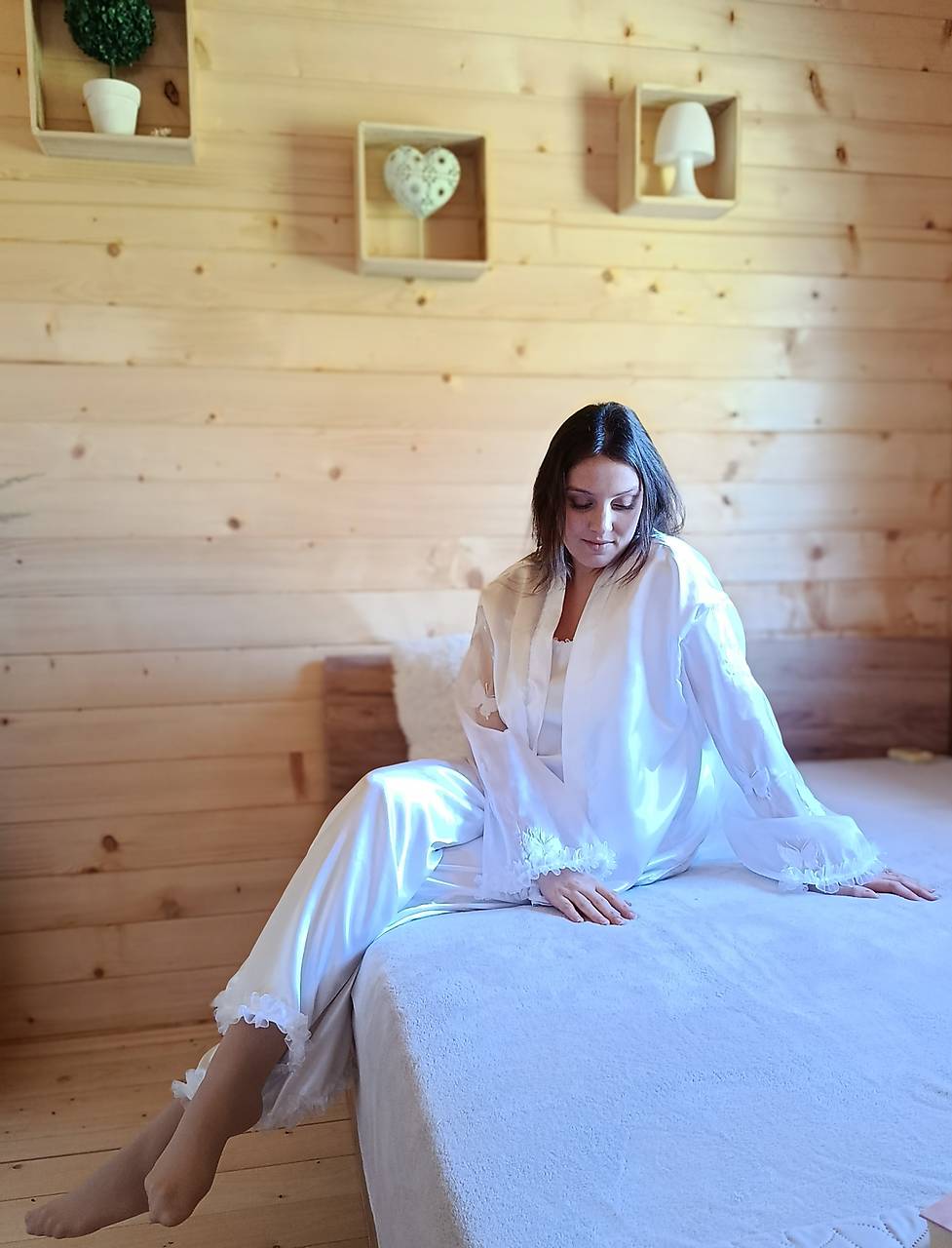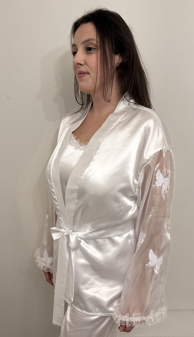 Komplet tvoria nohavice a top. Klenotom celého nočného outfitu je župan. Šperkom na župane je organza s vyšívanými motýľmi, ktoré Ťa na svojich krídlach prenesú priamo do raja snov. Spolu táto kolekcia vytvorí dokonalú harmóniu krásy a ženskosti.
