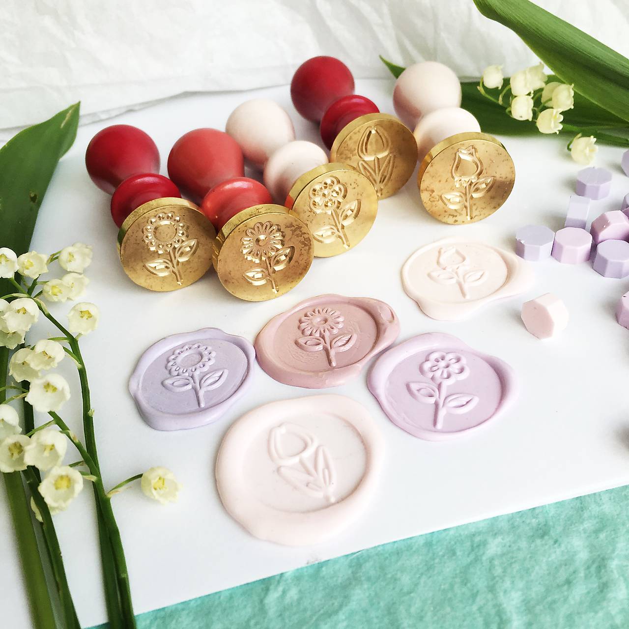 Okrúhle mosadzné pečatidlo na odtláčanie pečatí z vosku s motívom jednoduchého elegantného kvietku - nezábudky z autorskej kolekcie Letná kytica.