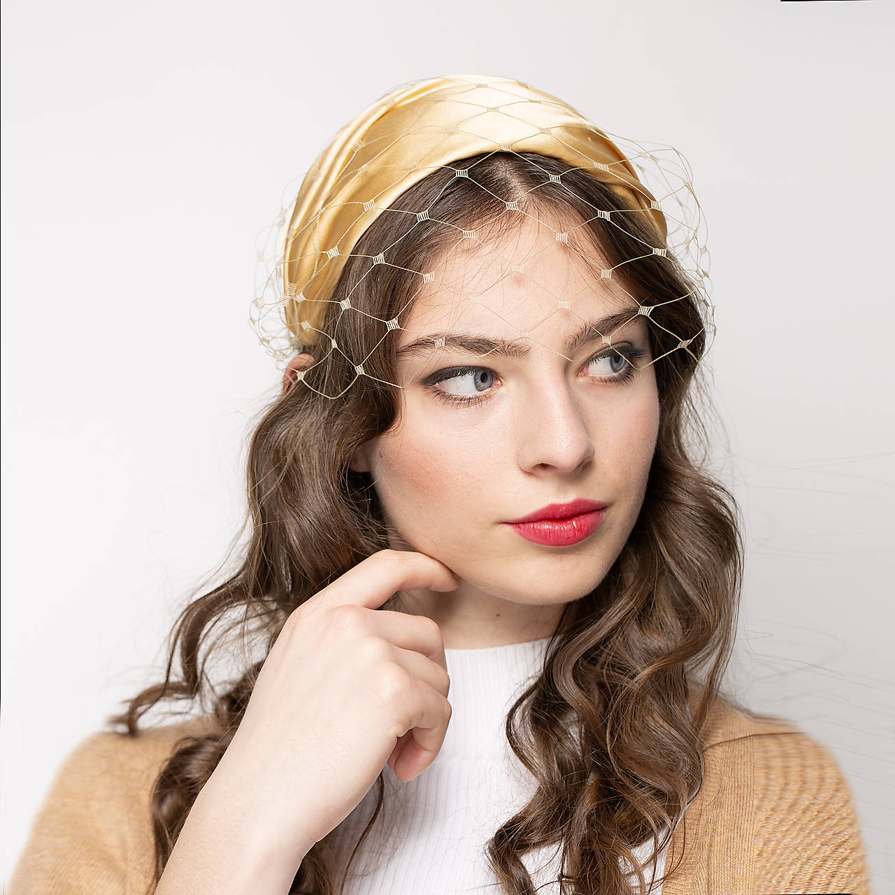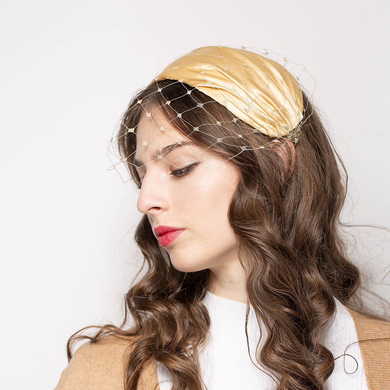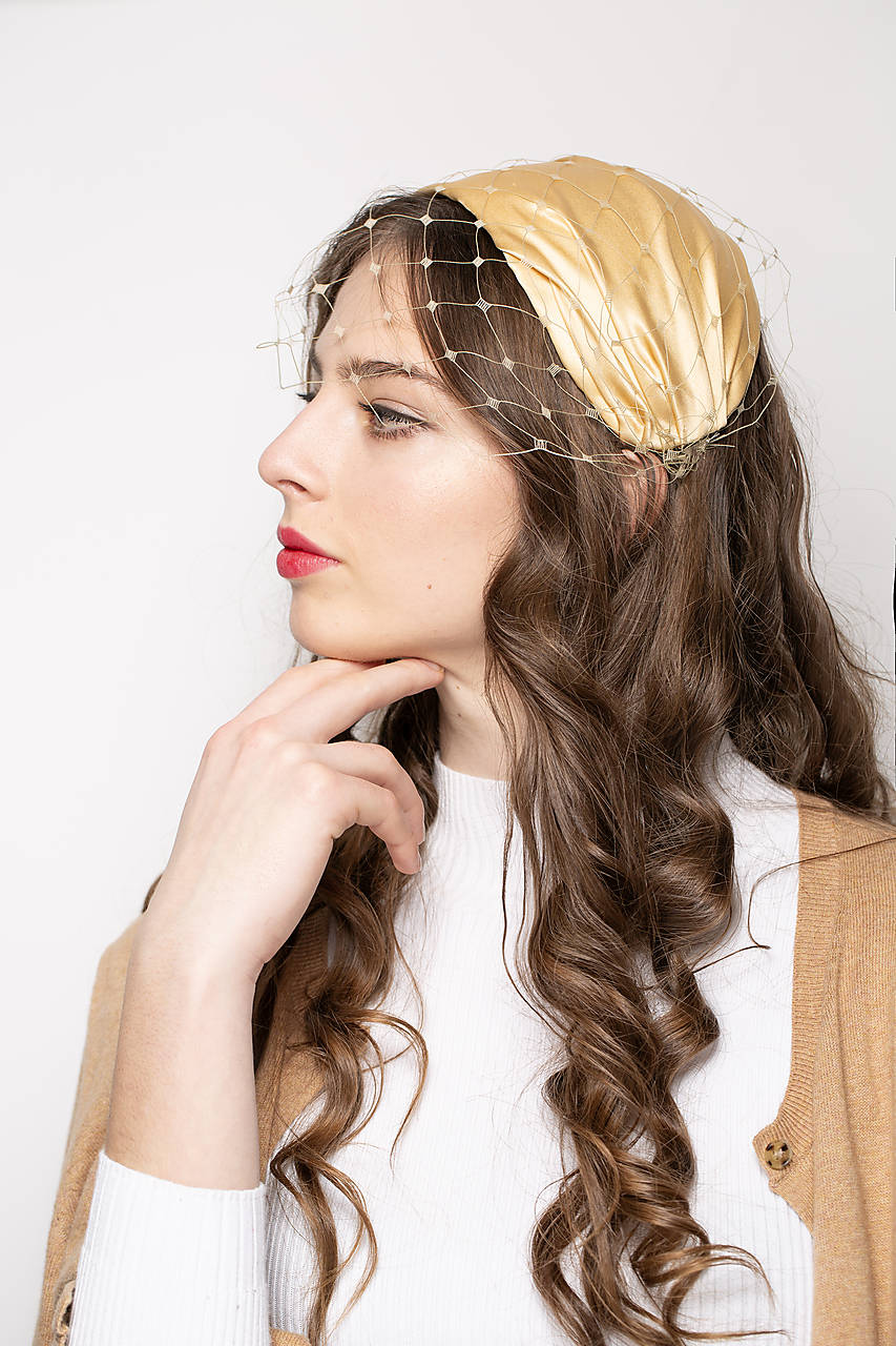 Tento spoločenský klobúčik bol inšpirovaný svadobnou čelenkou Grace Kelly. Hodvábny satén v zlatobéžovej farbe je ručne drapovaný, má decentný, jemný odlesk. Odnímateľný sieťkový závoj na dvoch sponkách ponúka rôzne možnosti stylingu.
