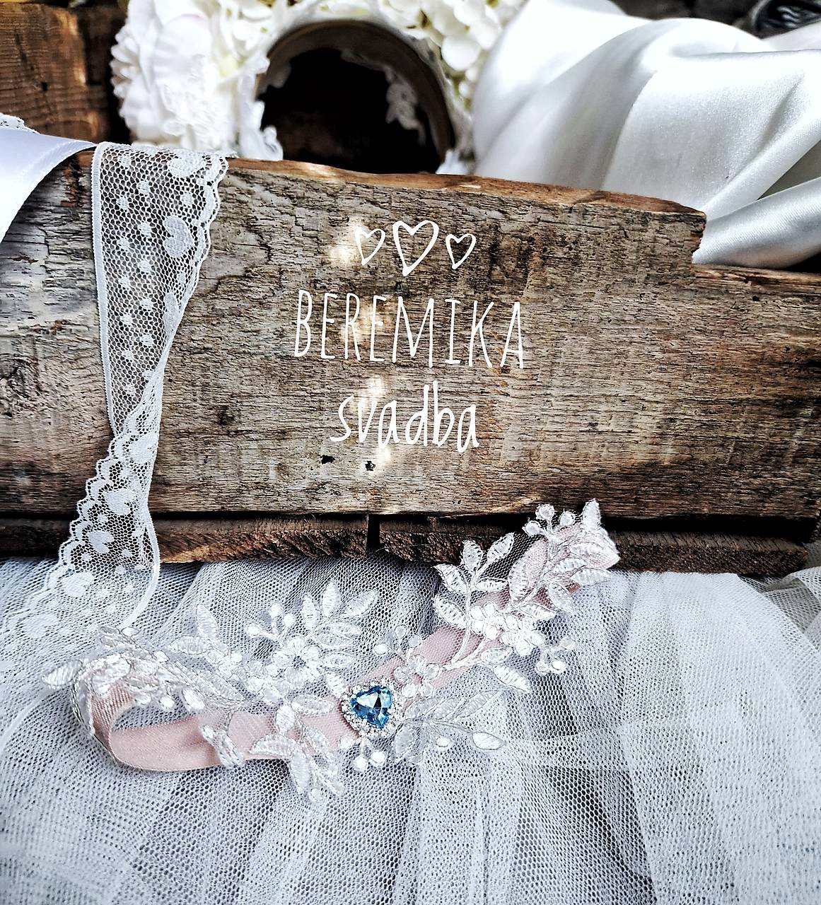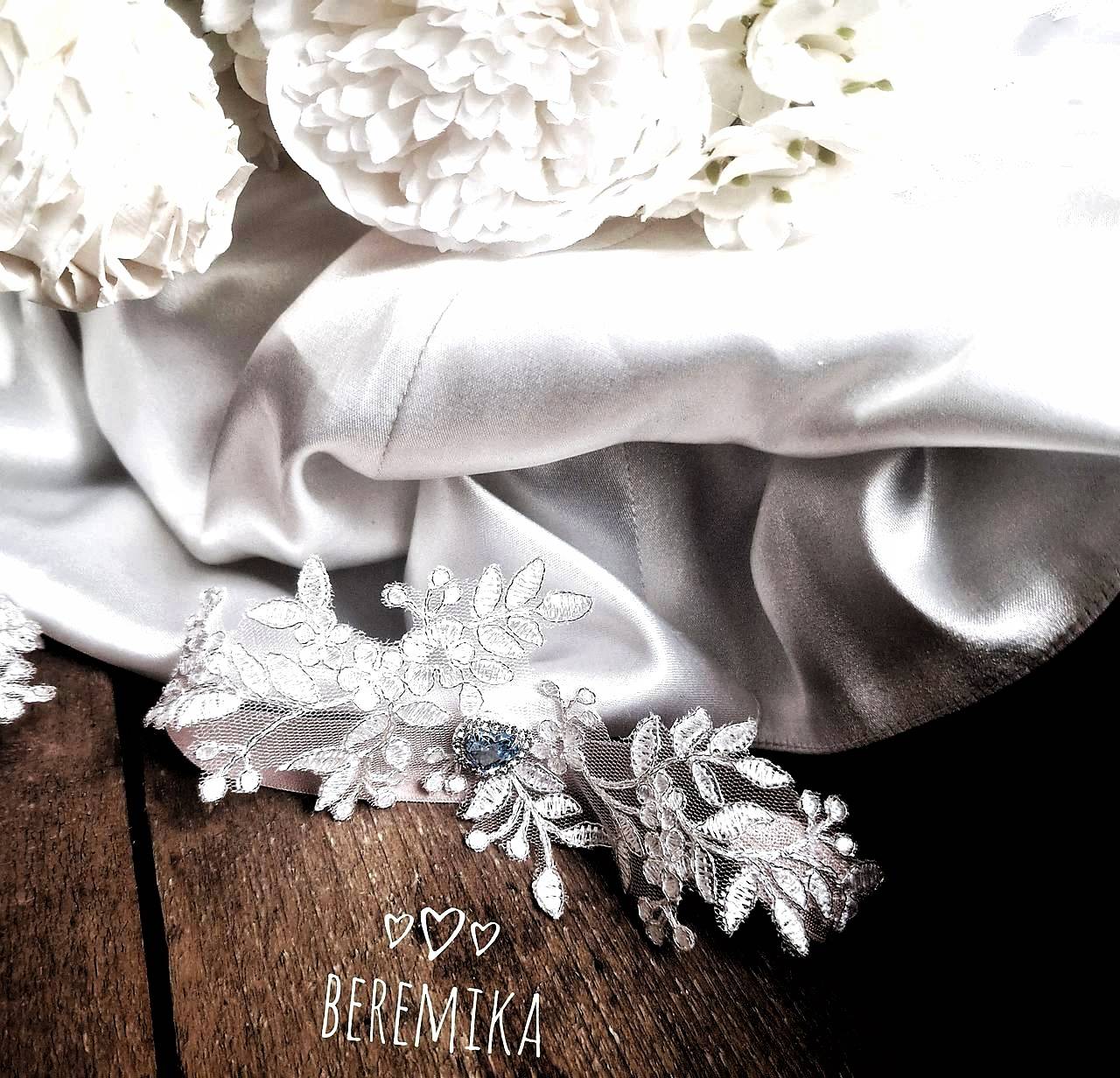 Podväzok s modrým srdiečkom na jemnej telovej lesklej gume.V ponuke biela, telová, ( v galerii podväzkov v ponuke )
