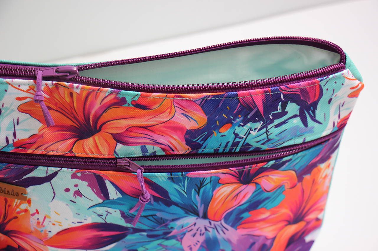 Ušito z nepromokavé kočárkoviny, vyztuženo, aby taška držela tvar a zároveň ochránila obsah.