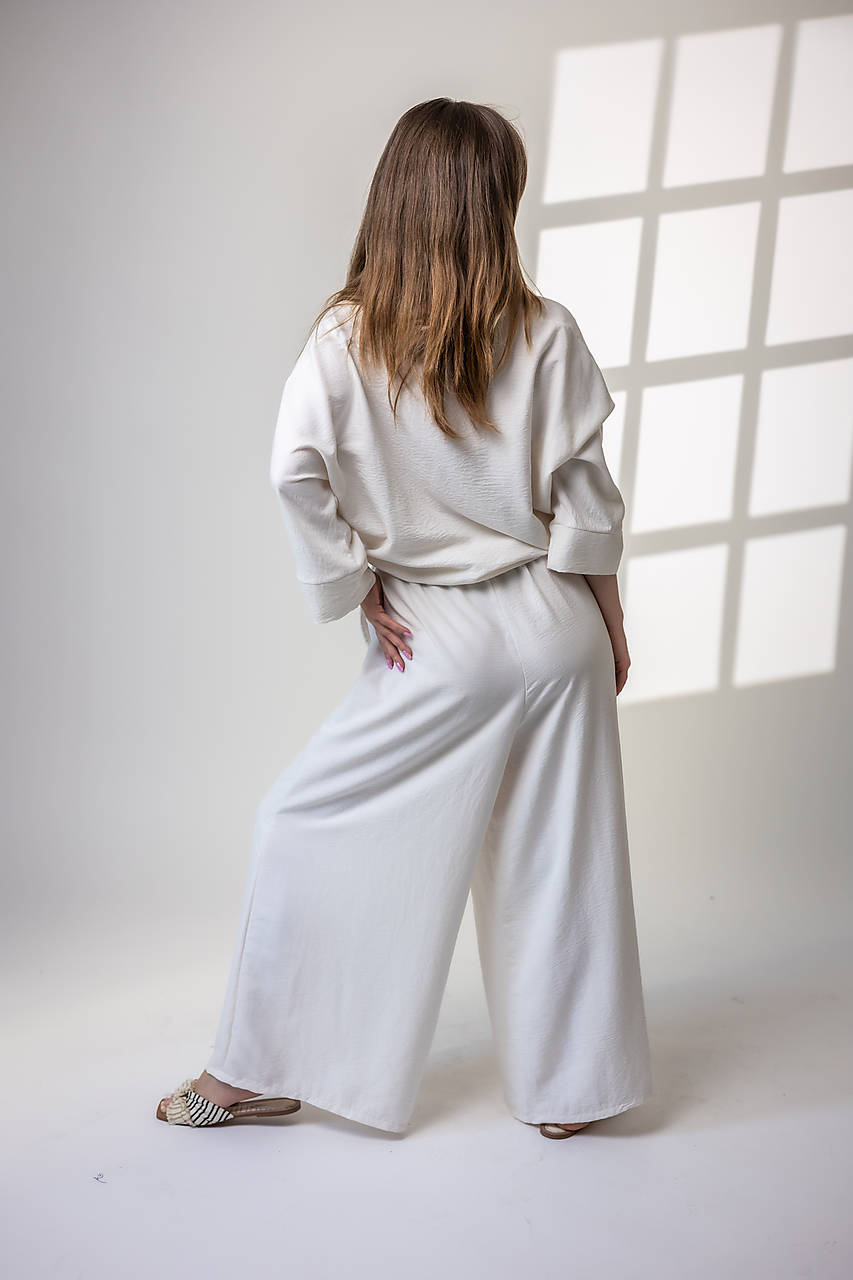 Široké nohavice s vreckami – luxus a pohodlie v jednom. Tieto elegantné široké nohavice sú dokonalým spojením komfortu a štýlu. Vďaka pružnej gume v zadnej časti sa krásne prispôsobia postave a zabezpečia maximálne pohodlie pri nosení. Praktické bočné vrecká pridávajú na funkčnosti, zatiaľ čo jemný, extra príjemný materiál zaručuje ľahkosť a vzdušnosť, ideálnu na letné dni.