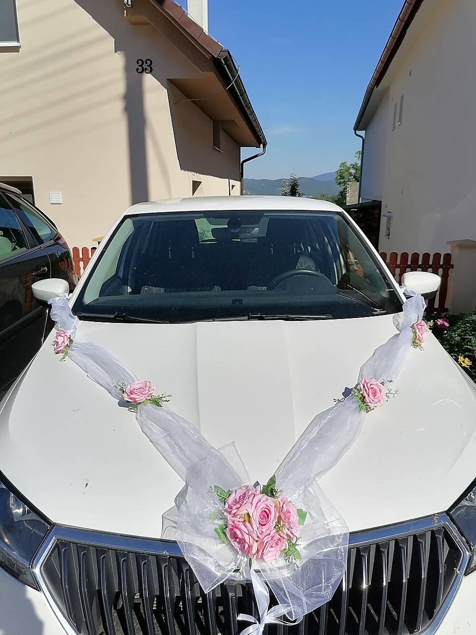 Na auto sa pripevňuje stuhami na koncoch a pod mašľou. Priviažete o spodok kapoty auta.