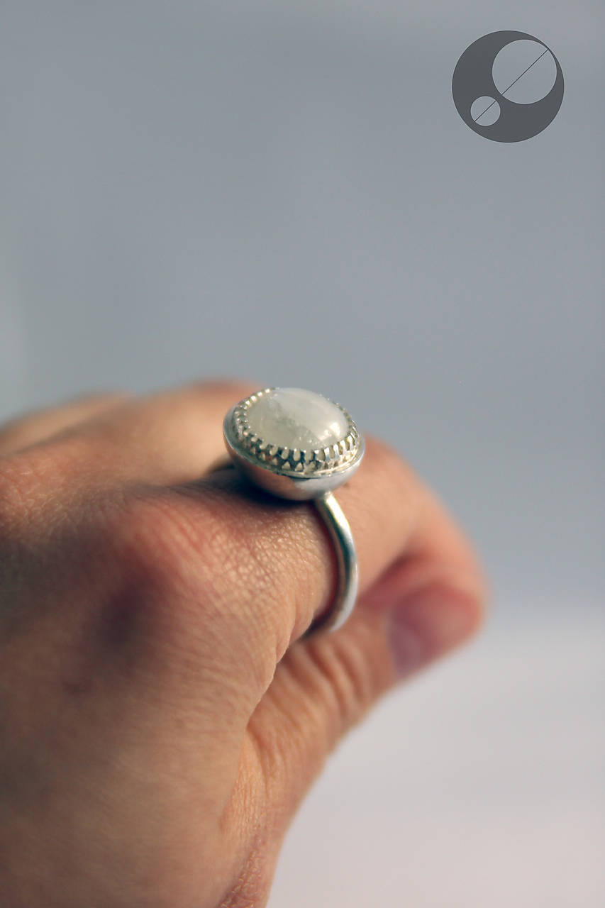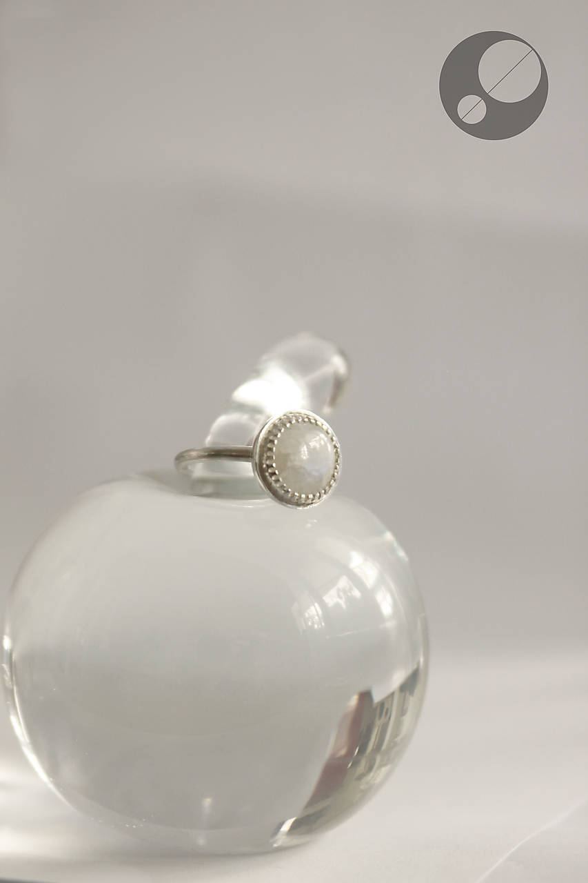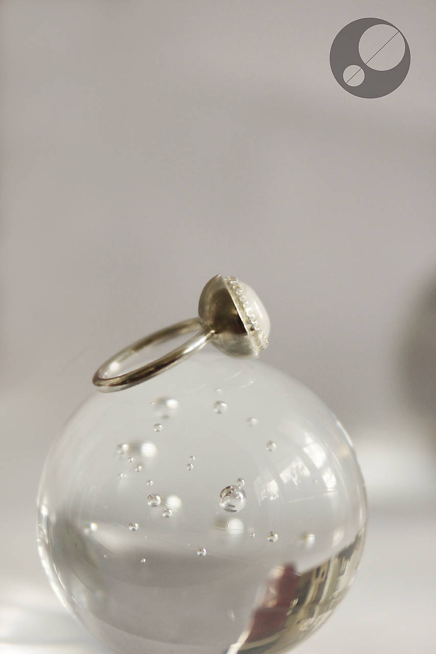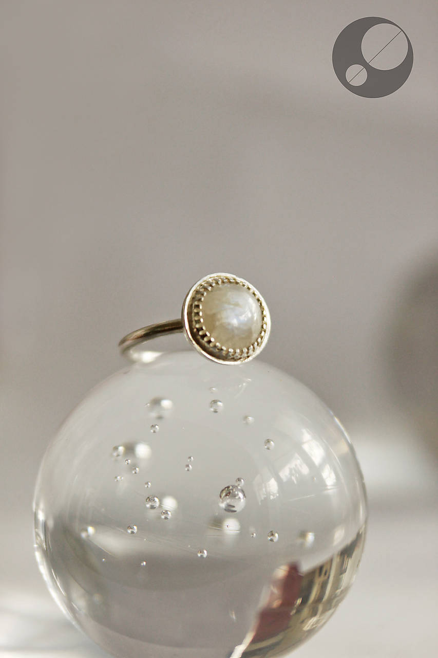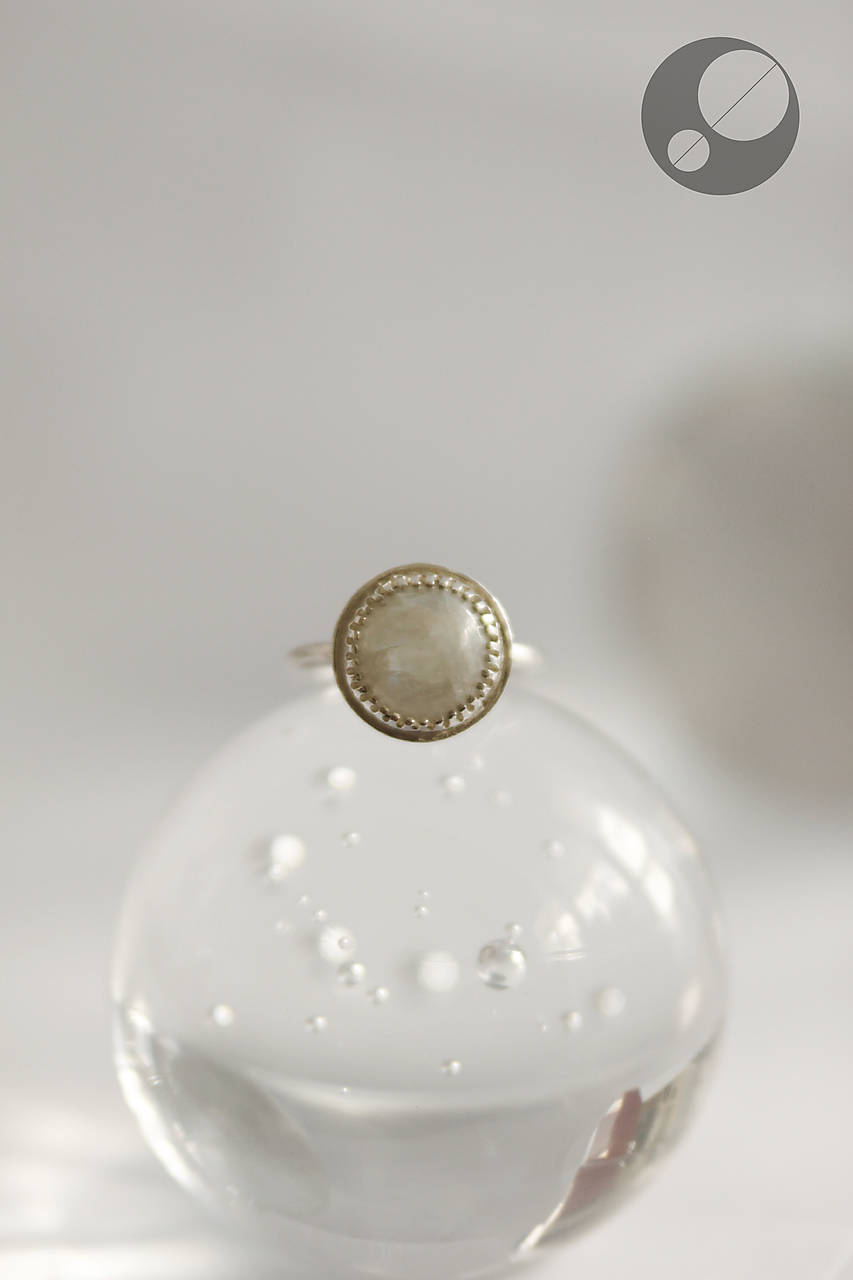 Kameň je osadený v obrube, ktorá je prispájkovaná k podkladu v tvare pologule. Je to krásny dúhový mesačný kameň trochu nepravidelného tvaru.