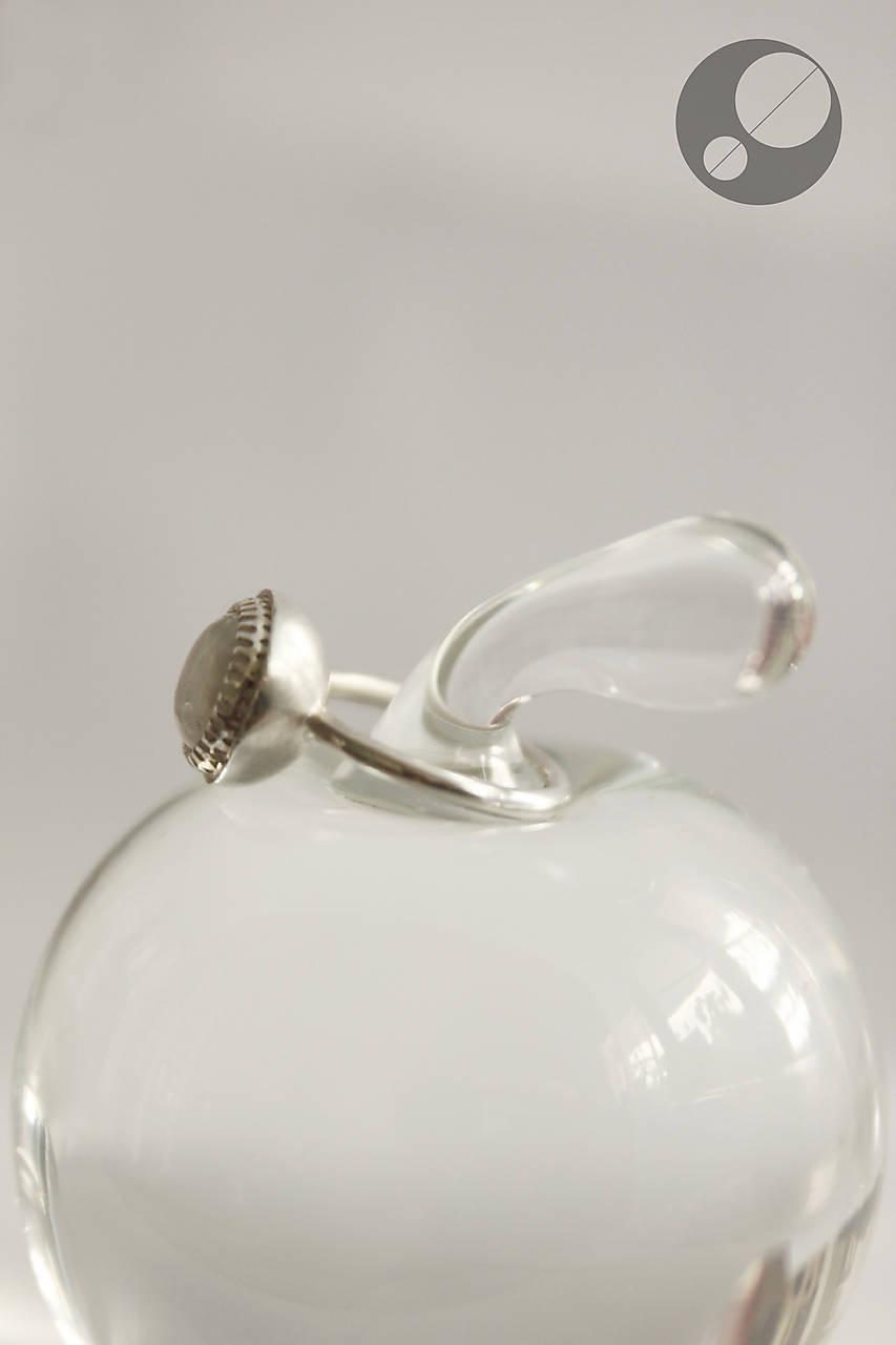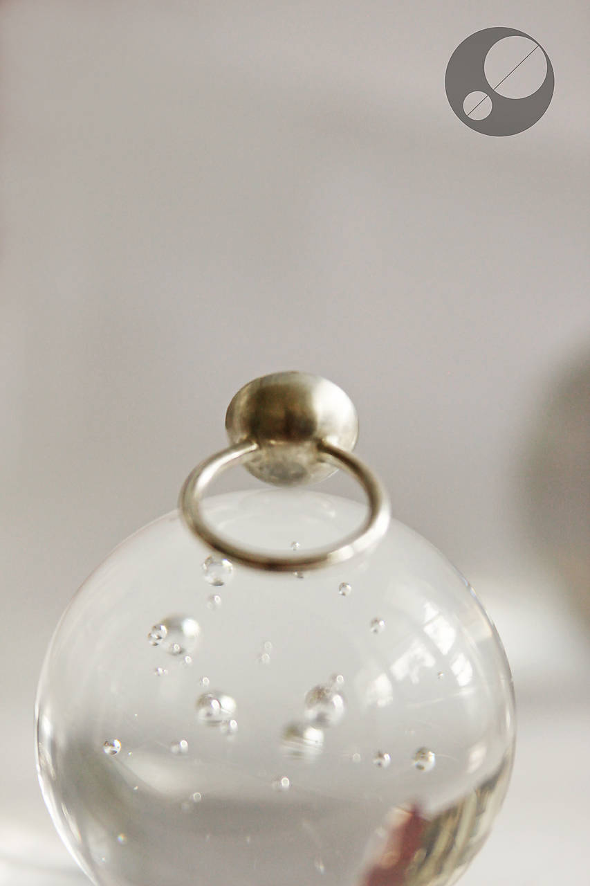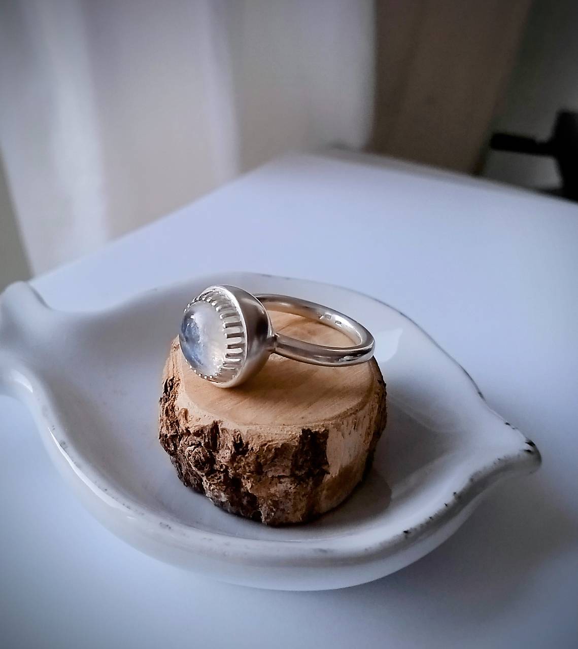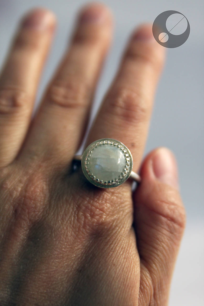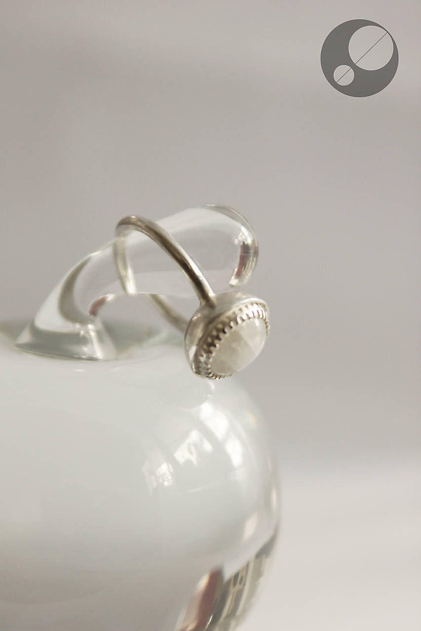 Kameň je osadený v obrube, ktorá je prispájkovaná k podkladu v tvare pologule. Je to krásny dúhový mesačný kameň trochu nepravidelného tvaru.