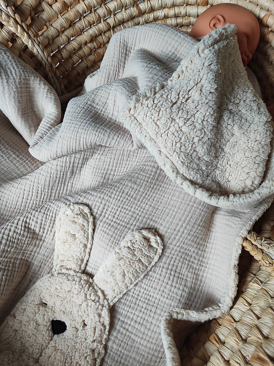 Táto deka z mušelínu a barančeka je najviac obľúbená a je vhodná na prechodné obdobie alebo chladnejšie večere.Má všestranné využitie a je vhodná do kočíka, detskej postieľky, koša, na cestovanie, k lekárovi, je skladná a zmestí sa do tašky. Je zložená z dvoch vrstiev mušelínu a teddy barančeka.