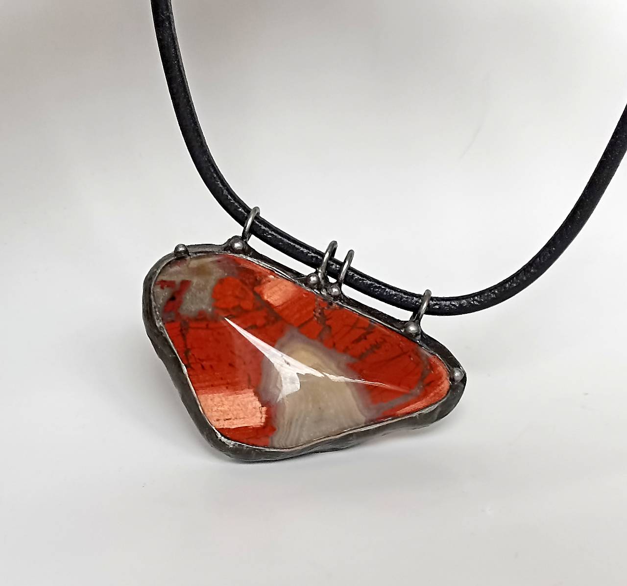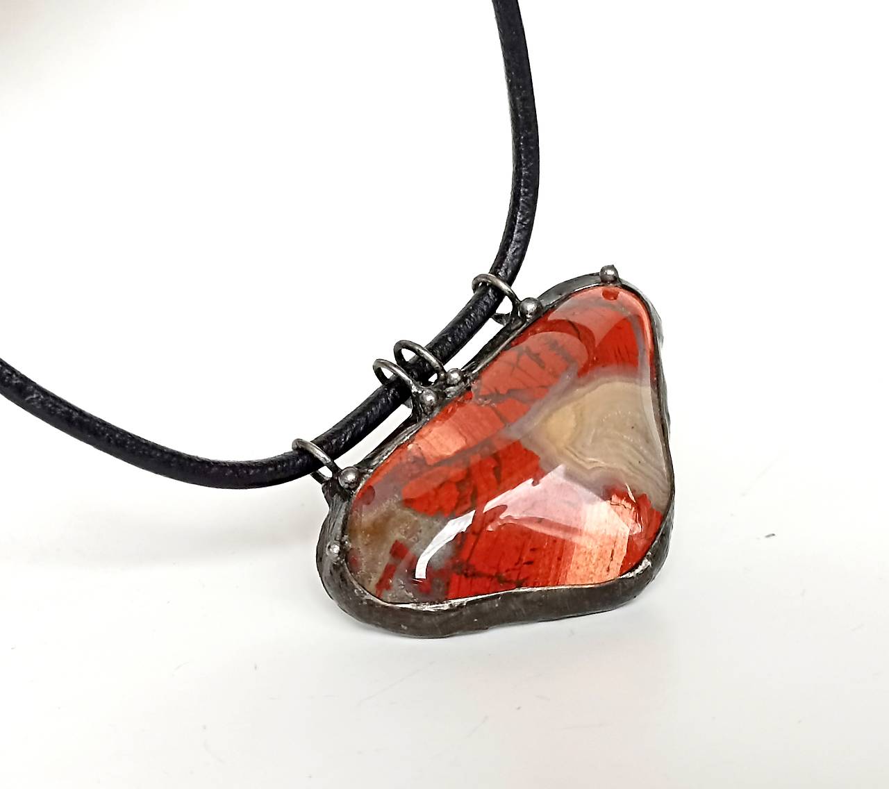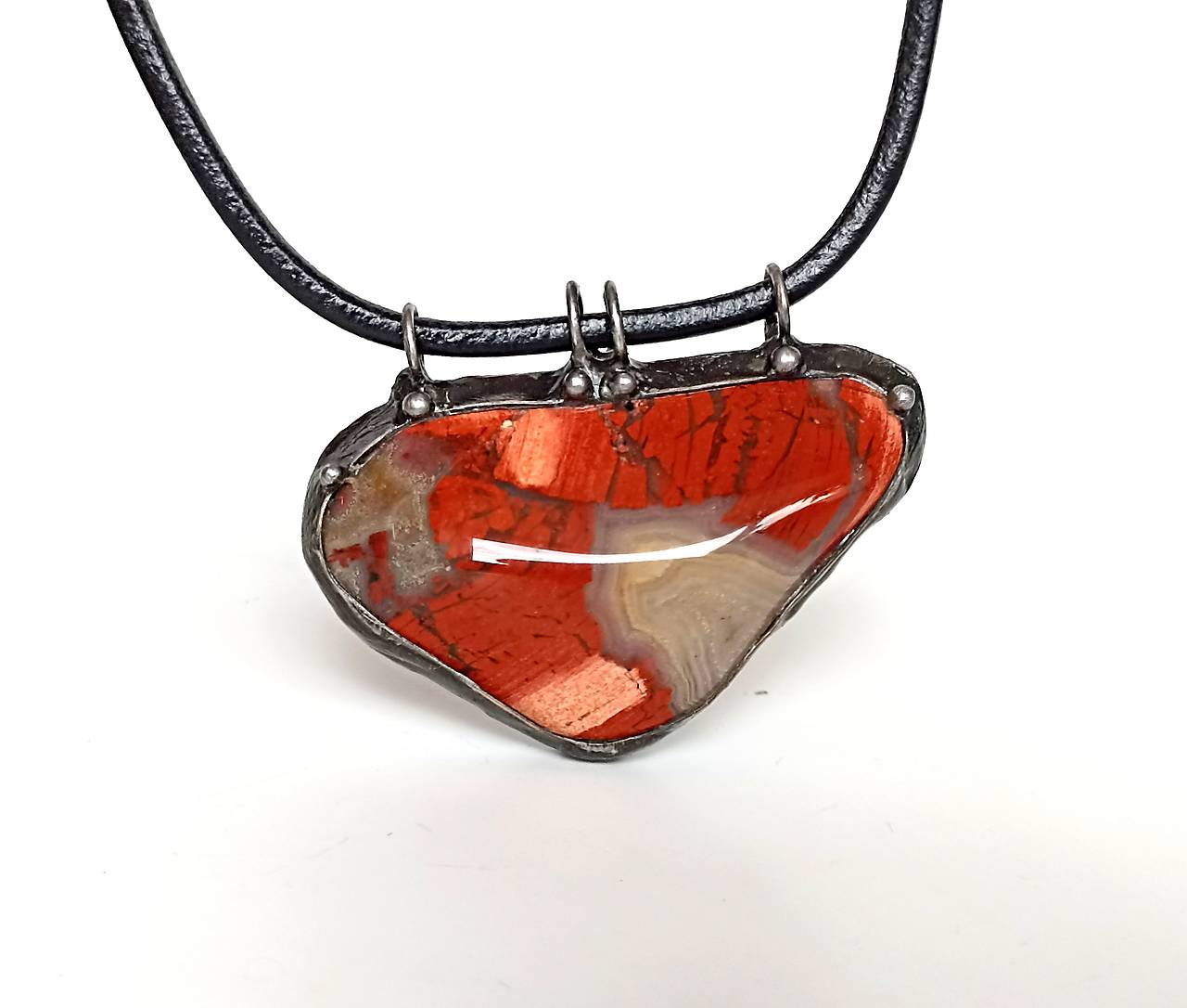 Ručne vypracovaný, výrazný šperk z cínu a medi, necháva vyniknúť kráse achátu červeného.