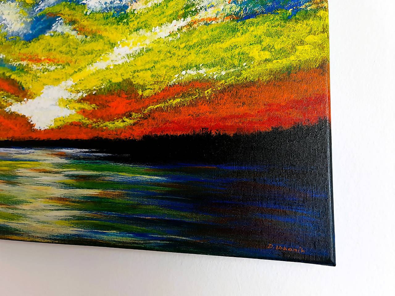 Do tohto akrylového diela som vložil svoju vášeň a zachytil ohnivú energiu západu slnka, ktorý sa topi v pokojnom horizonte. Prostredníctvom výrazných, rozsiahlych ťahov som chcel vyvolať intenzívne emócie, ktoré večerné svetlo vyvoláva – nádej, zamyslenie a pokoj. Tento obraz naplní váš priestor teplom a žiarivou energiou a pozve vás, aby ste sa zastavili a vnímali krásu v každom prchavom okamihu.