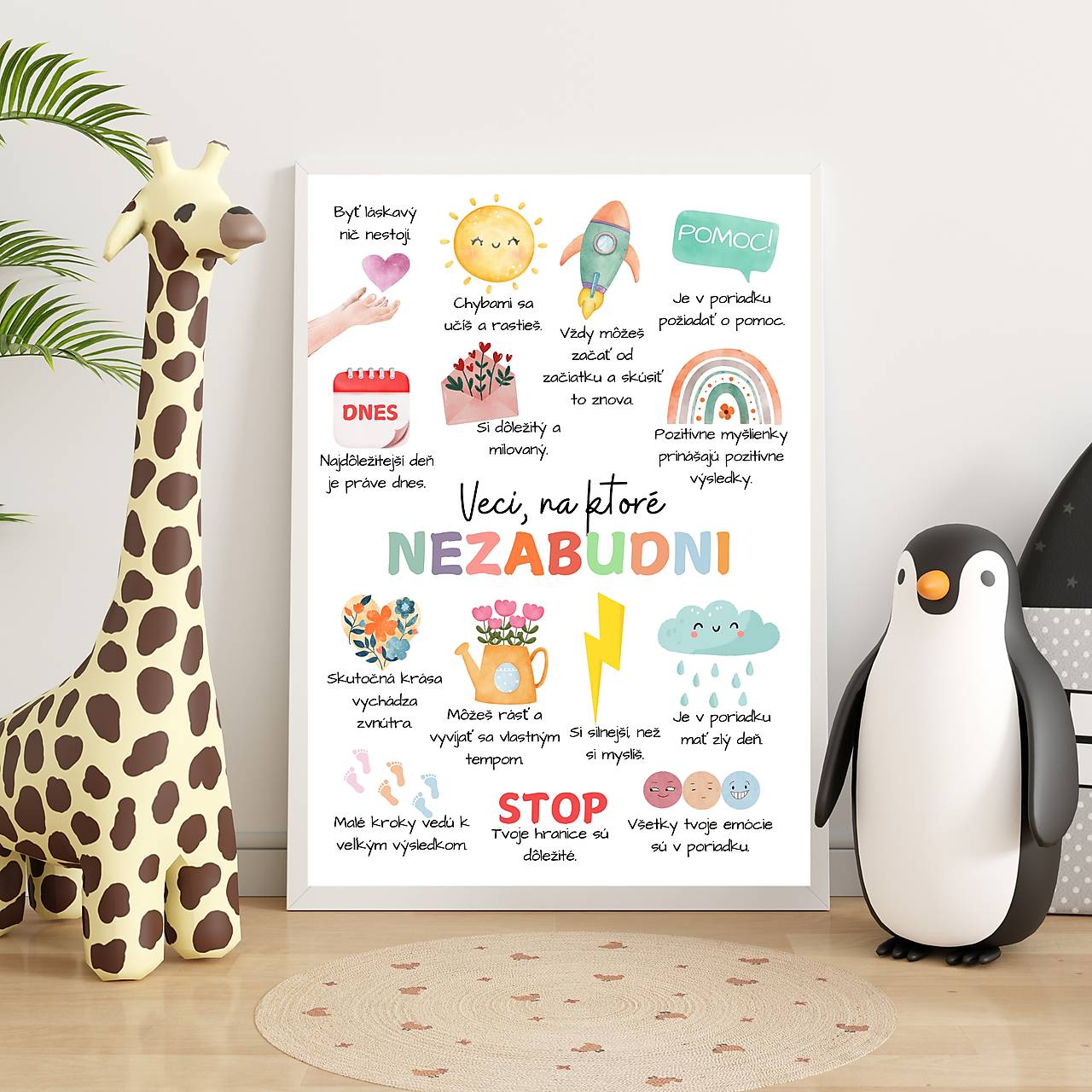 Navrhnutý s jemnými farbami a rozkošnými kresbami, plagát je ideálnym doplnkom do detskej izbičky, škôlky alebo herného priestoru. Každá afirmácia je navrhnutá tak, aby pomáhala deťom veriť v seba, objavovať vlastnú jedinečnosť a pripomínala im, že láska, odvaha a priateľstvo sú vždy na dosah.