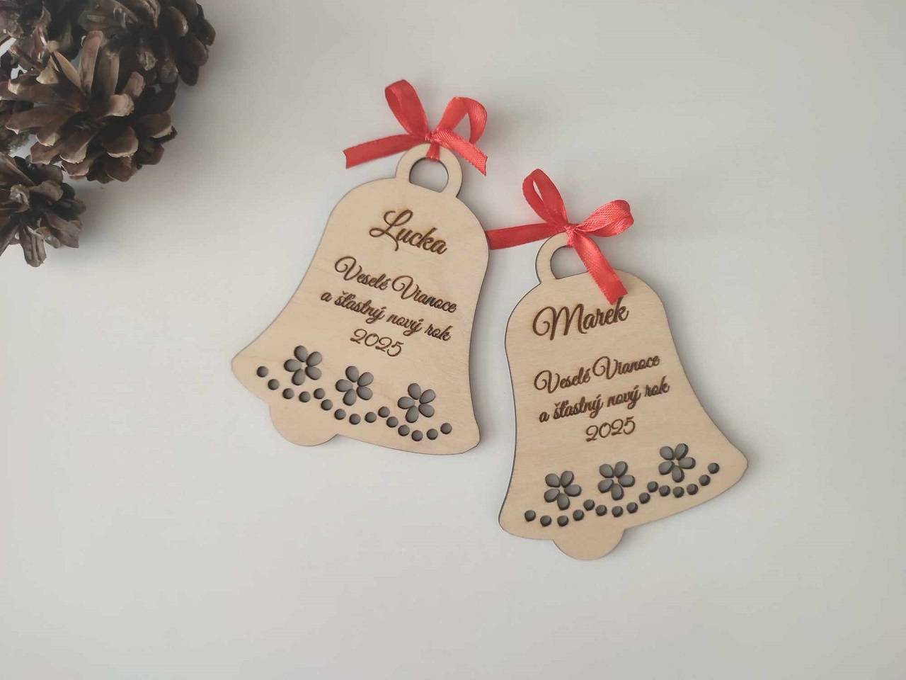 Závesná dekorácia - zvonček s menom, prianím a vyrezávaným okrajom doplnený o červenú mašľu vhodný ako malý darček pre Vašich blízkych.