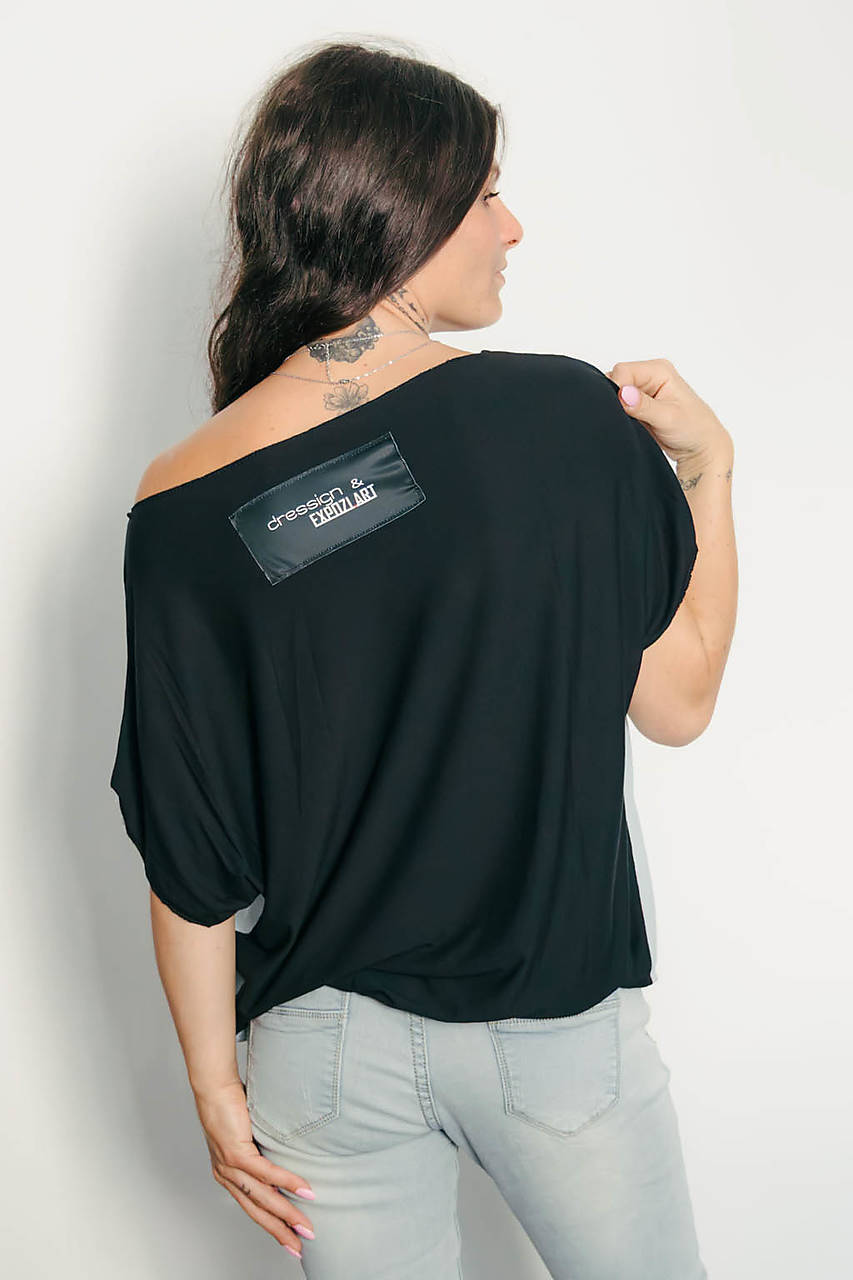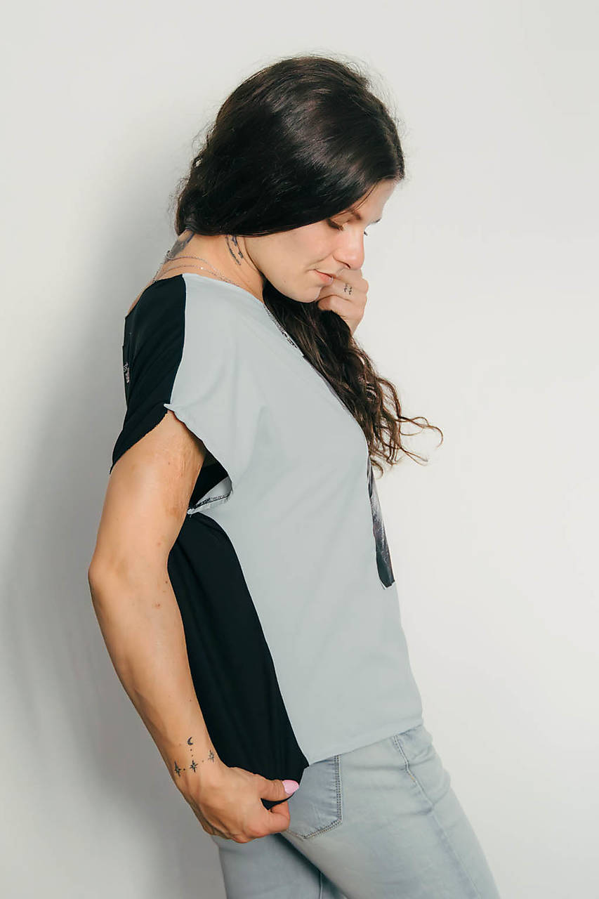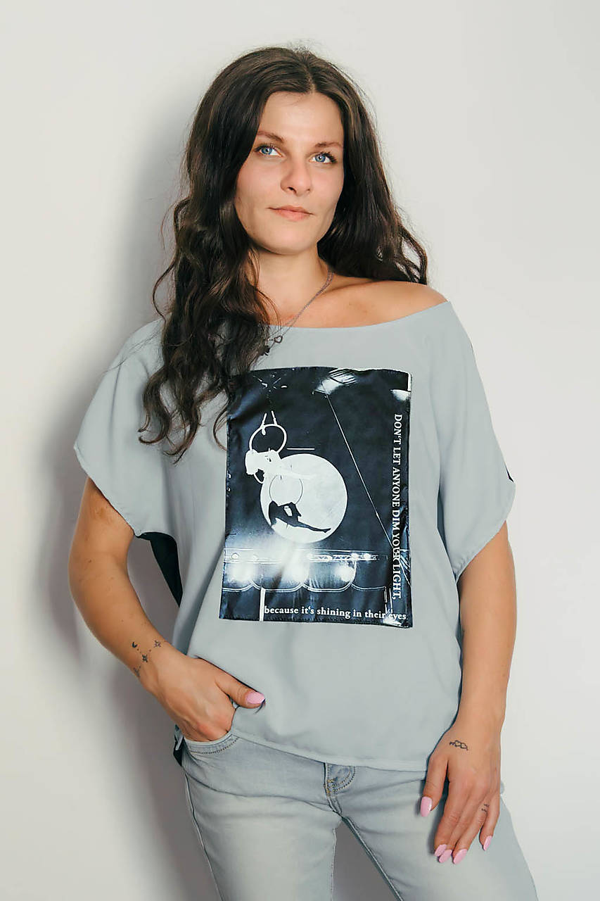 Výrazné tričko s predným dielom z jemnej viskózy a bavlneným čiernym chrbtom. Autorská fotografia s akrobatkou na kruhu z cirkusu Alex a výpovedný text „Don’t let anyone dim your light, because it’s shining in their eyes“ robia z tohto kúsku poetické brnenie pre každodenný život.
