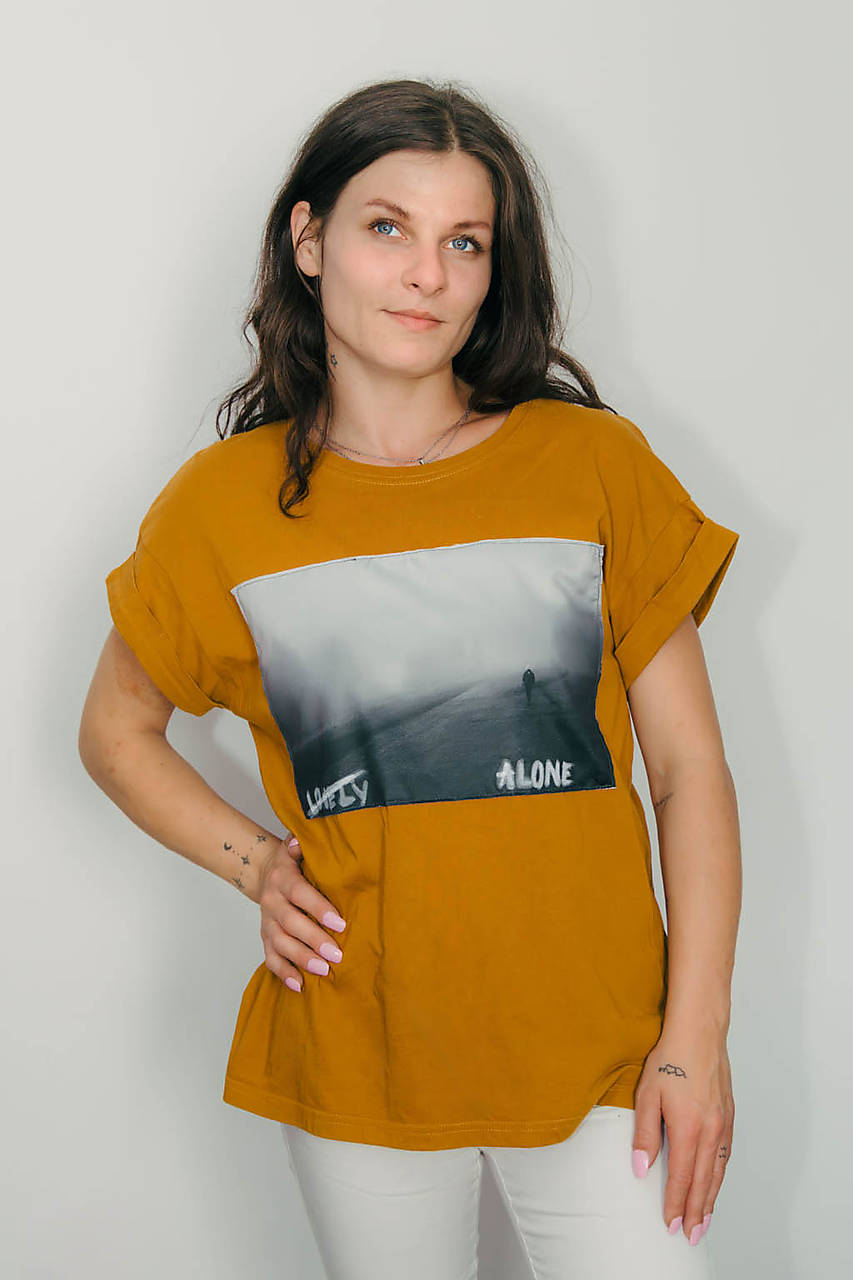 Výrazné horčicové tričko s čiernobielym printom NOT LONELY, JUST ALONE . Autorský záber z kolekcie Silence Between Moments od fotografického projektu Expozi.art. Tričko má voľnejší strih, ohrnuté rukávy a hlboký vnútorný význam.