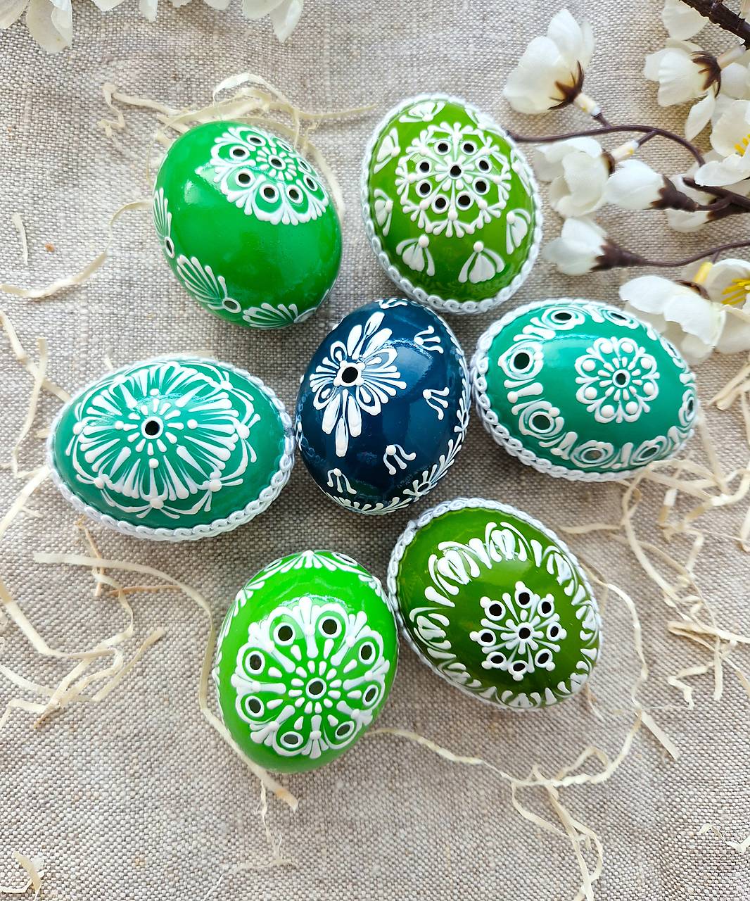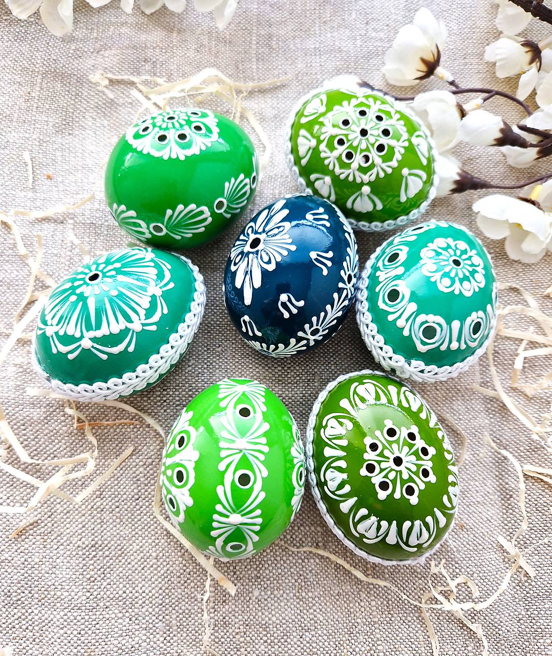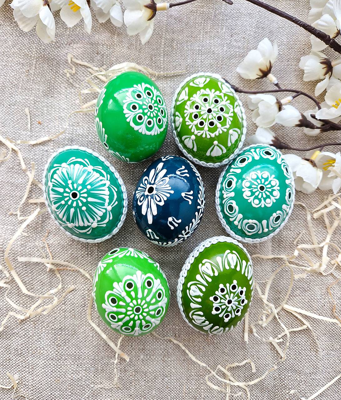 Kraslice sú vydezinfikované, maľované kvalitnými českými voskovkami na akrylovom podklade, ozdobené textilným prámikom a zalakované proti oderu.