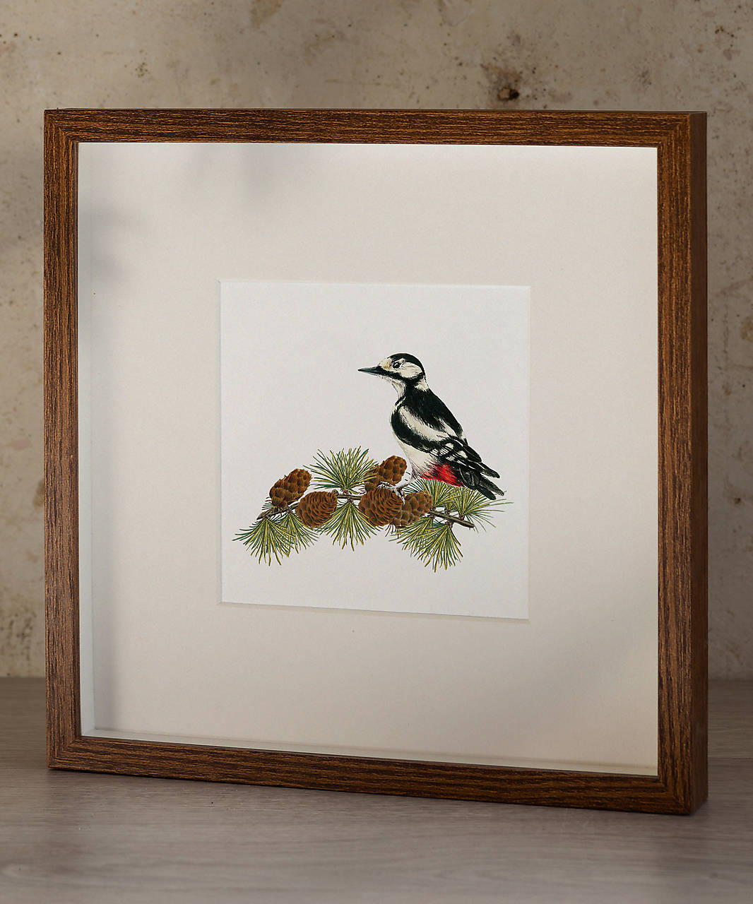 Reprodukcia mojej ručne kreslenej ilustrácie ĎATLA VEĽKÉHO (lat. Dendrocopos major) je vytlačená technikou Giclée na vysokokvalitný akvarelový papier s jemnou štruktúrou a gramážou 350 g/m², čo jej dodáva vzhľad originálnu