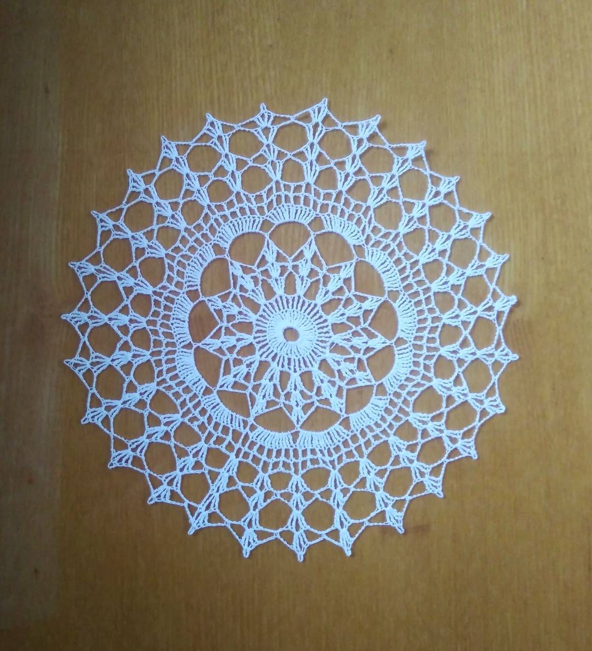 Dečka je ručne háčkovaná zo 100% bavlnenej priadze bielej farby (Kordonet č. 50). Je škrobená, vytiahnutá špendlíkmi.