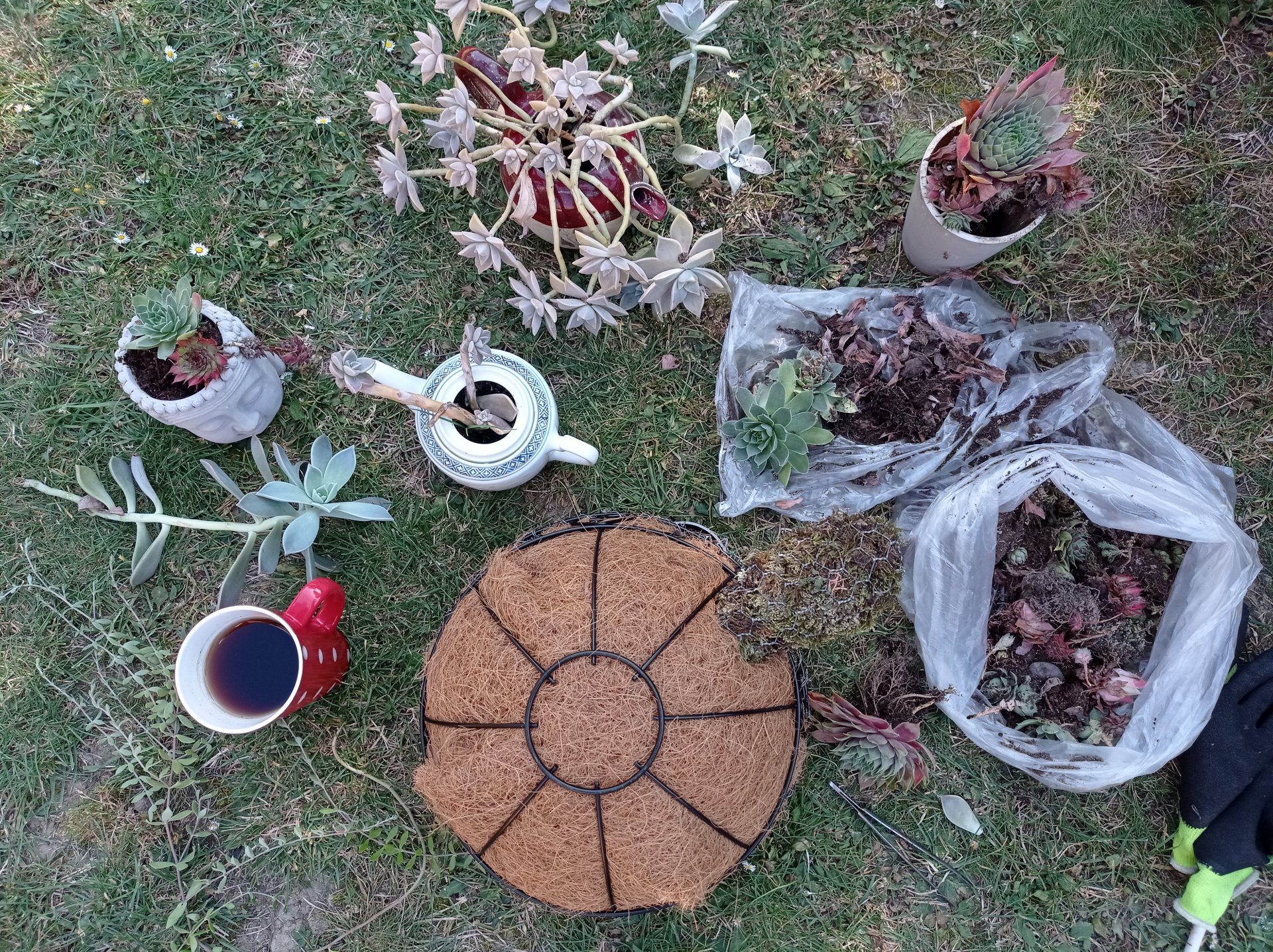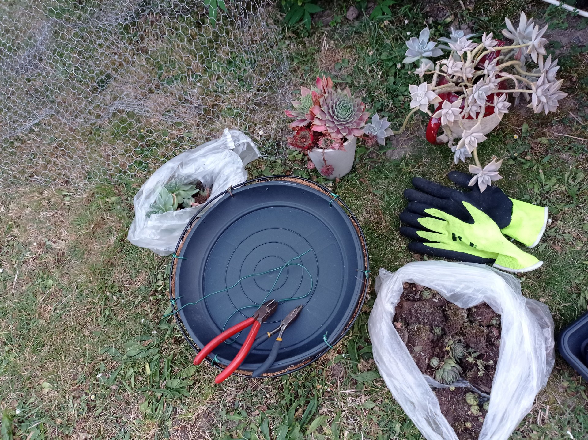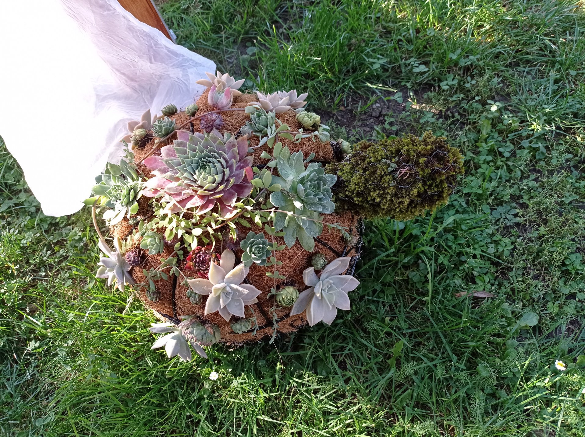Závesný kôs, misku pod kvetináč, pletivo, zeminu, sukulenty, mach.