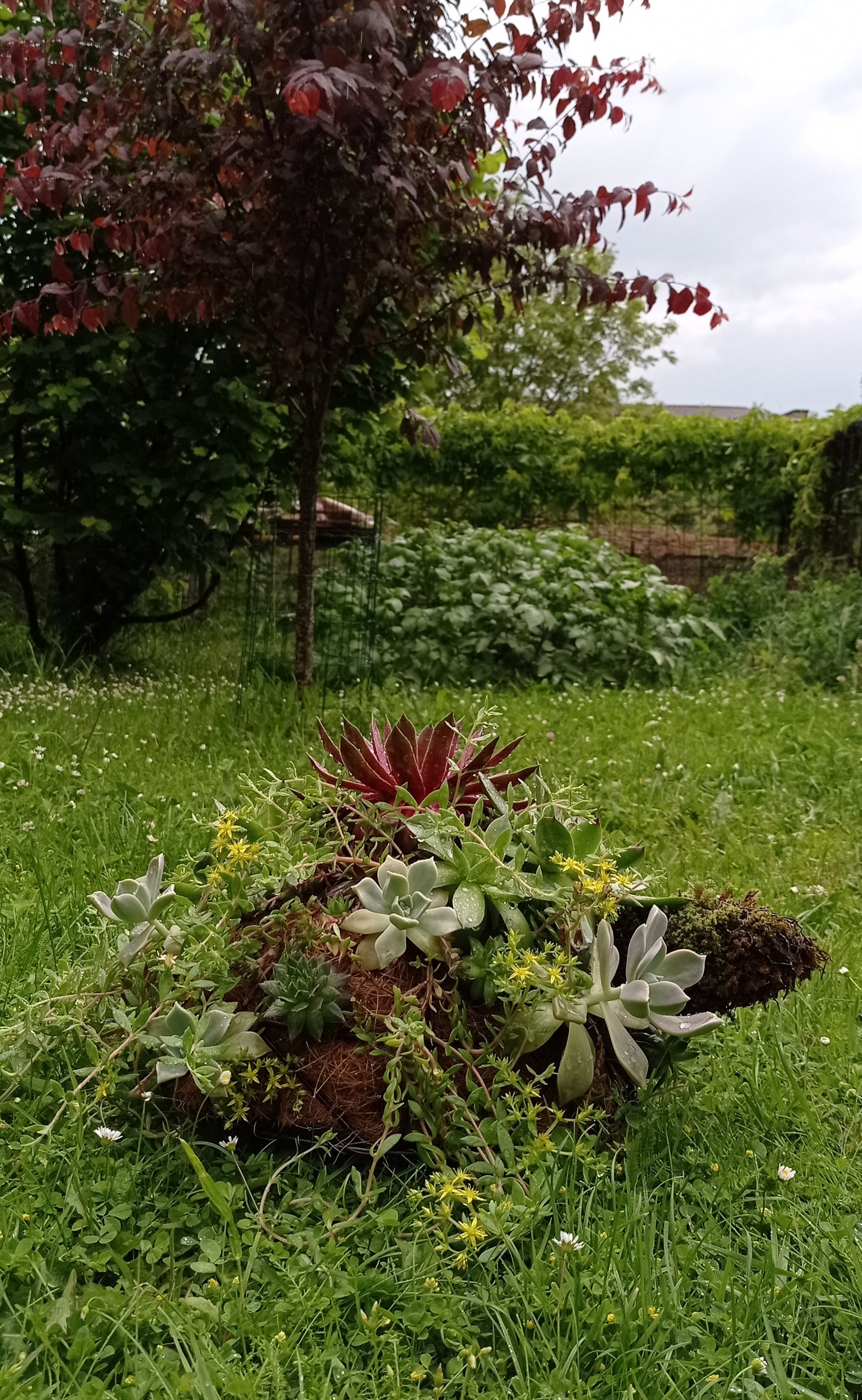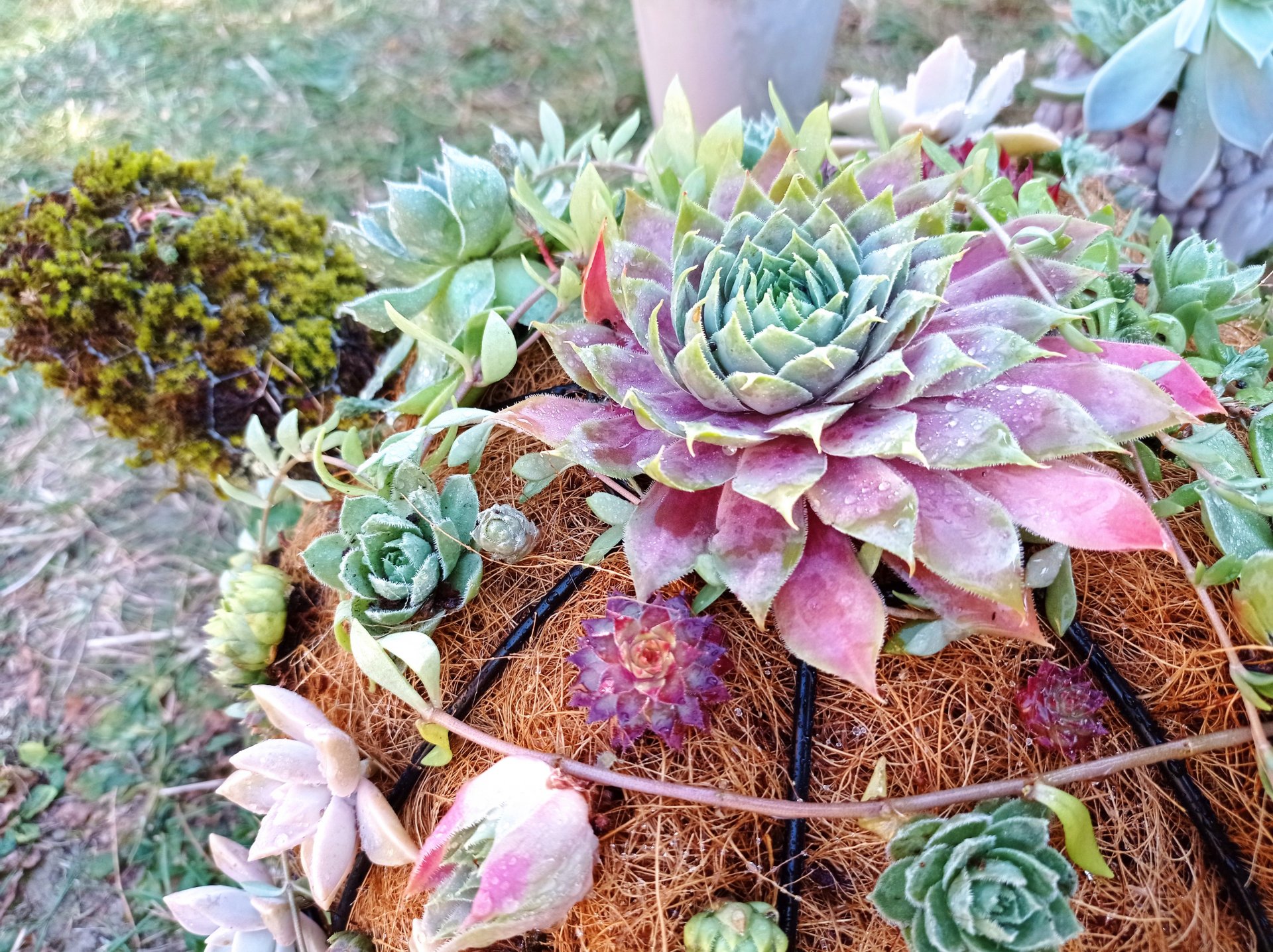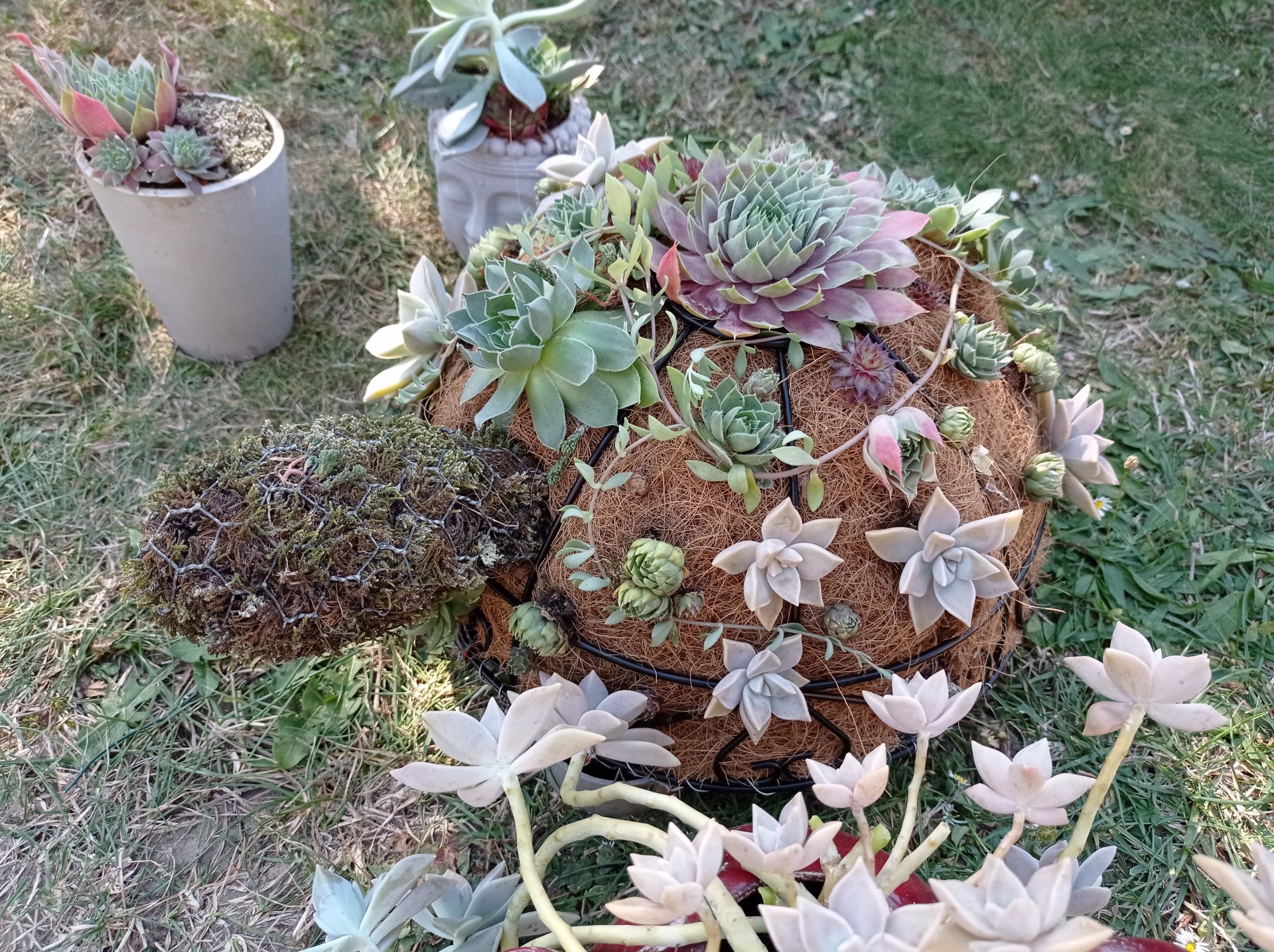 Závesný kôs, misku pod kvetináč, pletivo, zeminu, sukulenty, mach.