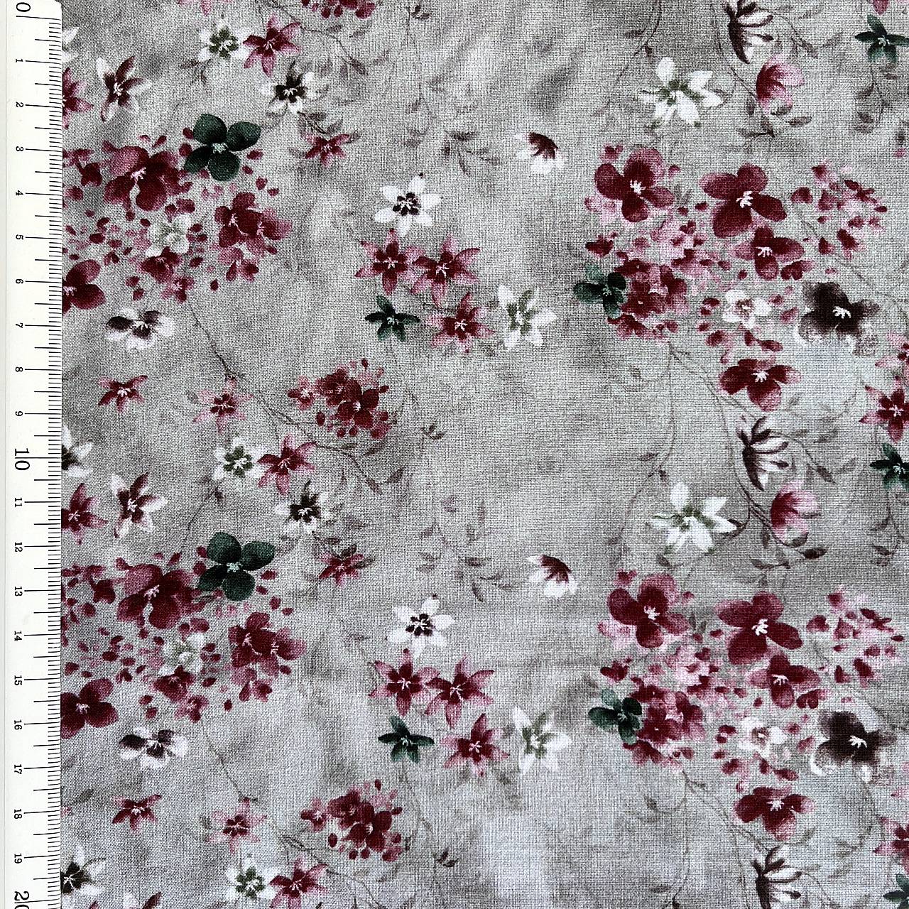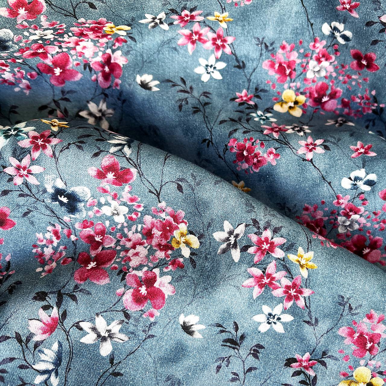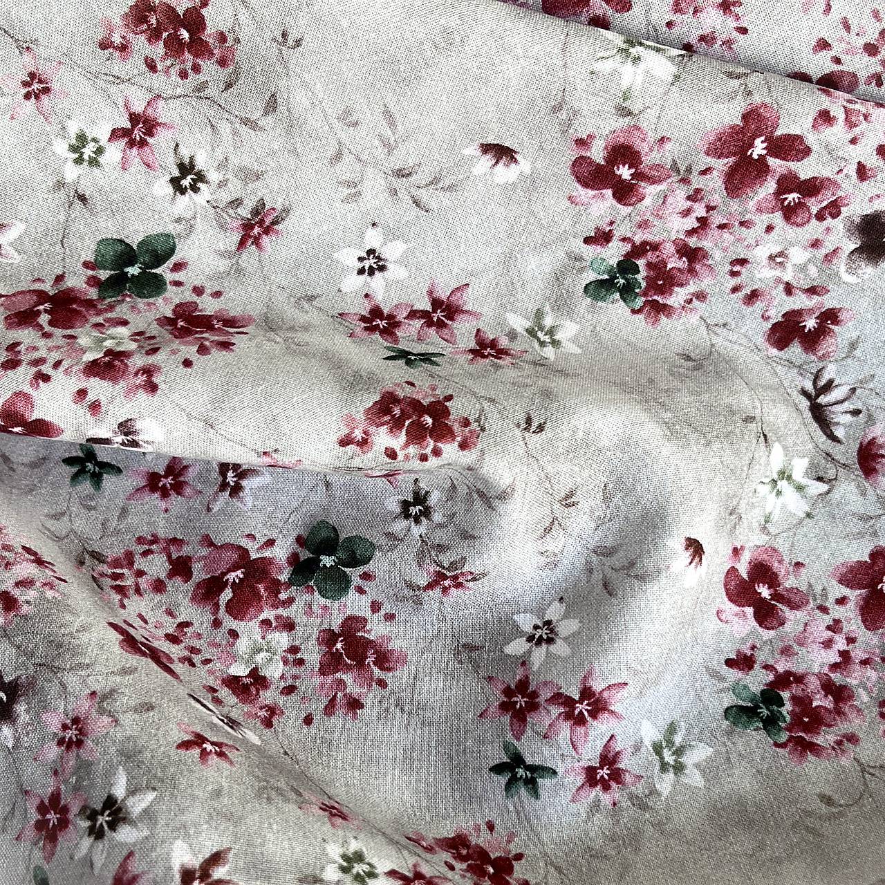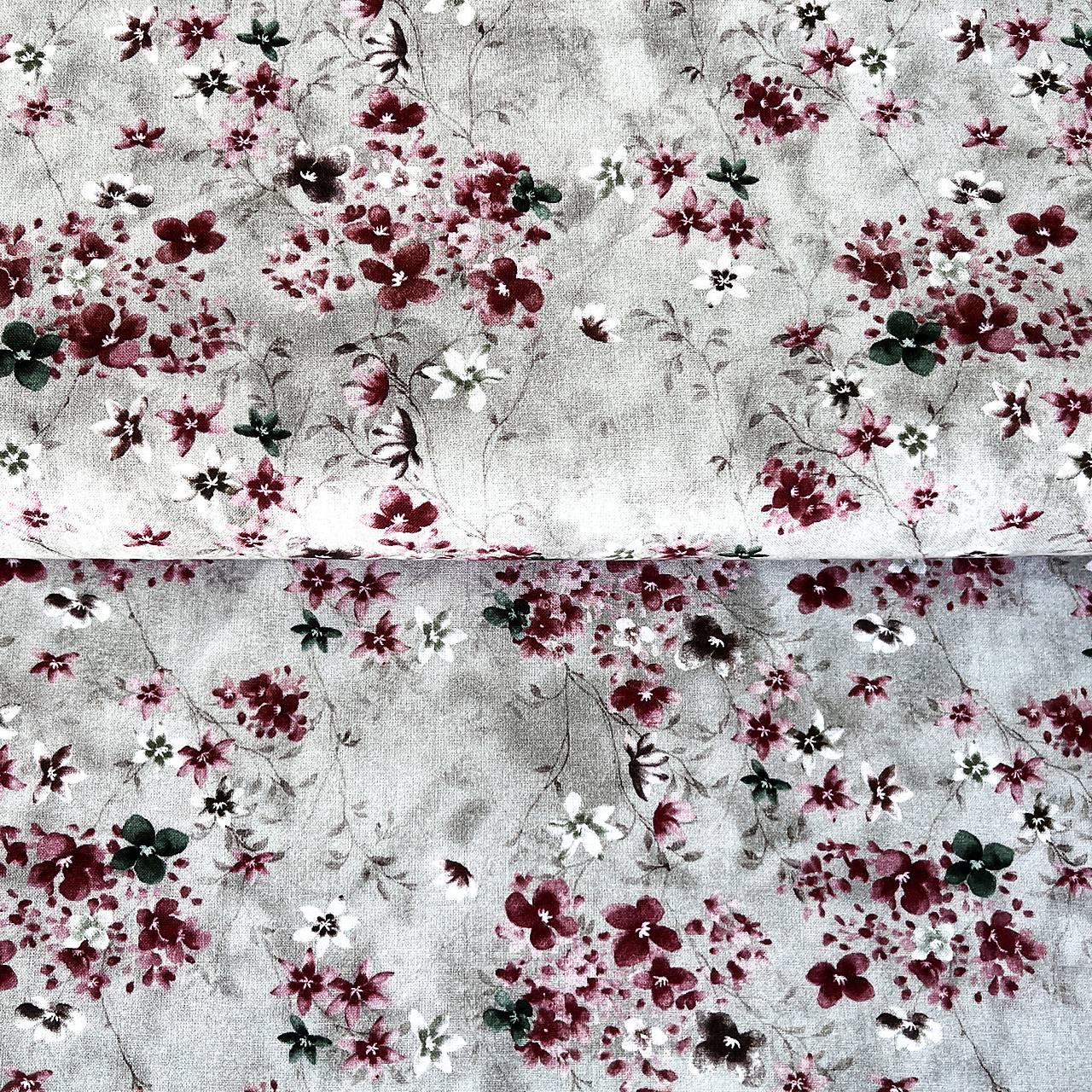 Popelínová bavlnená látka so vzorom akvarelových drobných kvetov na farebnom podklade.