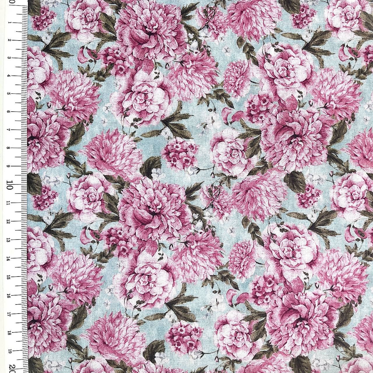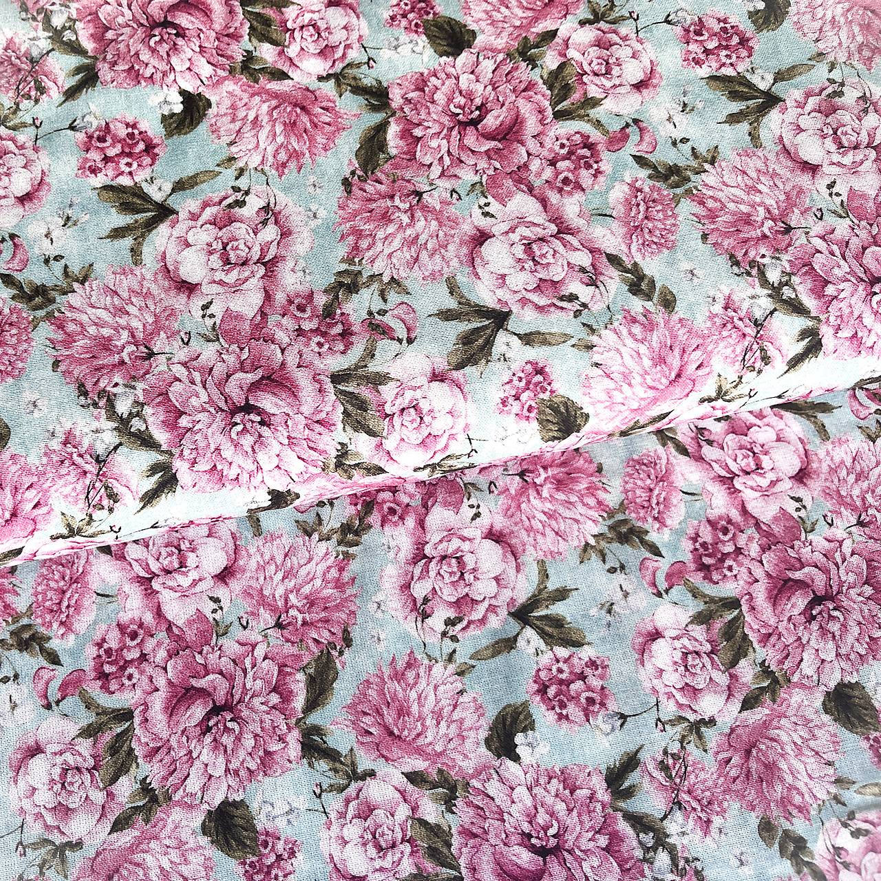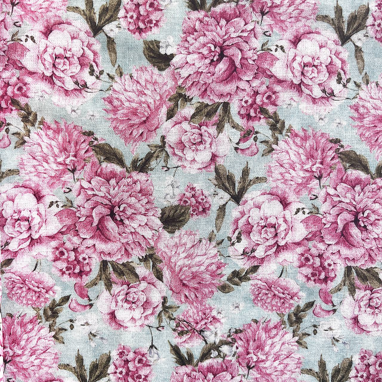 Popelínová bavlnená látka so vzorom akvarelových pivónií na modrosivom podklade.