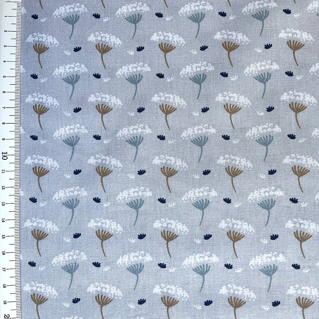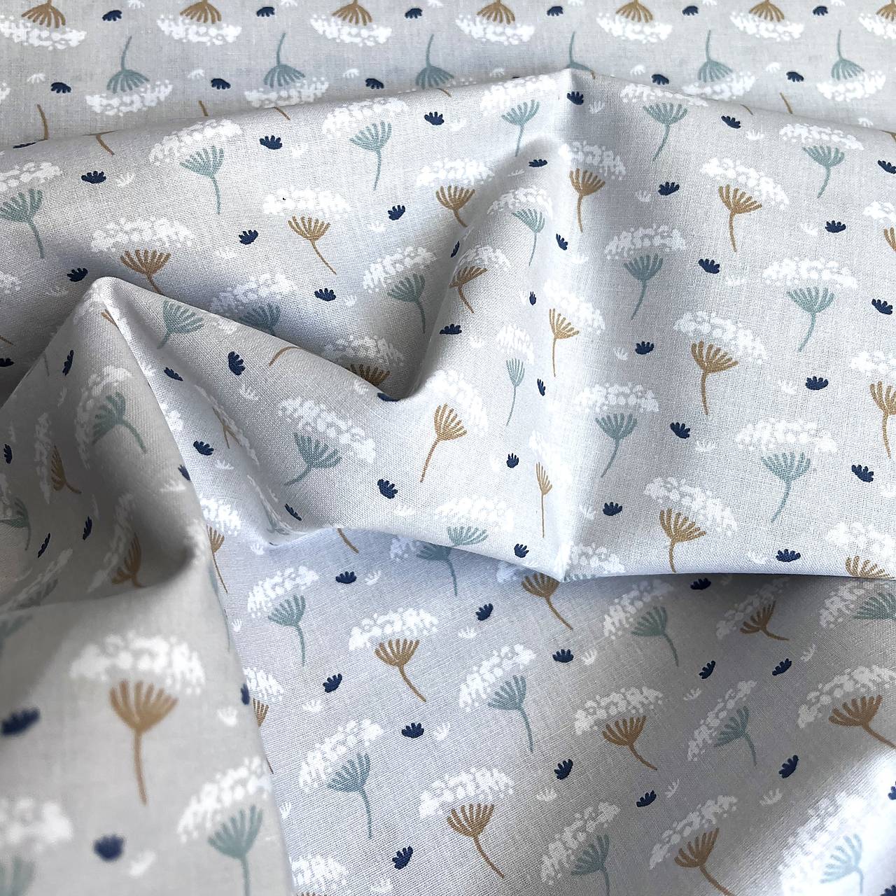 Popelínová bavlnená látka so vzorom okolíkových kvetiniek na sveetlomodrom poklade.