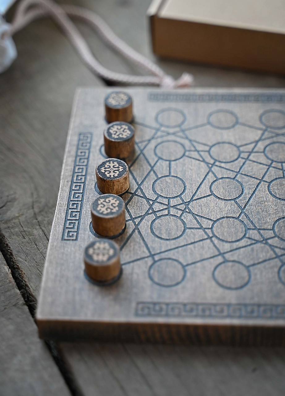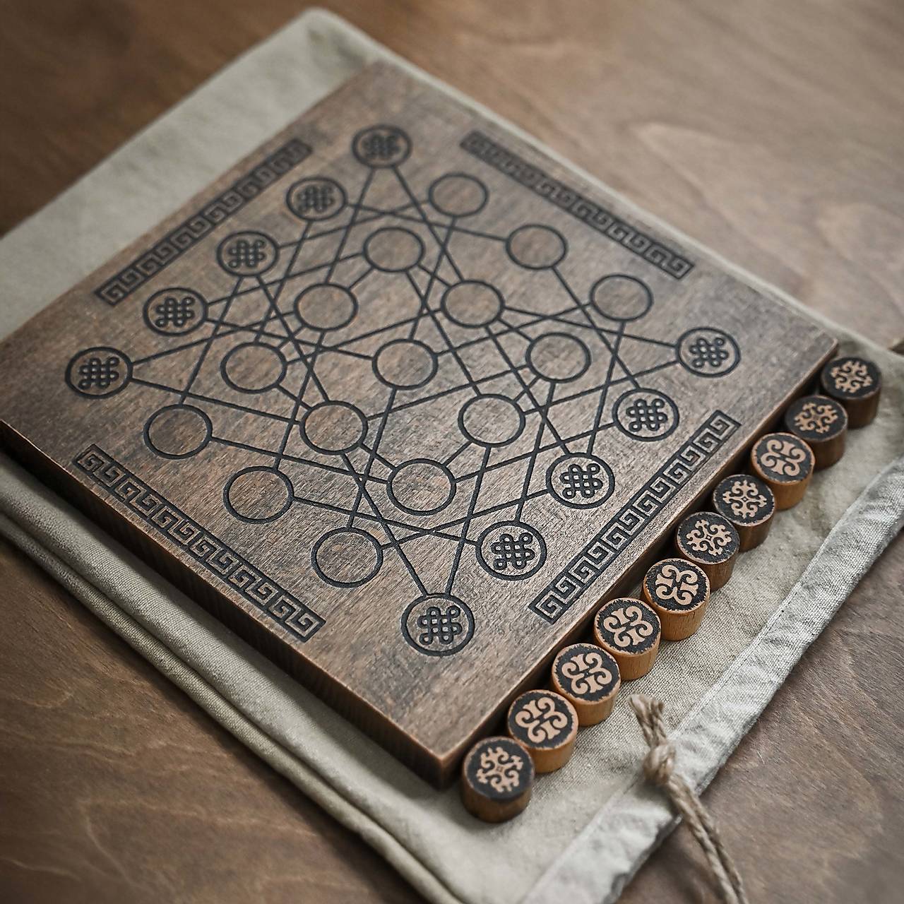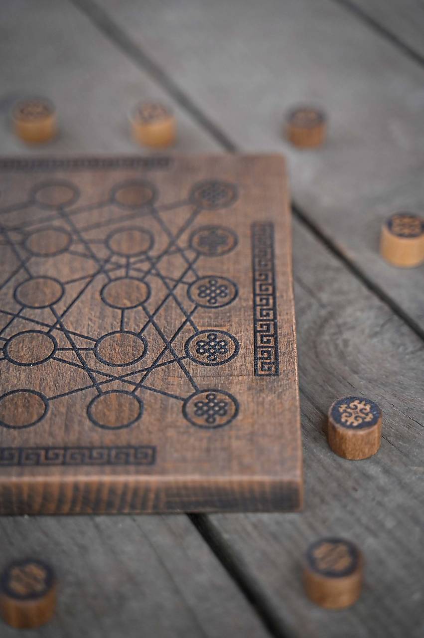 Handmade board game, every piece is original. Jarmo, a historical battle game of the Tatars. Jarmo is played on an area of 5 x 5 squares. Each player starts with five pieces standing in the first row. The goal of the game is to reach the opponent's first row with as many pieces as possible.