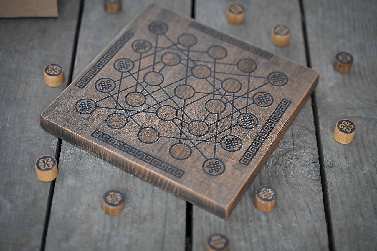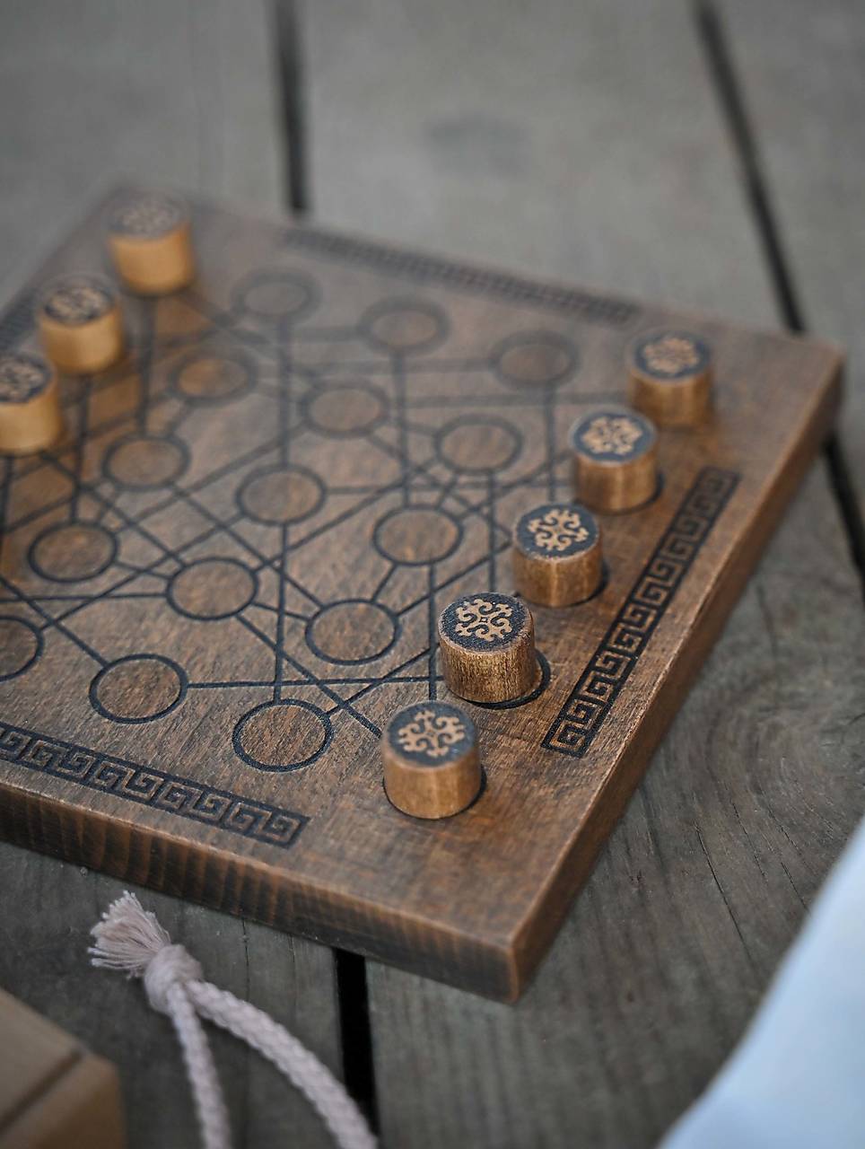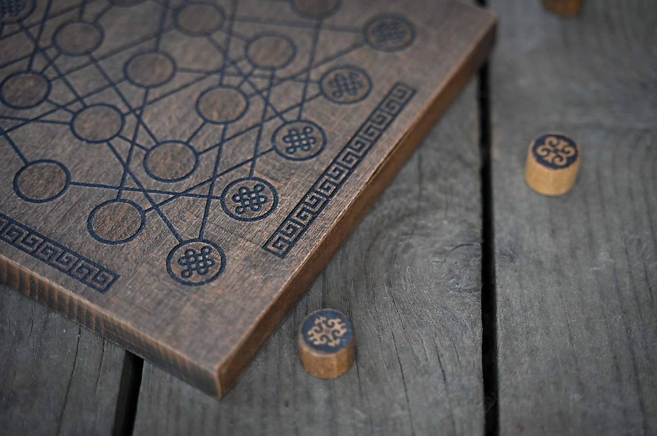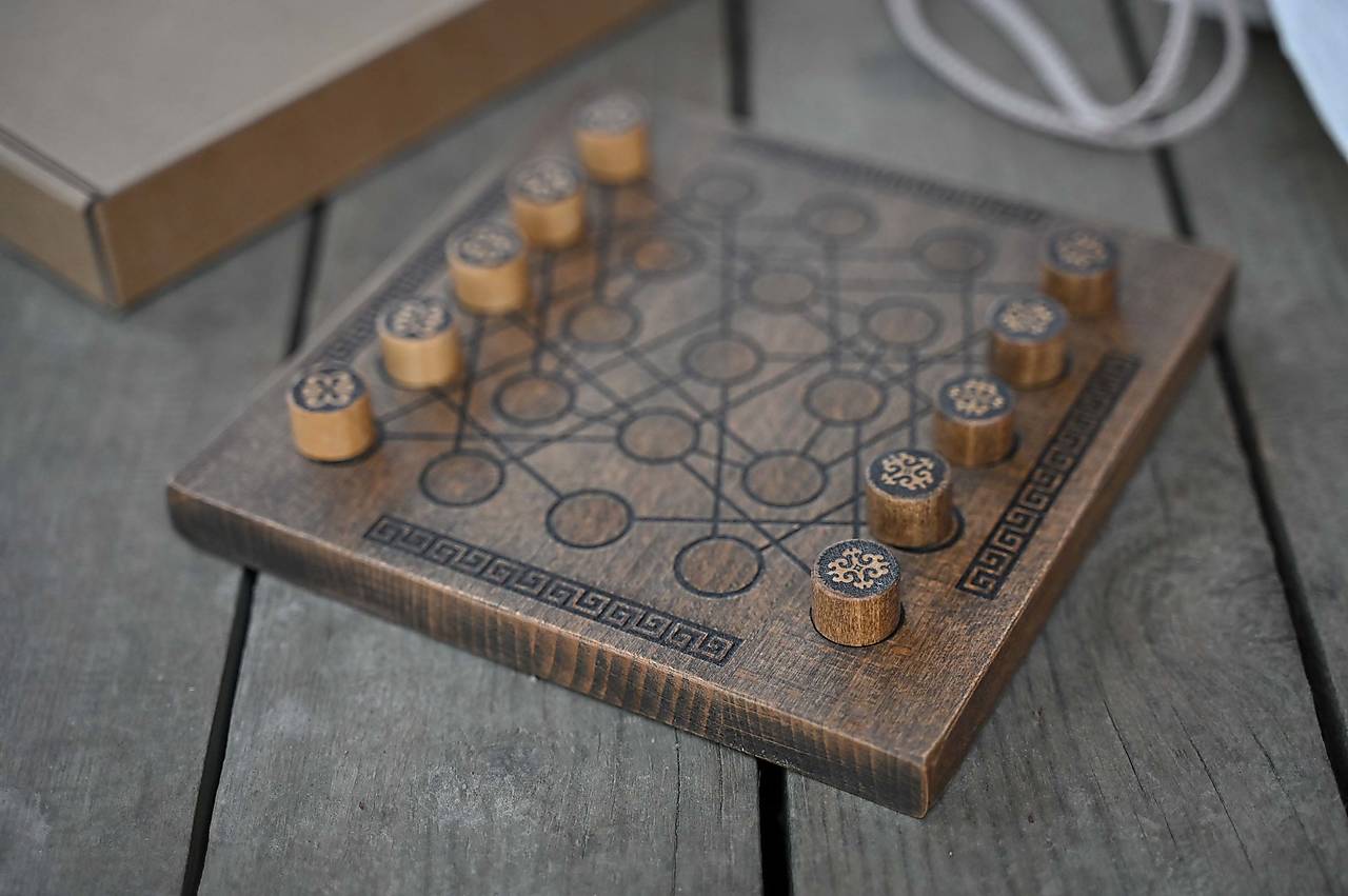Handmade board game, every piece is original. Jarmo, a historical battle game of the Tatars. Jarmo is played on an area of 5 x 5 squares. Each player starts with five pieces standing in the first row. The goal of the game is to reach the opponent's first row with as many pieces as possible.
