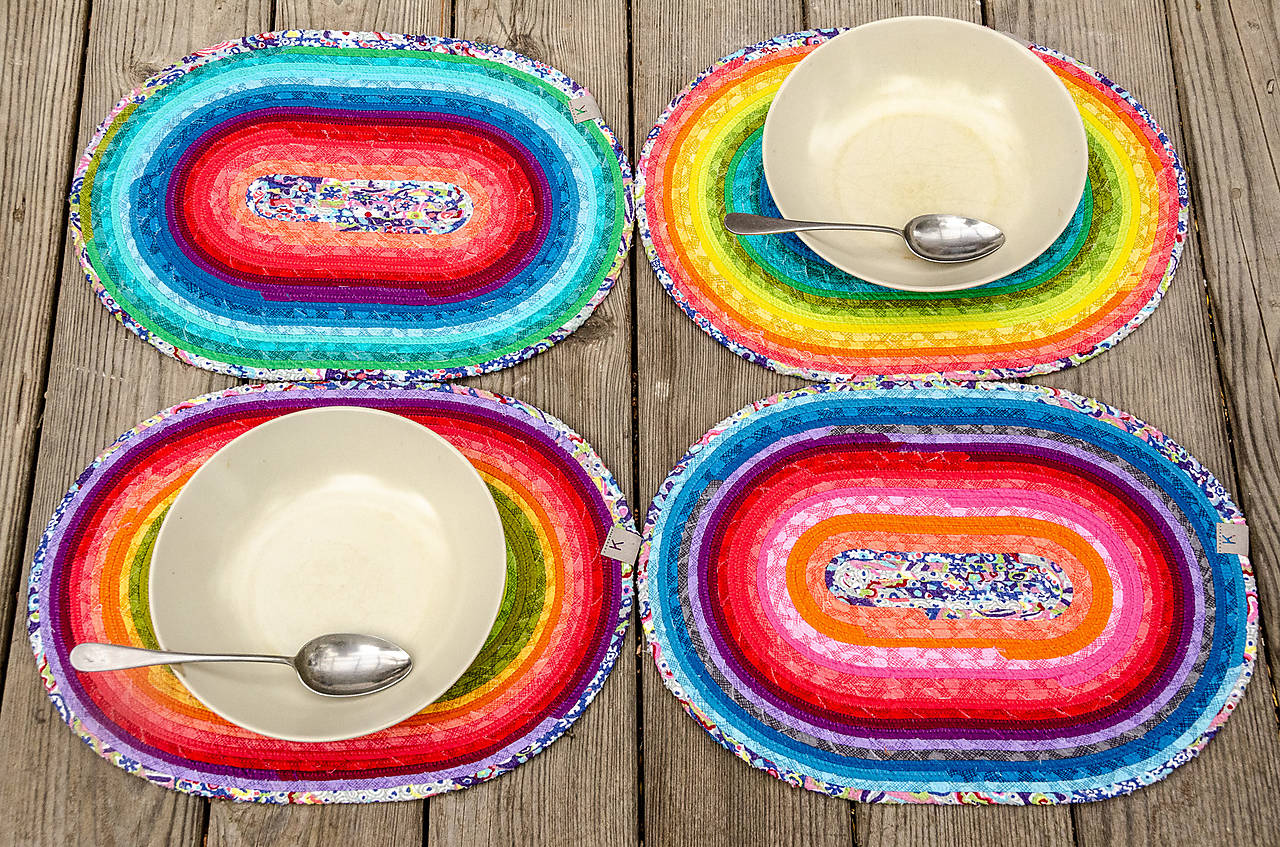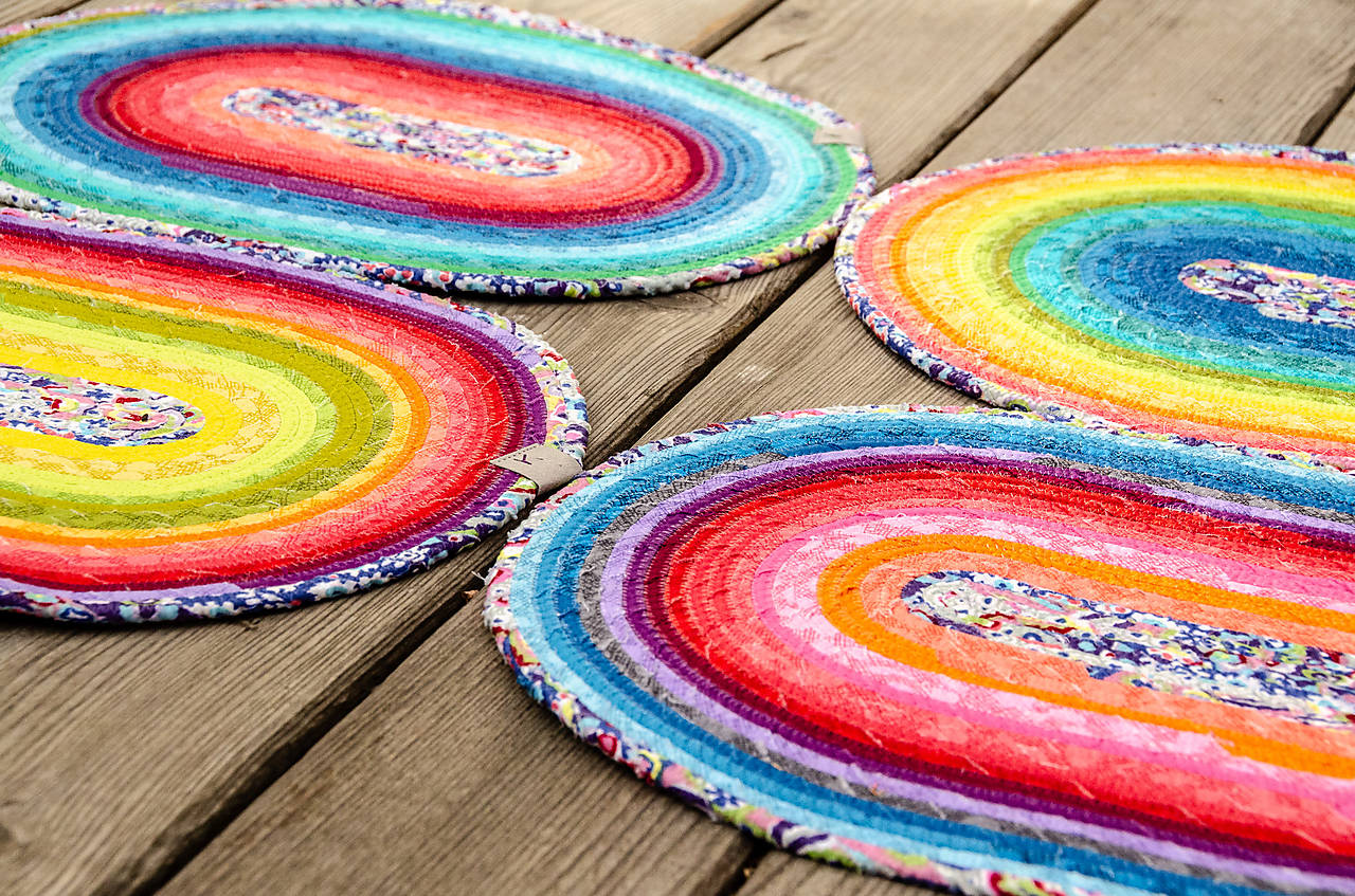 Prostírání ze šňůry je vyrobené sešitím bavlněné šňůry, omotané různobarevnými látkami.