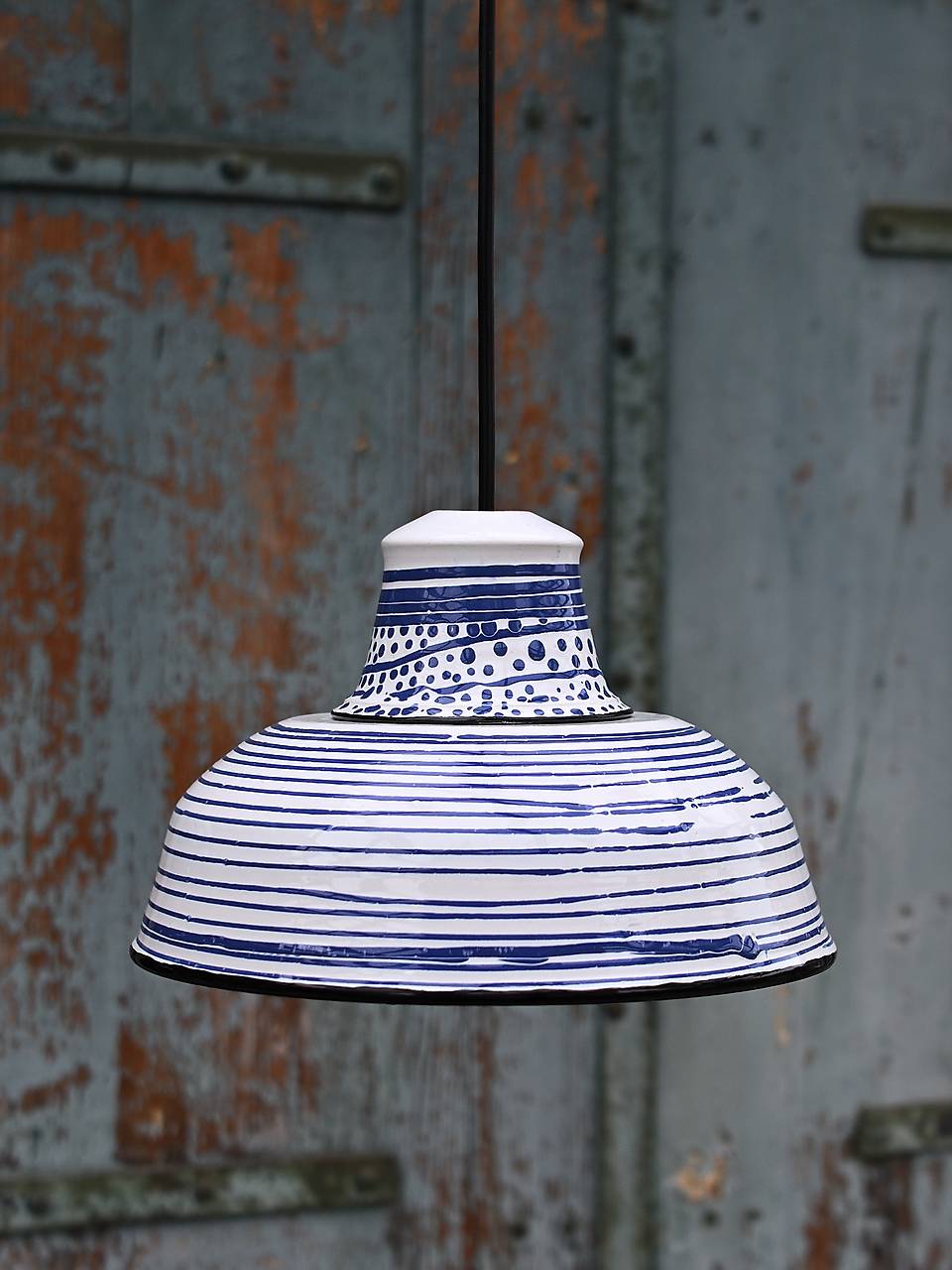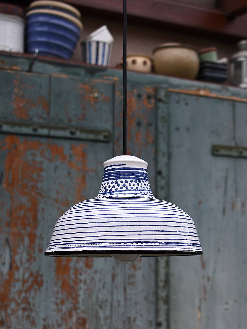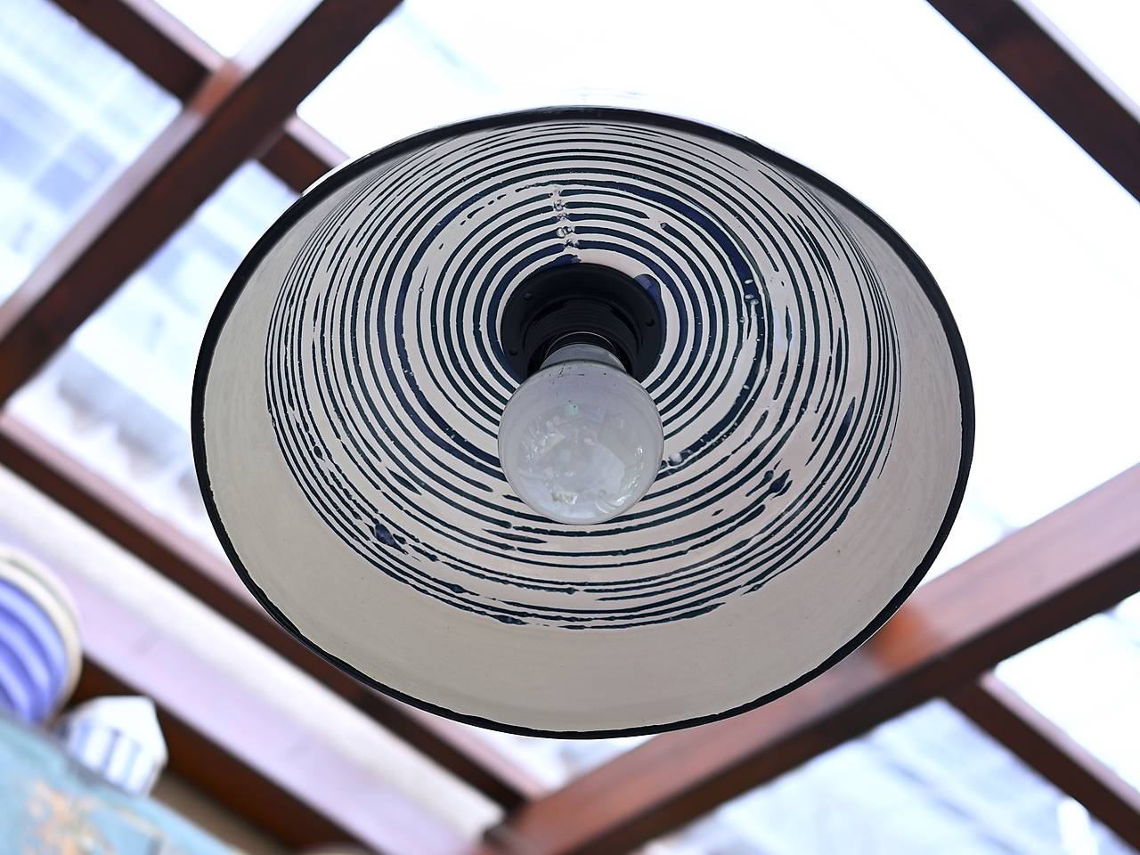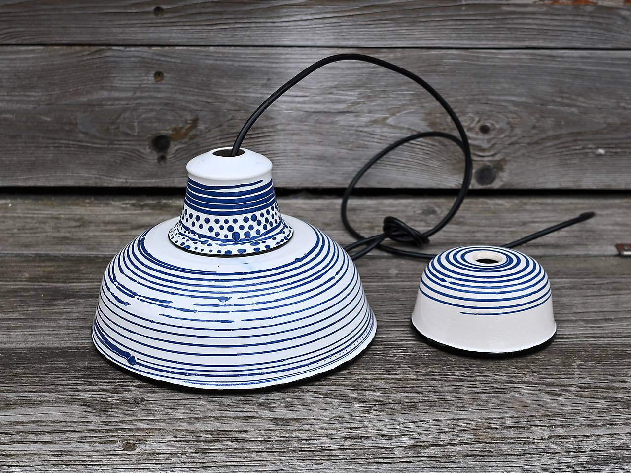 Keramický lustr v „plechovém stylu“ je vytvořen na hrnčířském kruhu. Celý komplet sestává ze stínítka, kloboučku volně umístěném na lustru, baldachýnu (krytka elektroinstalace a zavěšení u stropu). Vnitřní plocha stínítka je glazovaná v podobném dekoru jako vnější povrch.