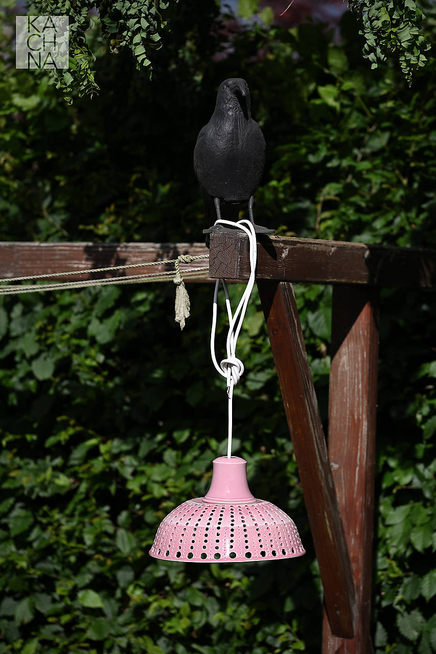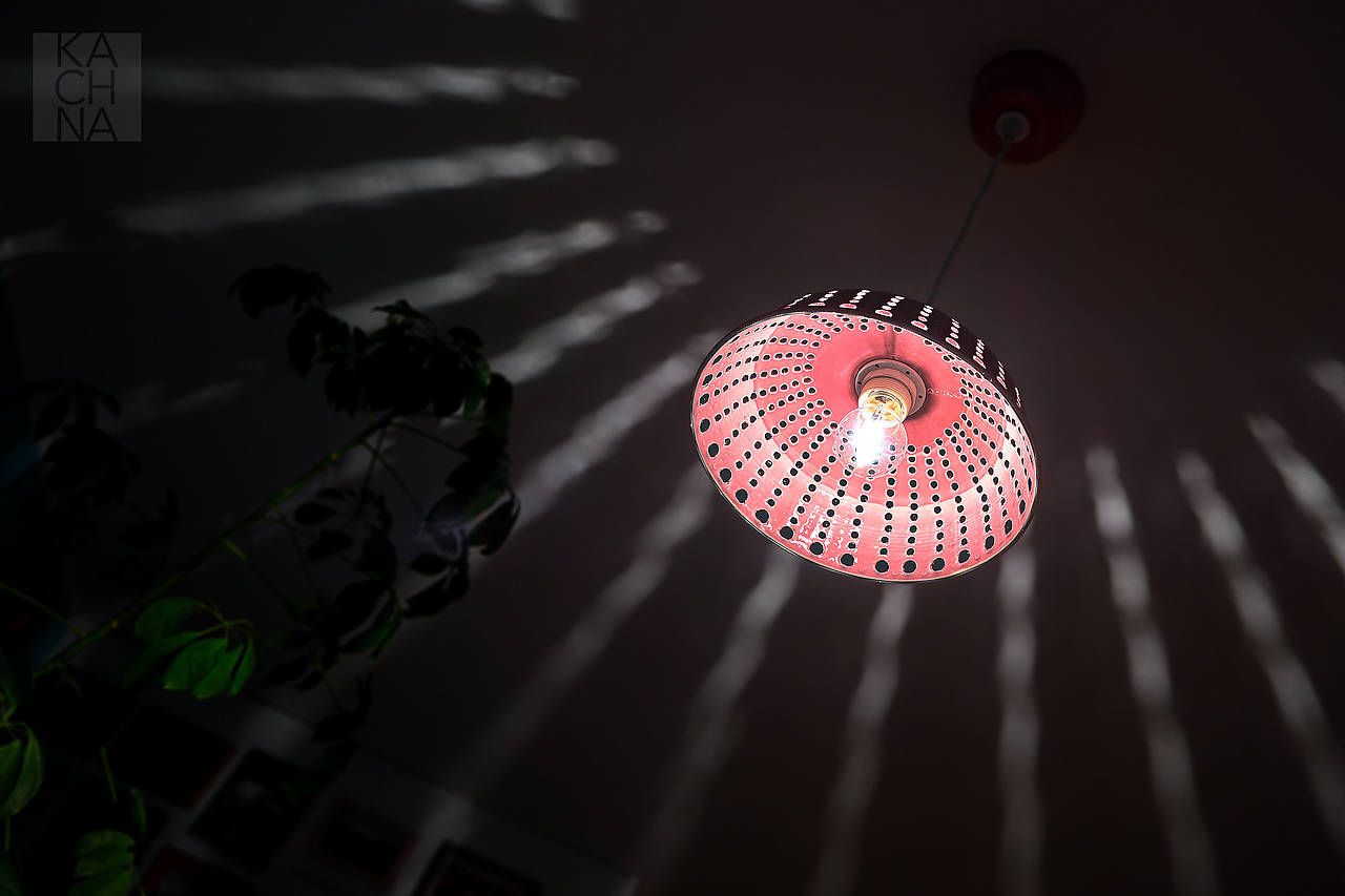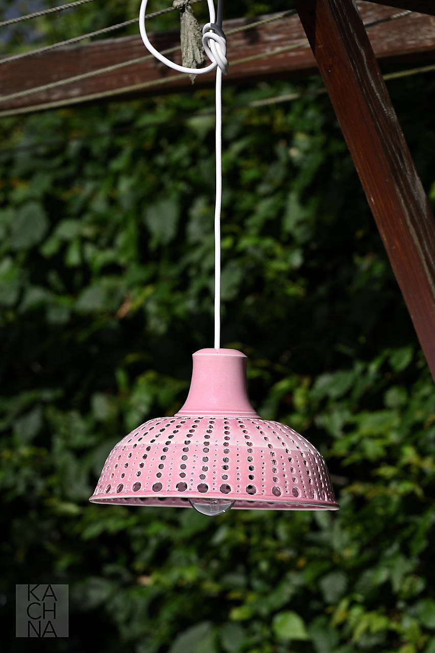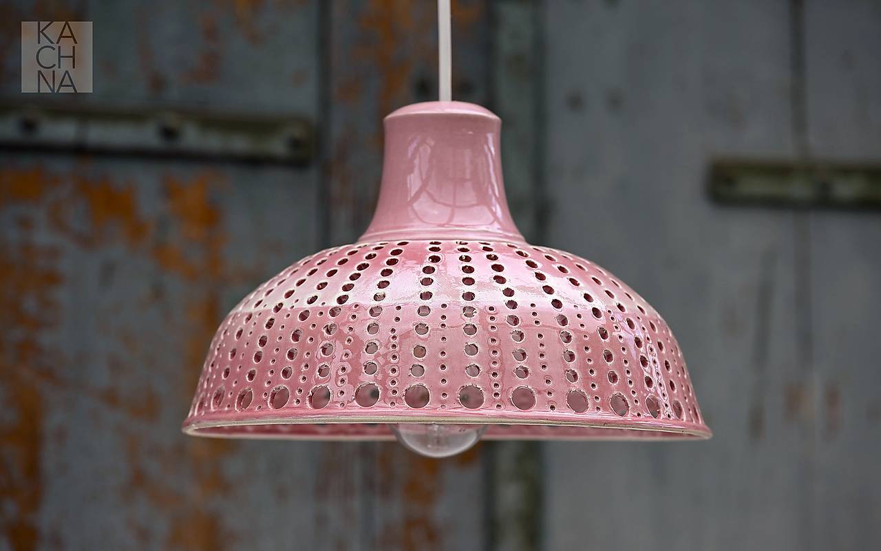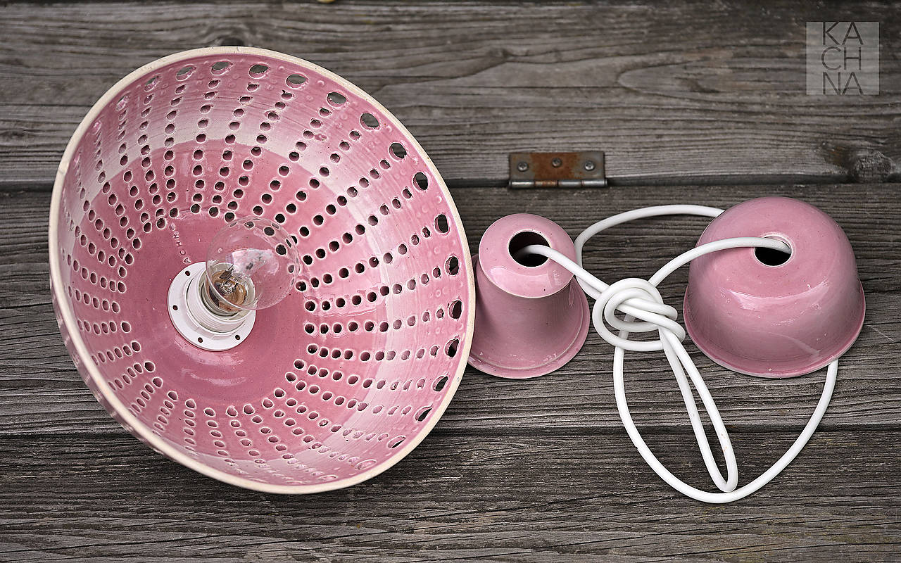Keramický lustr vyrobený na hrnčířském kruhu. Otvory ve stínítku vytváří večer v okolí lustru světelné obrazce a navozují příjemnou atmosféru. Glazované starorůžovou glazurou.