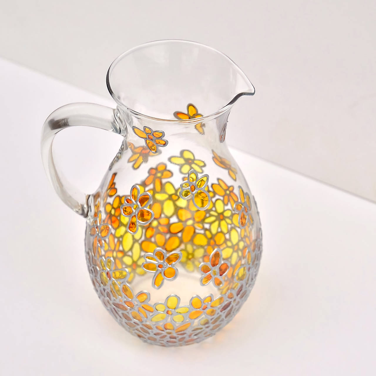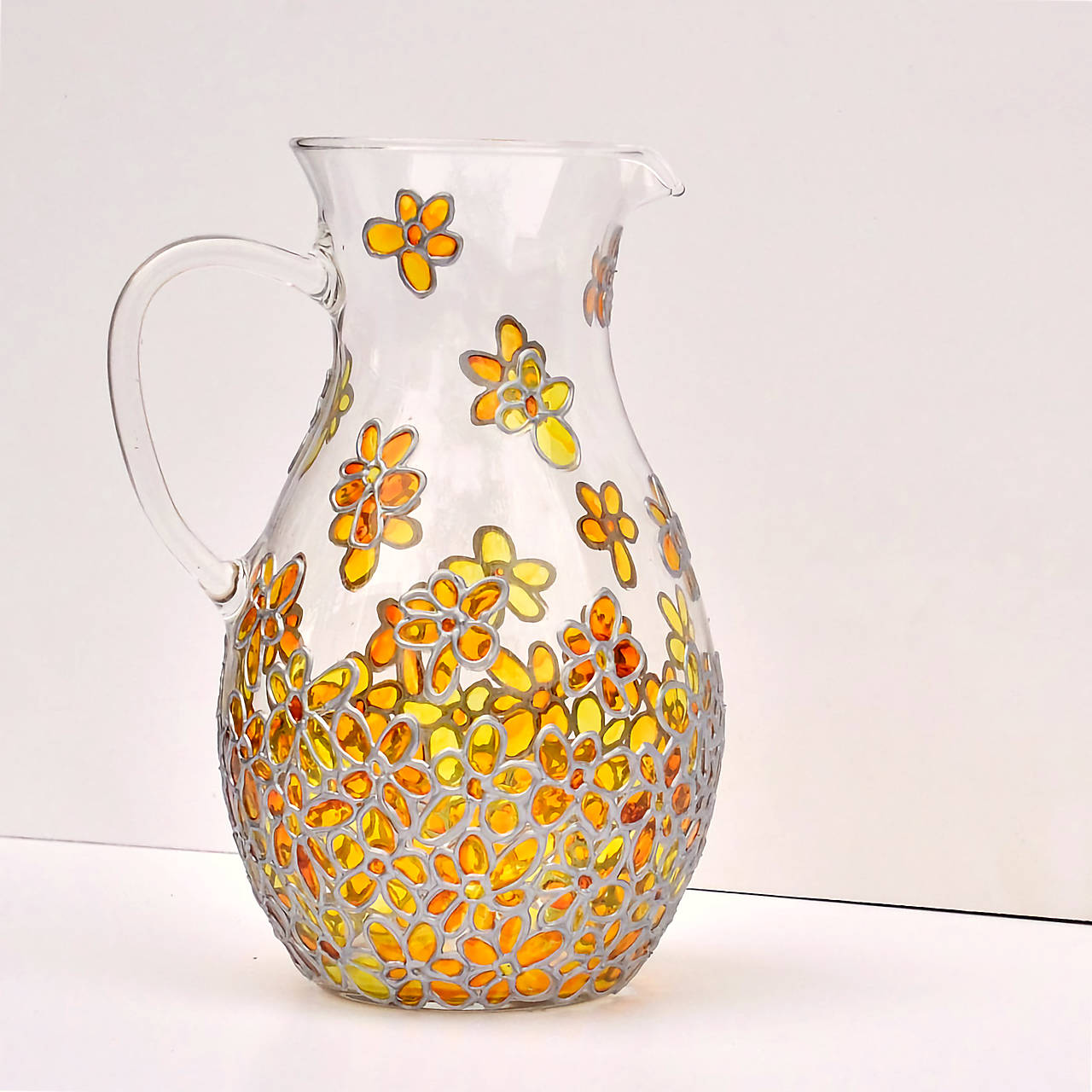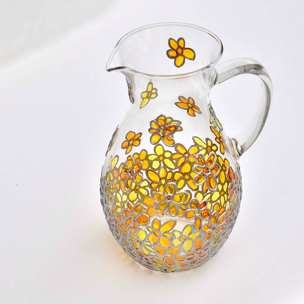 Ručně dekorovaný skleněný džbán s uchem. Barvy jsou lemované stříbrnou plastickou konturou. Džbán je vyrobený z varného skla, lze tedy použít i na horké nápoje. Dodržujte pitný režim! :-)