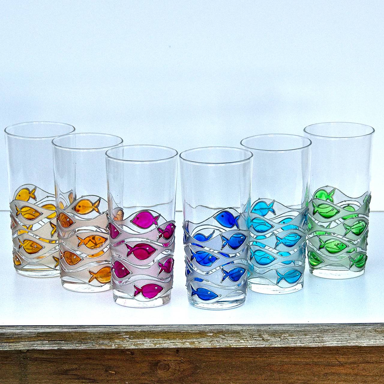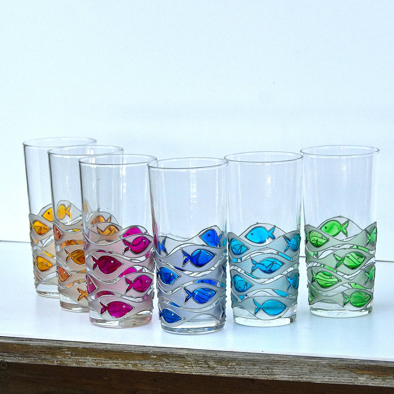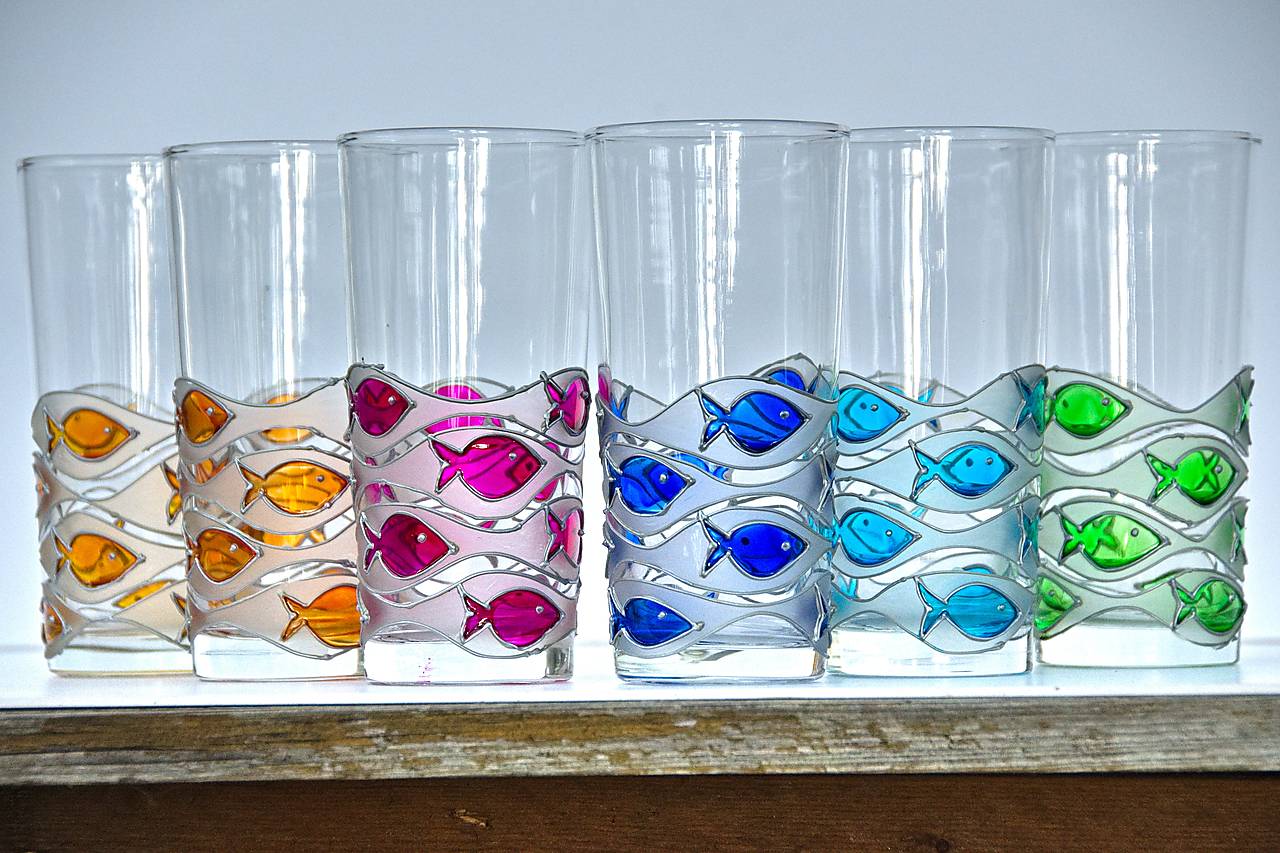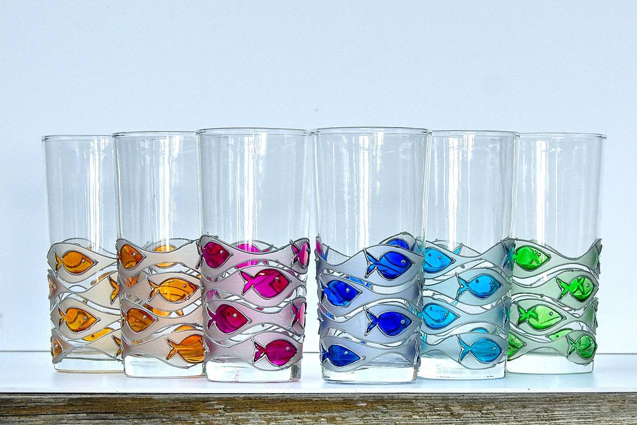 Sklenice dekorovaná barvami na sklo. Barvy jsou lemované stříbrnou plastickou konturou.