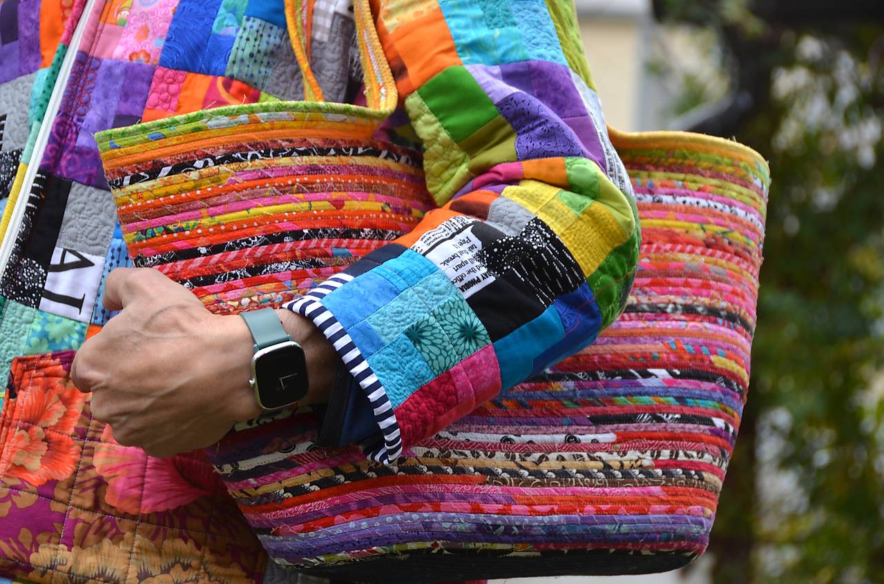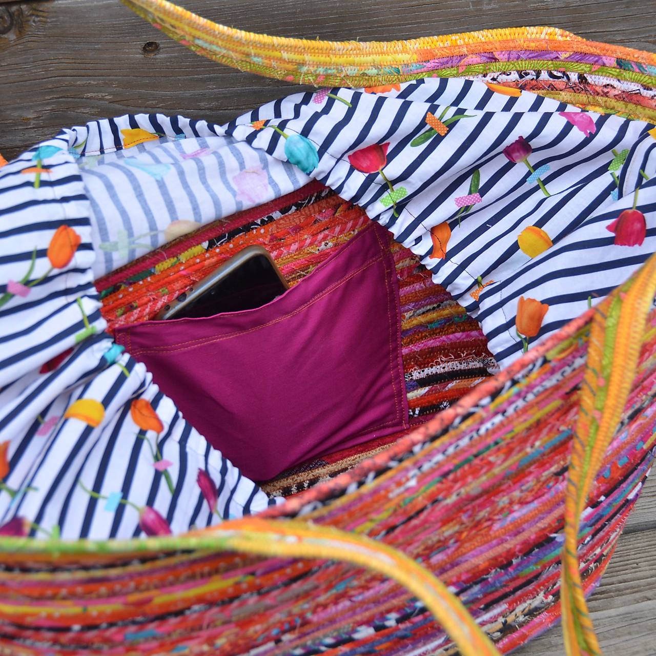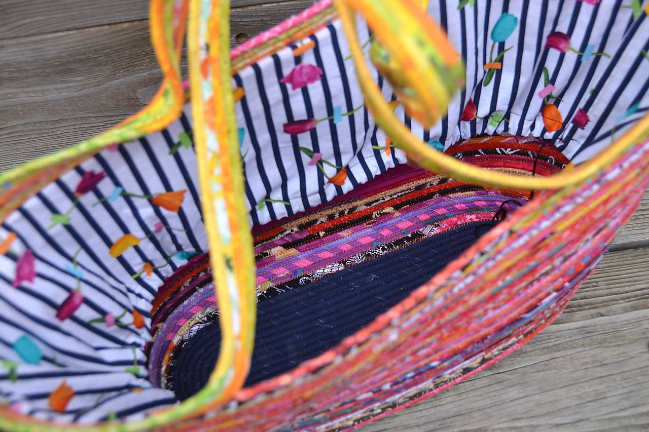 Taška, vyrobená sešitím bavlněné šňůry, omotané různobarevnými látkami. Obsah je chráněný vnitřní krycí látkou se stahováním šňůrkou. Uvnitř je taška doplněná praktickou kapsou (na mobil, doklady…).