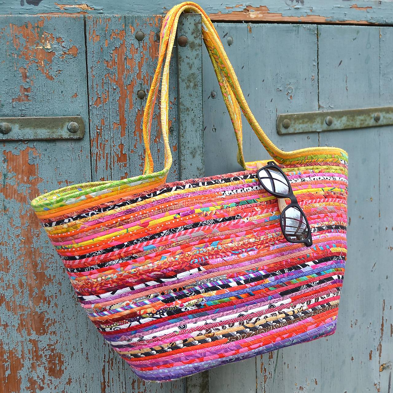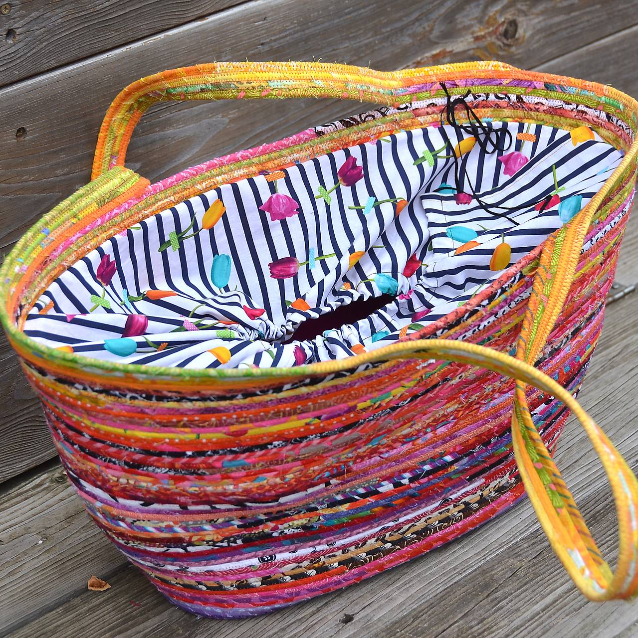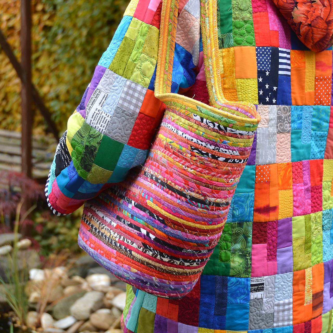 Taška, vyrobená sešitím bavlněné šňůry, omotané různobarevnými látkami. Obsah je chráněný vnitřní krycí látkou se stahováním šňůrkou. Uvnitř je taška doplněná praktickou kapsou (na mobil, doklady…).