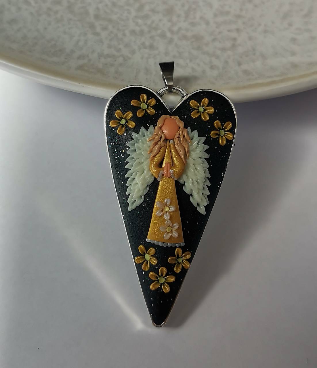 Autorský šperk-anjel je vytvorený modelovaním z polymérovej hmoty do kovového lôžka.