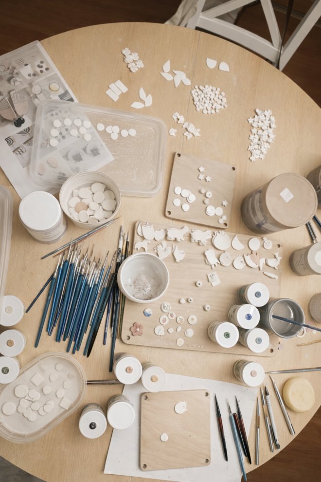 Z týchto fotografií vznikli prvé rýchle skice v malom zošite, často večer pri kuchynskom stole. Keď ich mala na stole desiatky, bolo jasné, že už nejde len o poznámky. V ateliéri v Bratislave začala tieto obrazy čistiť od všetkého, čo nebolo podstatné: zložité tvary domov zmenila na jednoduché bloky a oblúky, nechala len plochy hliny, kúsok modrej oblohy alebo vody, biele plátno prádla. Ľudí z obrazov úplne vypustila – zostali po nich len predmety, ktoré používajú každý deň.