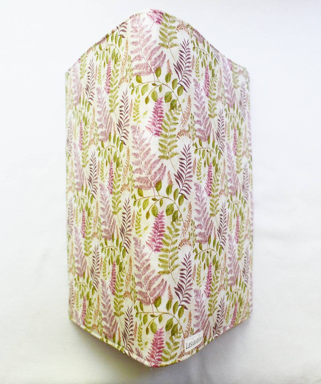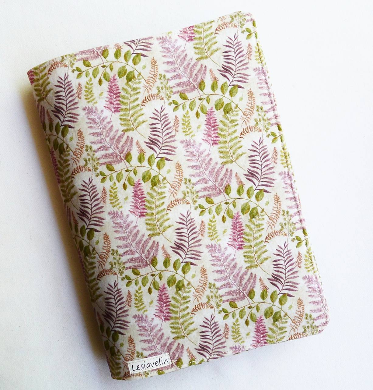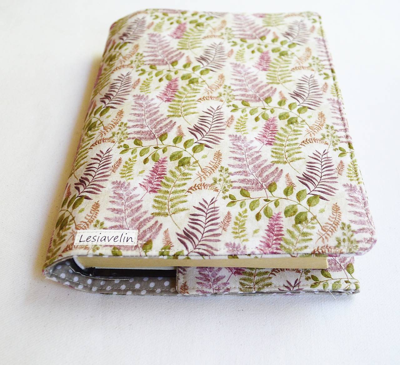 Obal na knihu som ušila z bavlnenej látky, s potlačou papradia. Má nastaviteľnú veľkosť - dá sa prisôsobiť hrúbke knihy. Je vystužený a podšitý, tak bezpečne ochráni knihy, pri prenášaní, cestovaní. Vnútro je z bežovej bodkovanej bavlny.