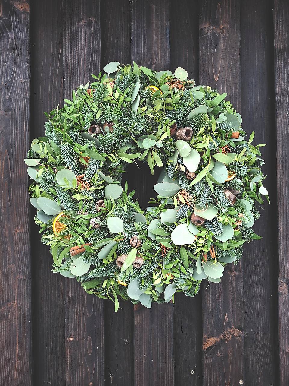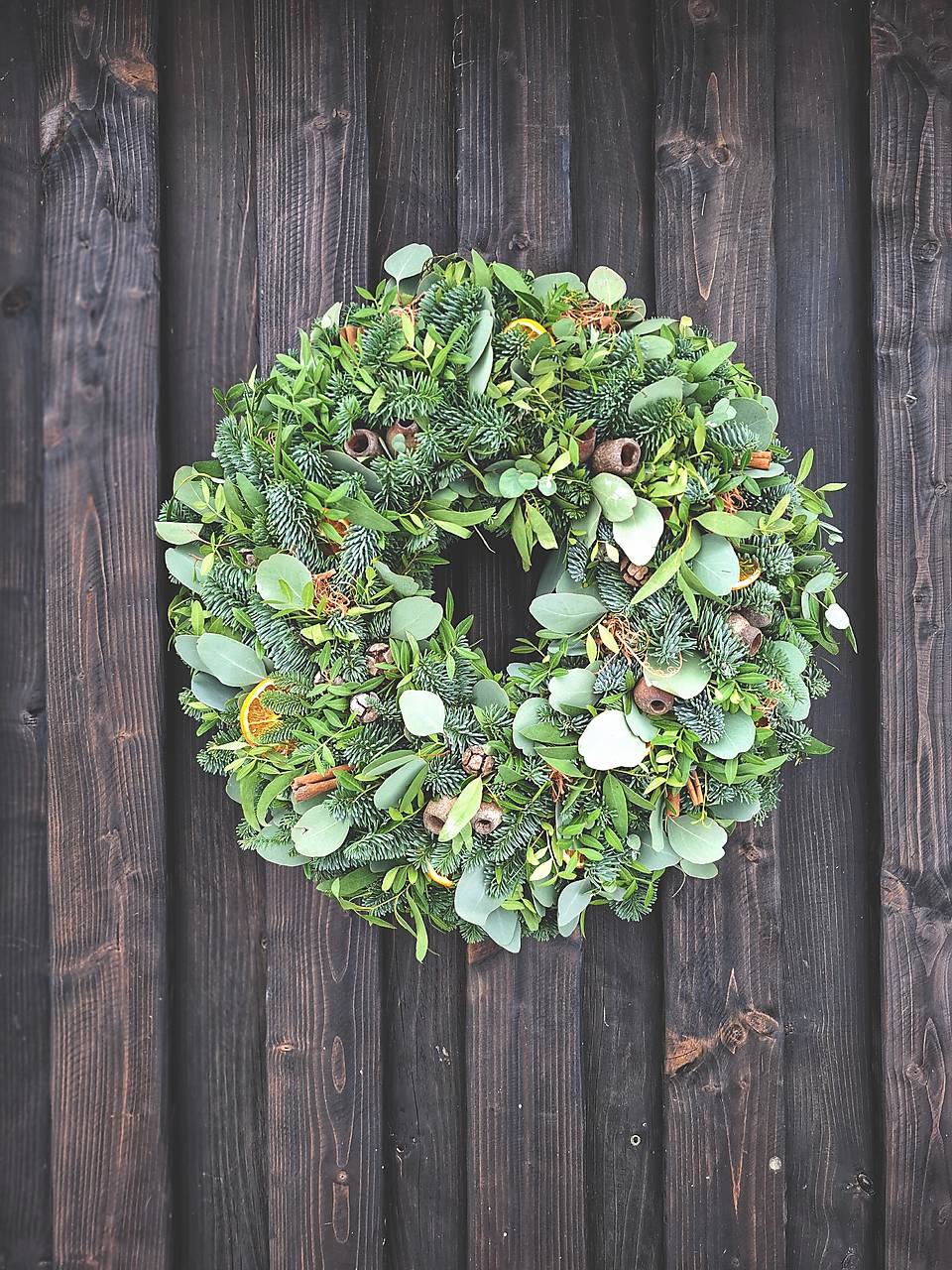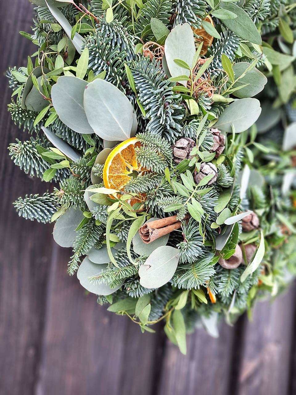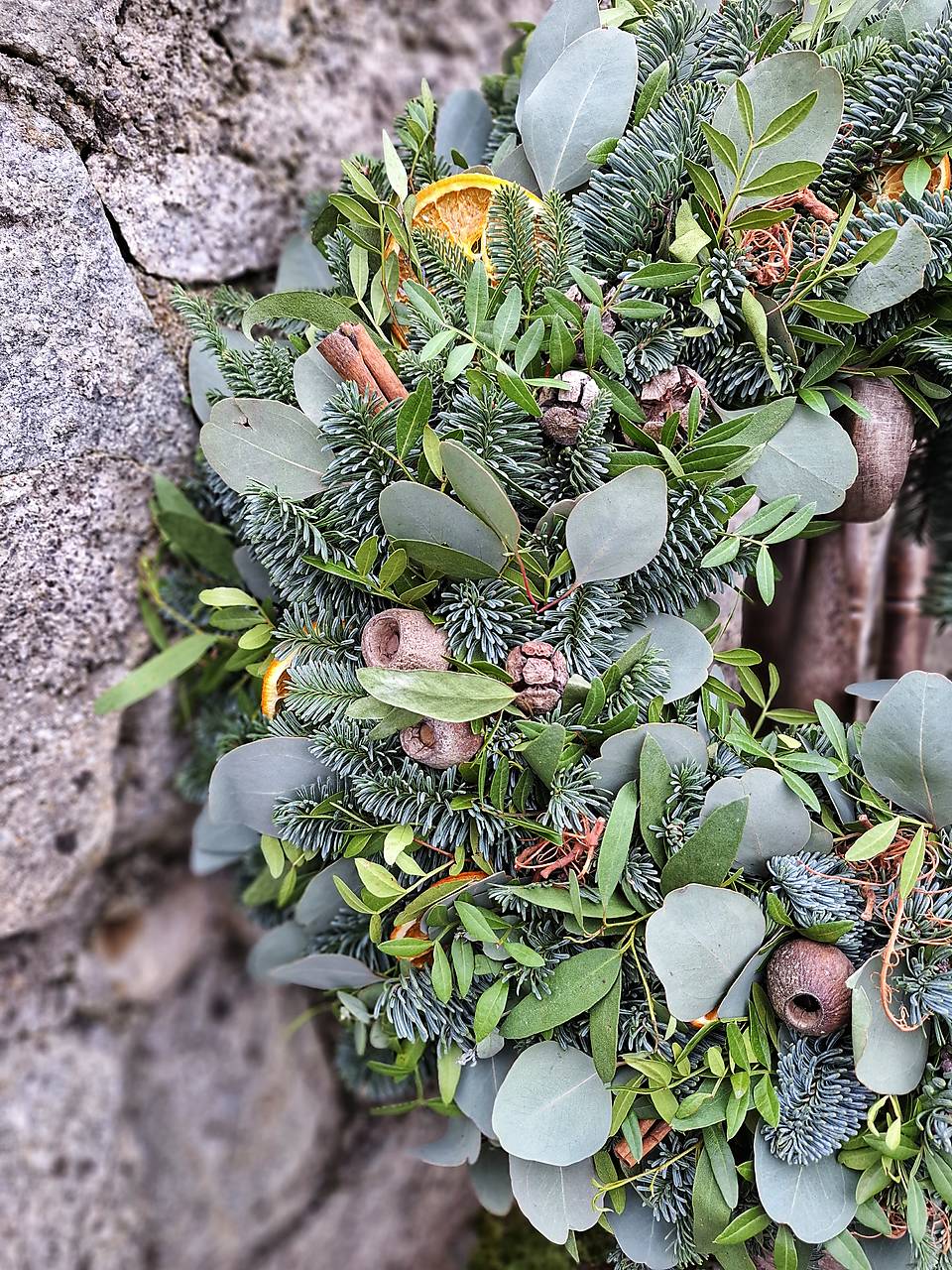 Zeleň dopĺňajú sušené pomaranče, škorica, curli moss, cypruštekové šišky, eukalyptové plody bell gum.