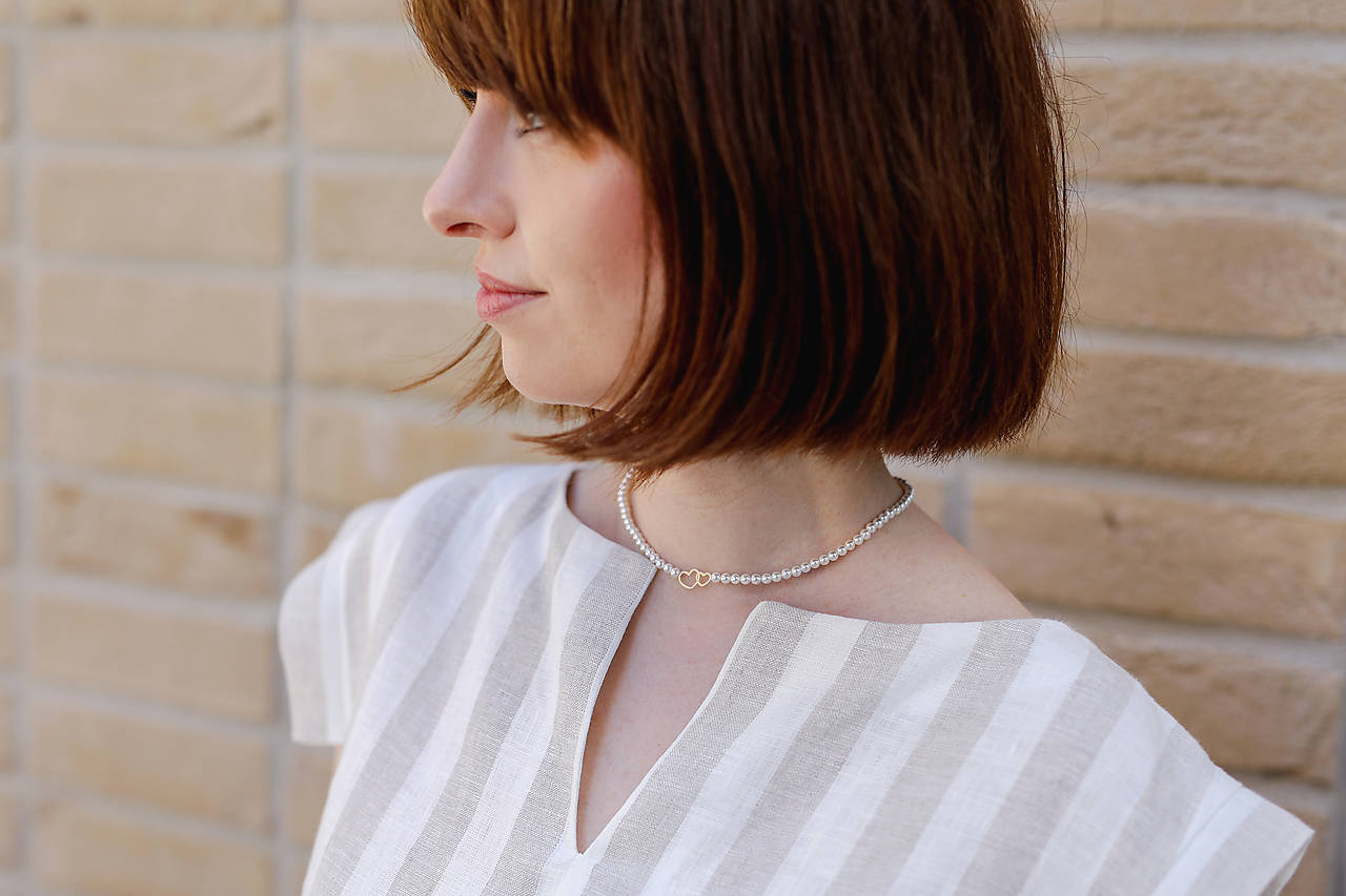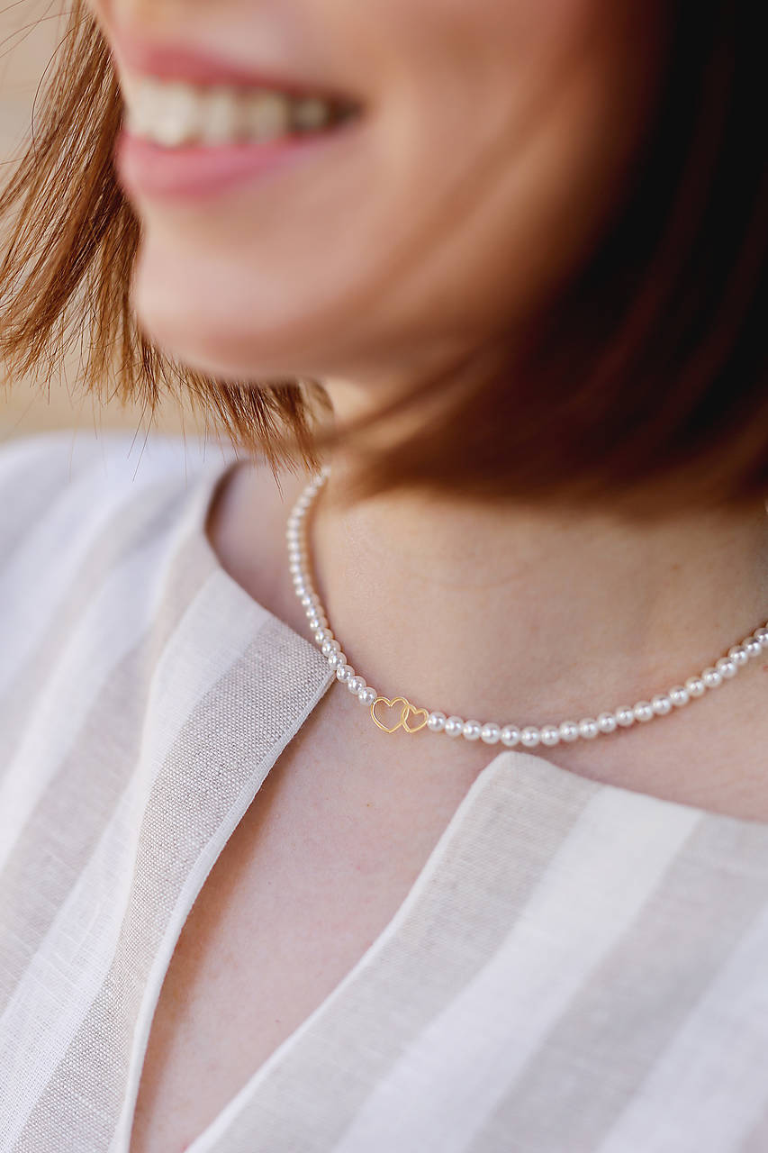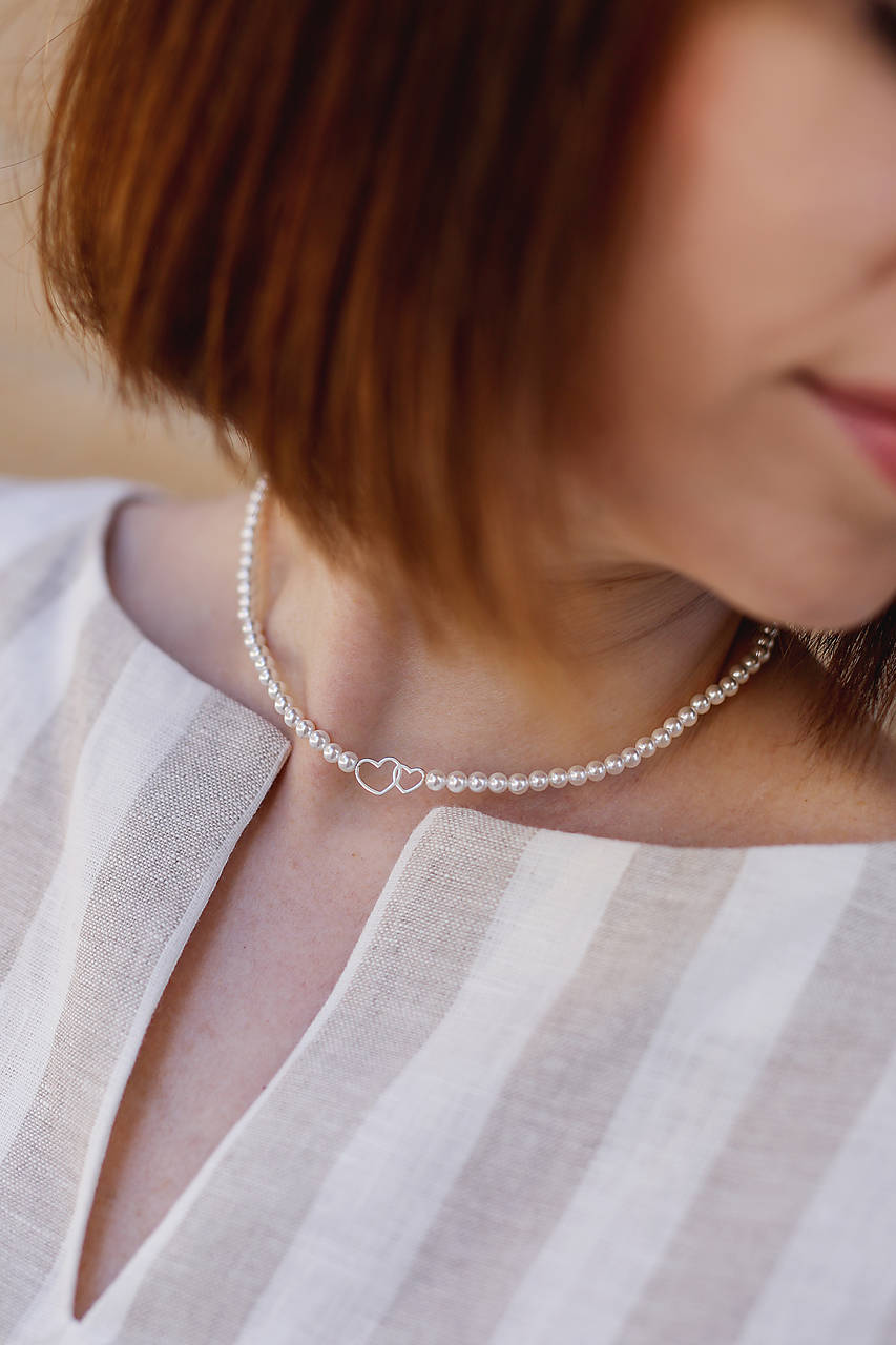 Minimalistický náhrdelník z mušľových (shell) perál na silone s magnetickým zapínaním z chirurgickej ocele a strieborným príveskom dvoch srdiečok. Ideálny ako na každodenné nosenie, tak aj na špeciálne príležitosti (svadba, krst, oslava, či iná spoločenská udalosť) K striebornej verzii náhrdelníku obdržíte aj handričku na údržbu strieborných šperkov (v prípade ak o ňu nemáte záujem poprosím uviesť do poznámky).