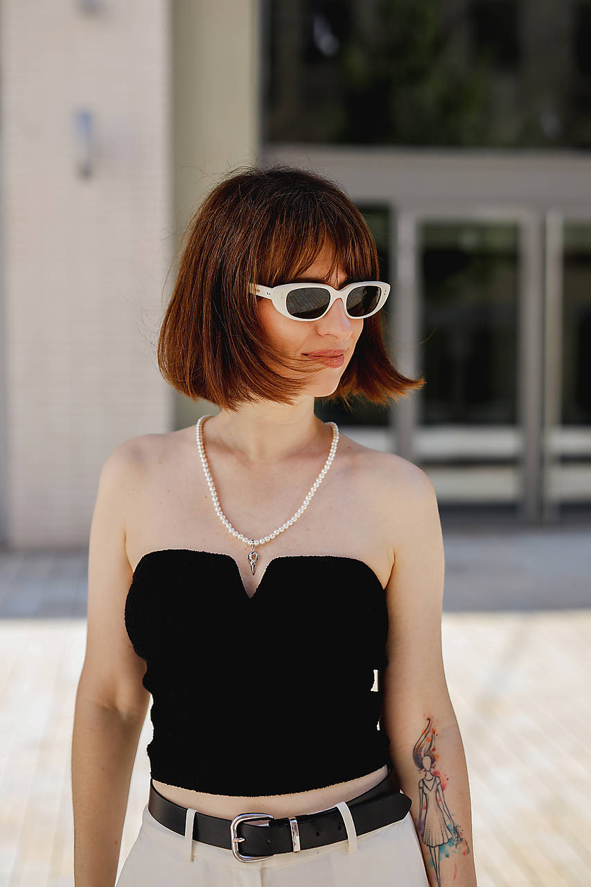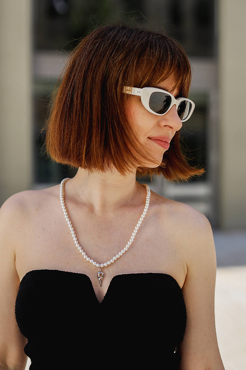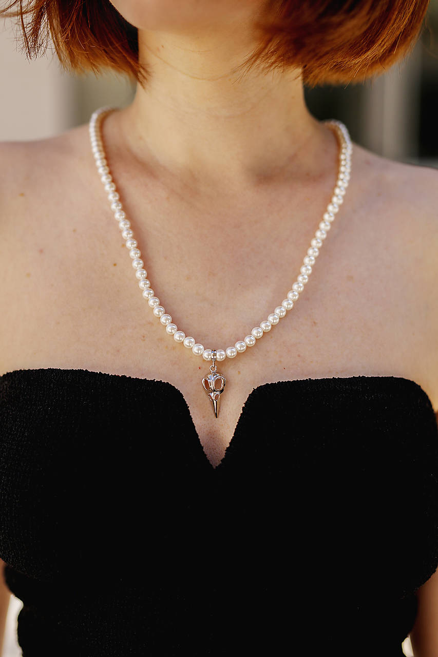 Minimalistický náhrdelník z mušľových (shell) perál na silone s magnetickým zapínaním z chirurgickej ocele a strieborným príveskom lebky s vrstvou platiny. Ideálny ako na každodenné nosenie, tak aj na špeciálne príležitosti (oslava, či iná spoločenská udalosť) Jedná sa o univerzálny kúsok, ako pre ženy, tak aj pre mužov.