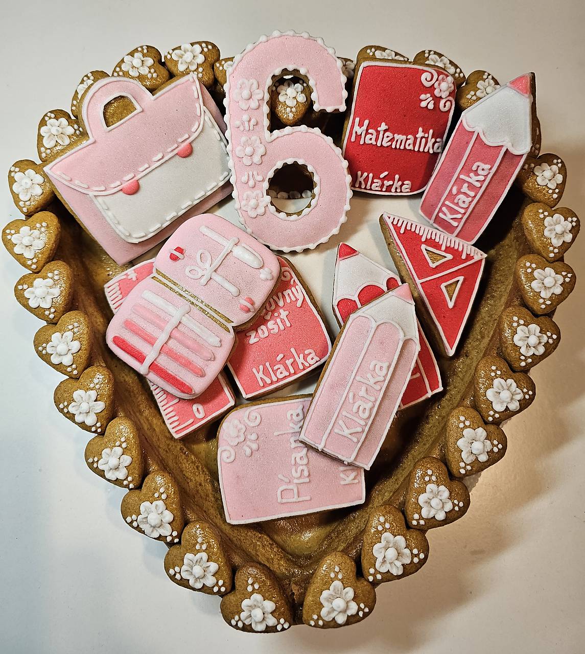 S láskou pečené a zdobené medovníkové zápichy na tortu (11 ks) rôznych tvarov na tému škola (číslo, školská taška, peračník, pravítka, pastelky, zošity). Sú rovnako chutné ako pekné, takže sú famóznou ozdobou torty. Zdobené sú cukrovou polevou zafarbenou jedlými potravinárskymi farbami. Na základe dohody je možné upiecť aj iné tvary.