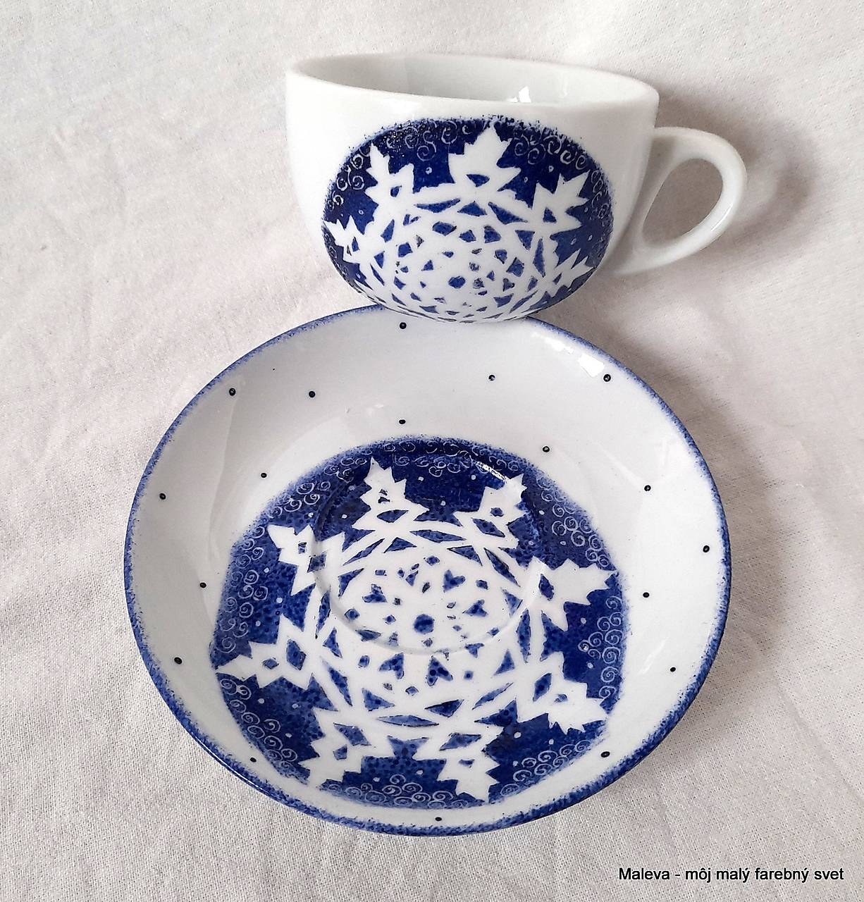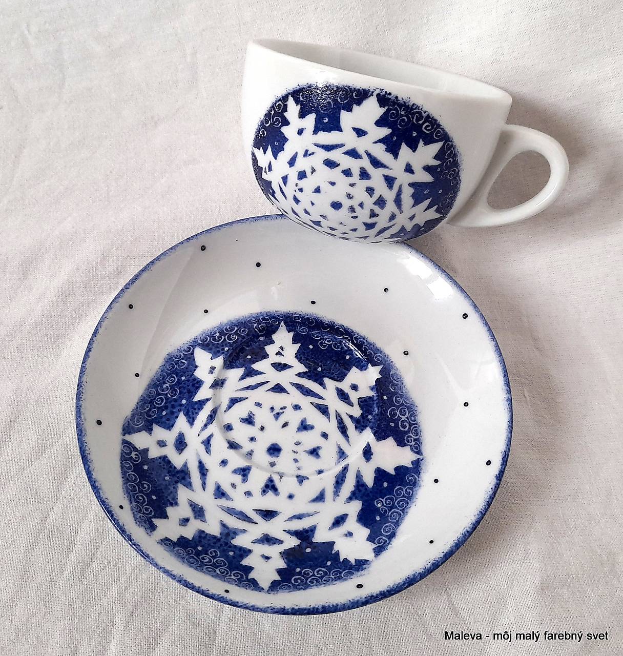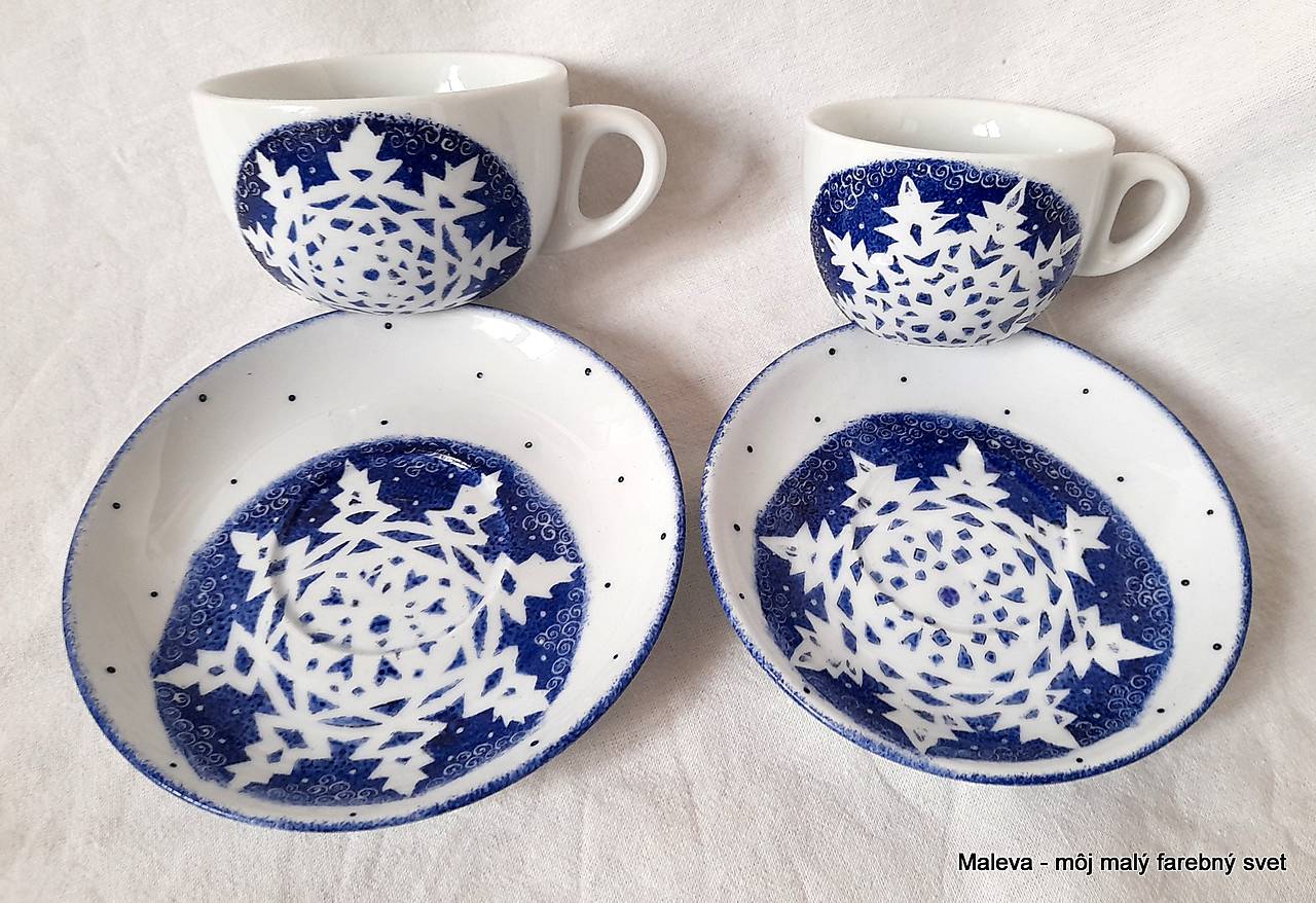 Ručne maľovaná šálka s podšálkou s motívom snehových vločiek.