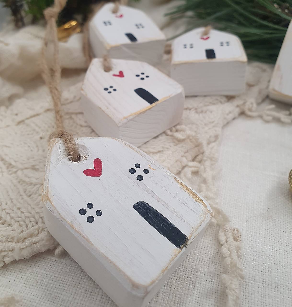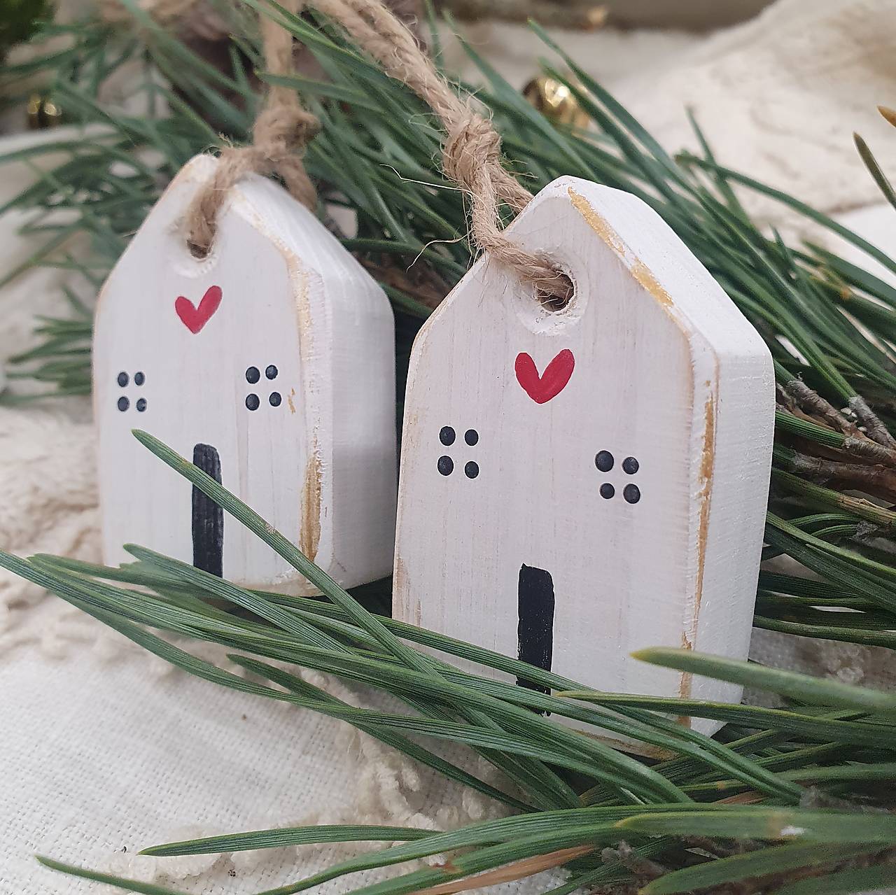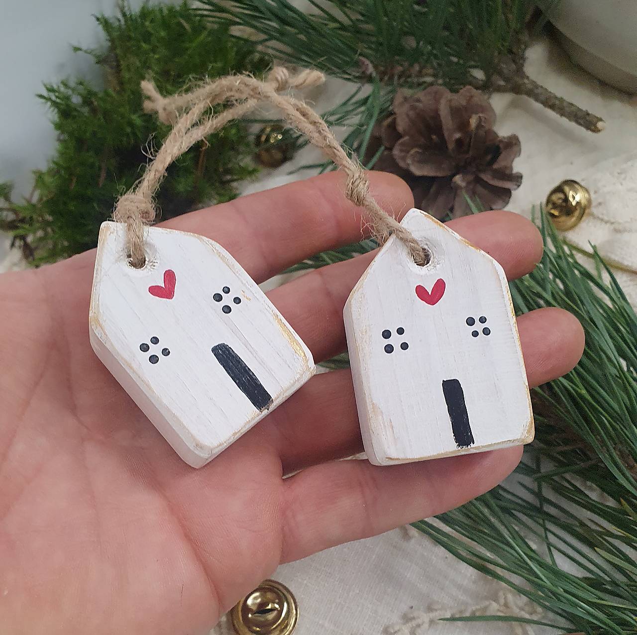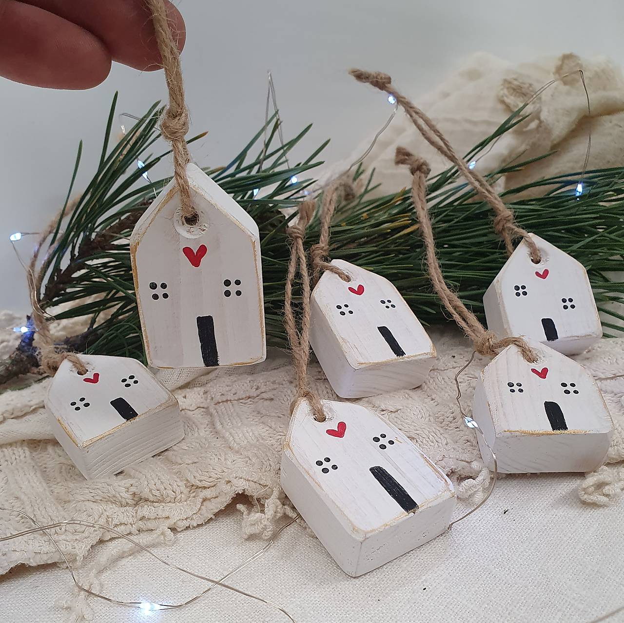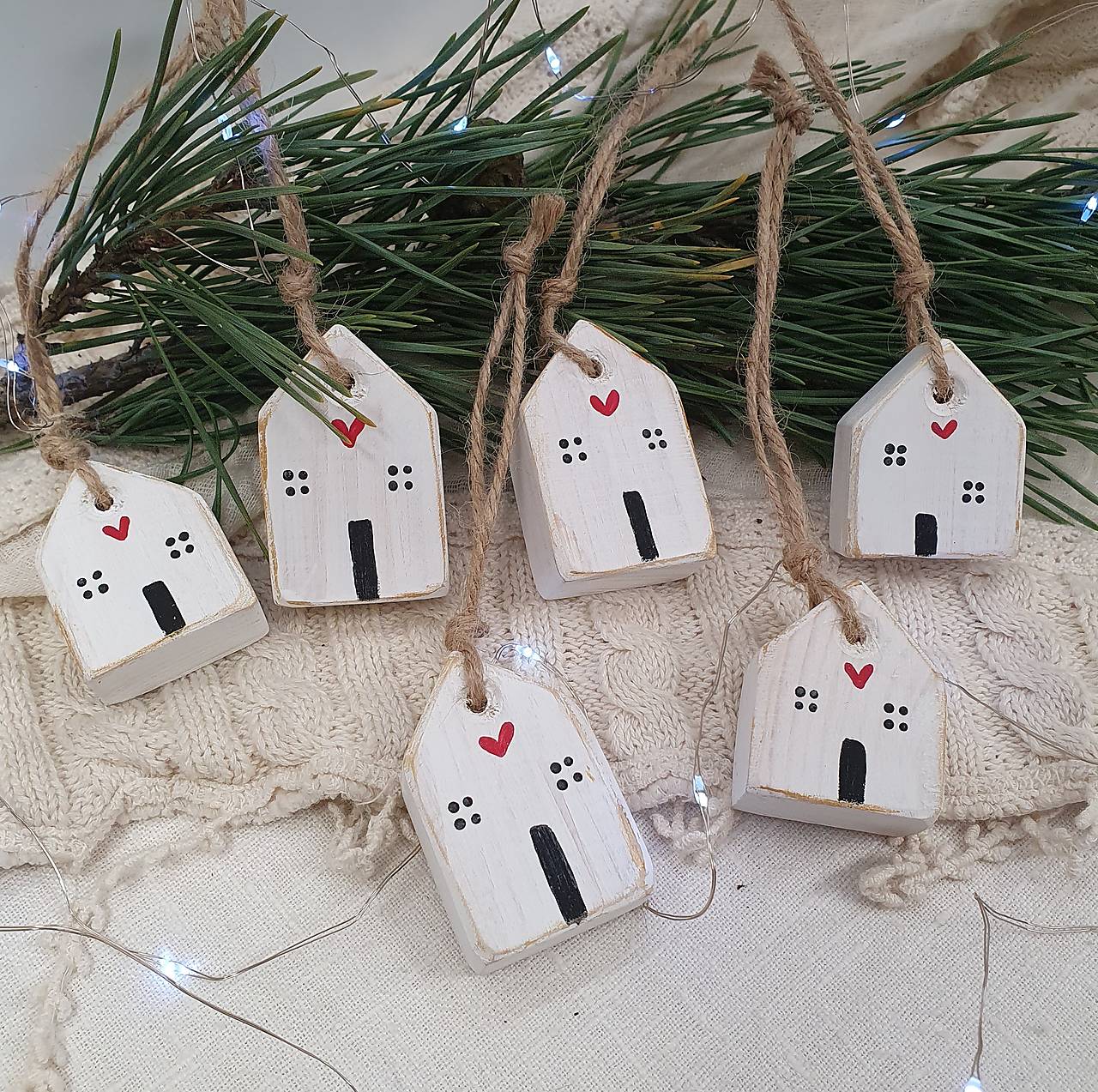 Domčeky sú zavesené na prírodnom špagáte, čo im dodáva rustikálny vzhľad. Sú perfektné ako vianočné ozdoby alebo celoročné dekorácie pre váš interiér. Každý domček je jedinečný a prináša kúsok tepla a originality do každého priestoru.