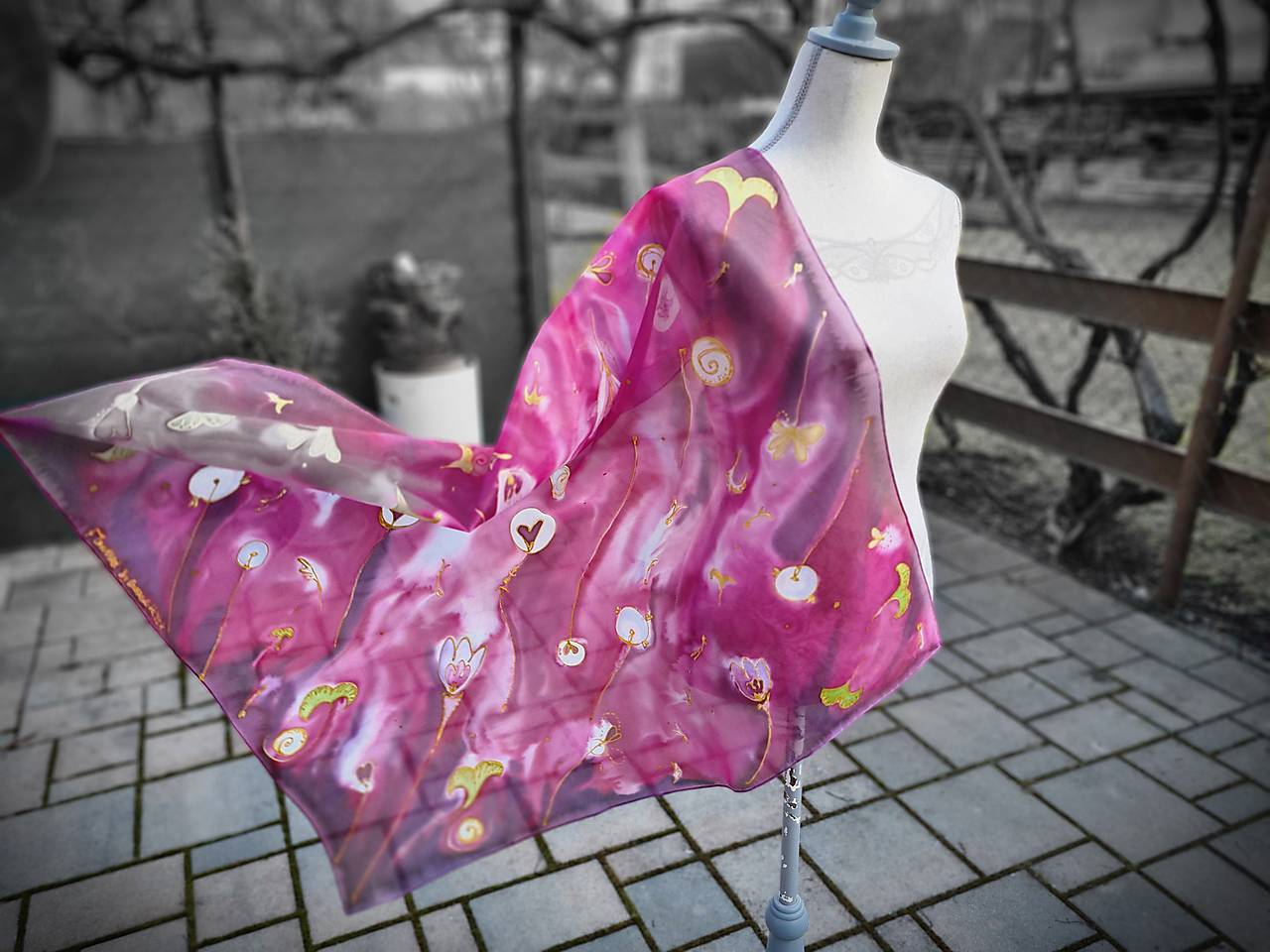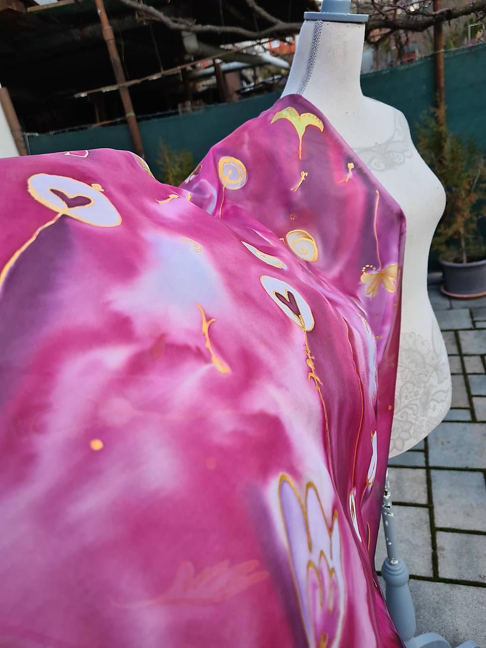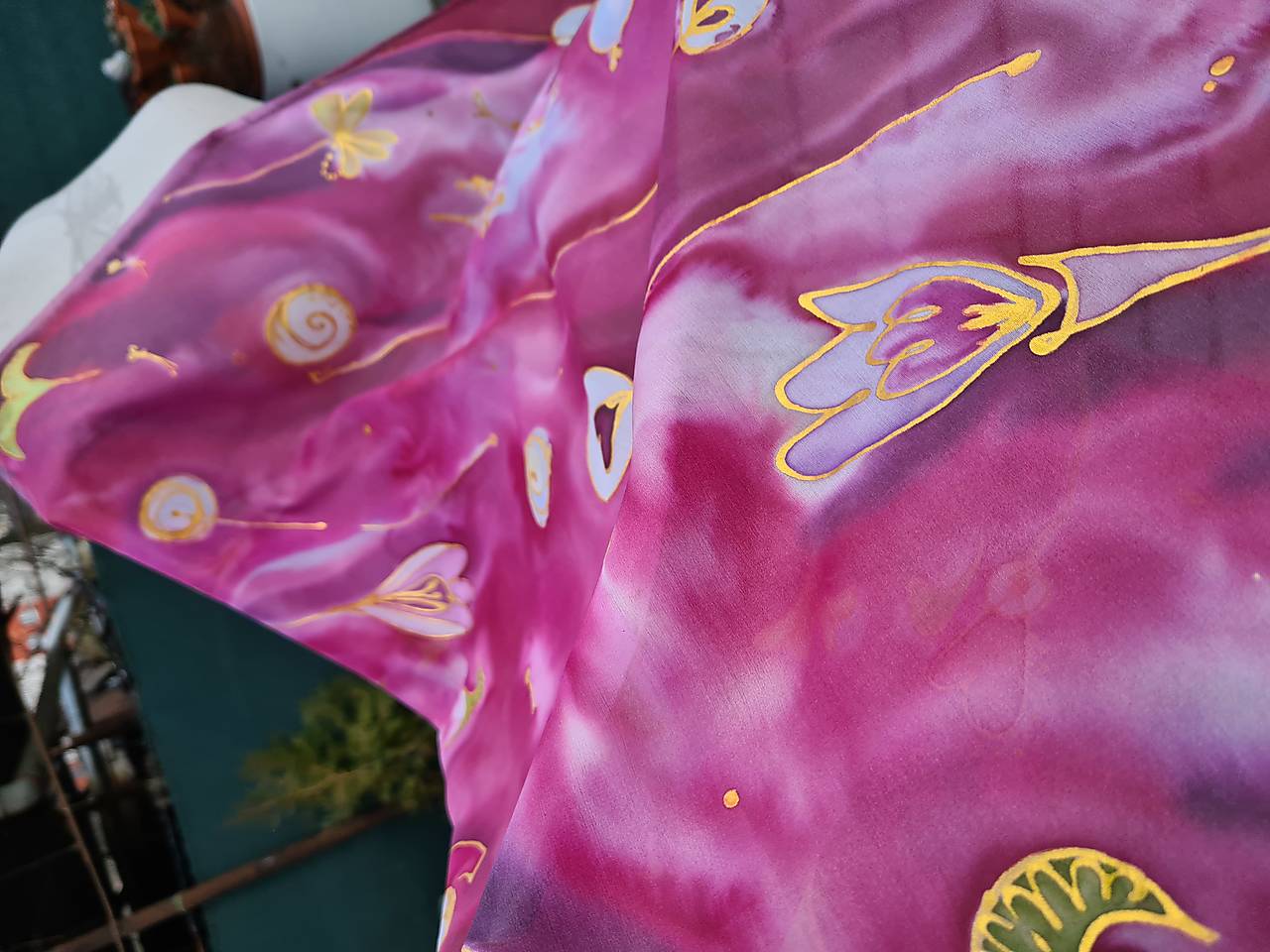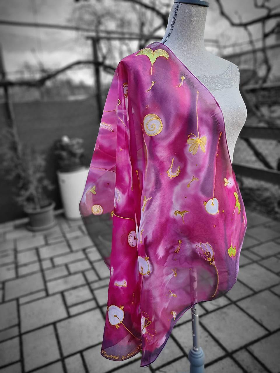 Šatka je zo 100 % prírodného hodvábu v kvalite pongé 5. Tento materiál je vhodný aj do chladnejšieho počasia alebo na celodenné nosenie.