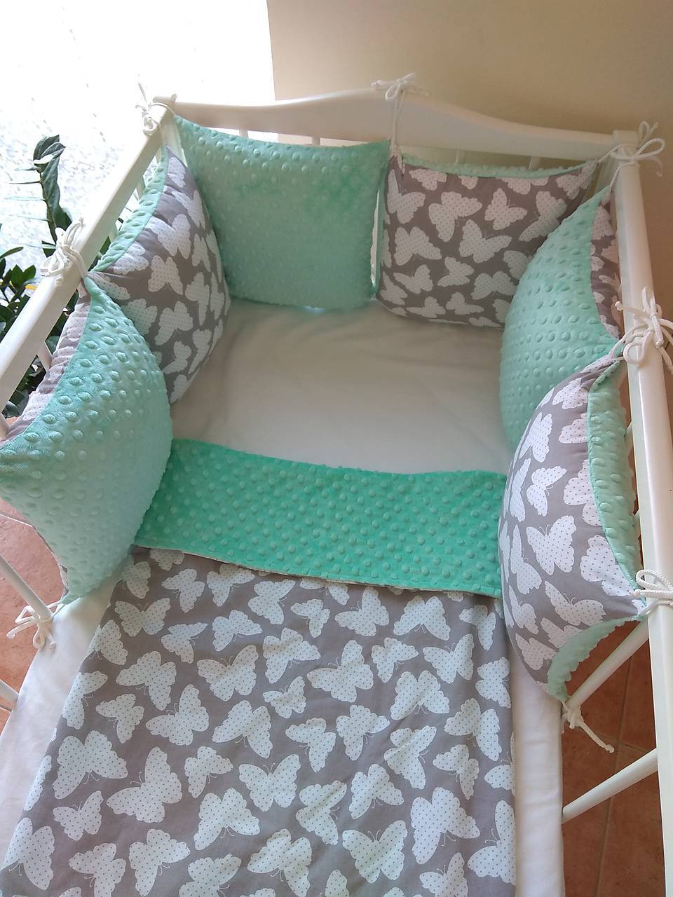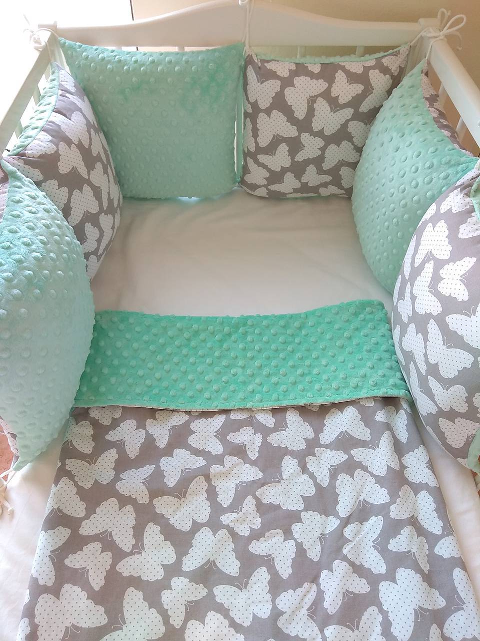 Krásny unisex setík do postieľky, ktorý sa skladá z vankúšikového mantinelu a deky. Vankúšiky majú rozmer 30*30cm, takže sú vhodné do postieľky s rozmerom 120*60cm. Je ich 6ks. Vanúše sú naplnené antialergickýcm dutým vláknom. Dajú sa prať aj sušiť v sušičke. K nim patrí aj krásna letná deka bez výplne 90*70cm, v kombinácii minky vo farbe OPAL a bavlna s motýľmi. Minky je samozrejme originál z dielne výrobcu Shannon fabrics, žiadna lacná napodobenina. Všetky naše látočky majú certifikát nezávadnosti pre deti do troch rokov.